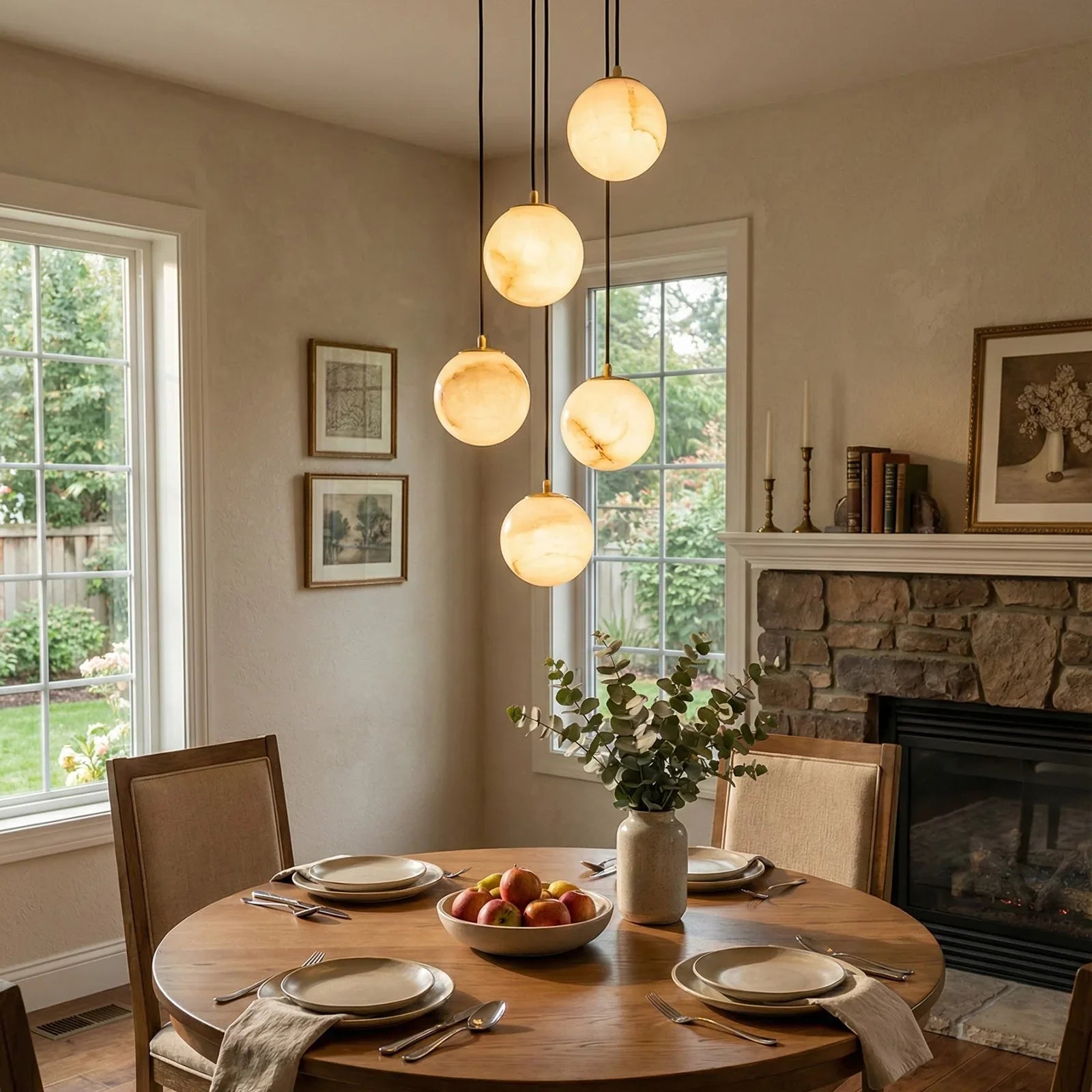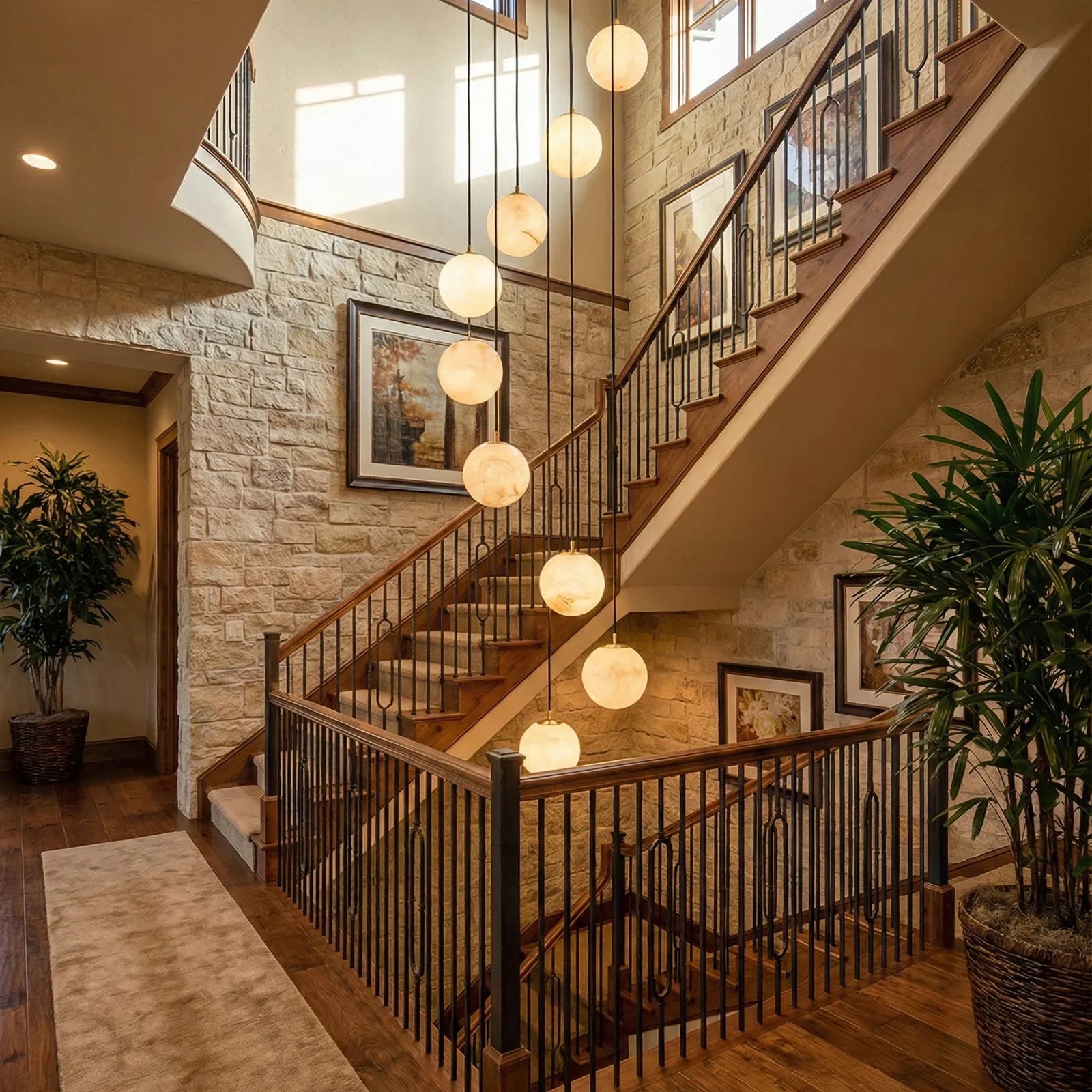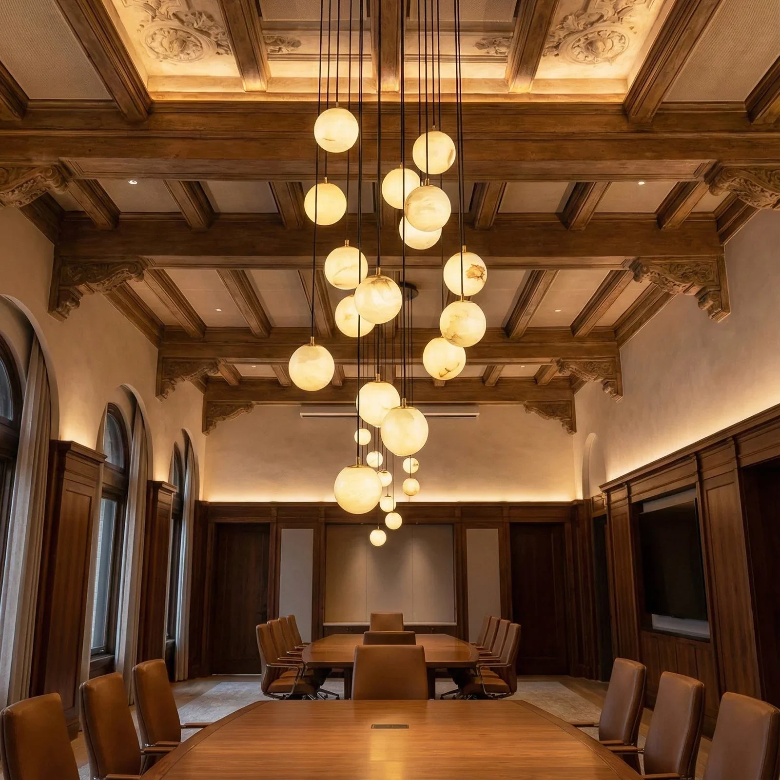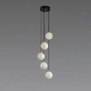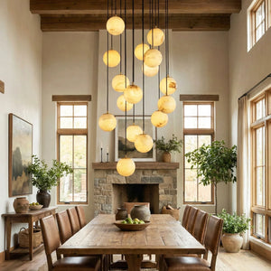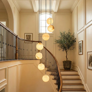 The chandelier consists of a series of luminous alabaster spheres suspended in a cascading structure from a circular ceiling plate. These spheres are arranged in a graceful, cascading pattern, resembling a cluster of stars. Each sphere is meticulously crafted from top-quality natural alabaster. The stone's natural translucent quality ensures that light is softly diffused in all directions, creating a refined and tranquil atmosphere.