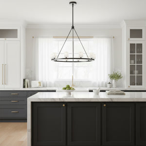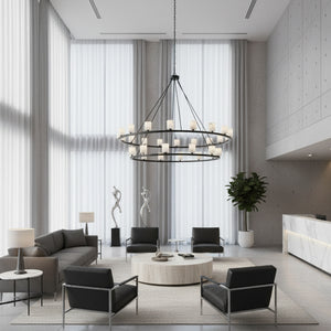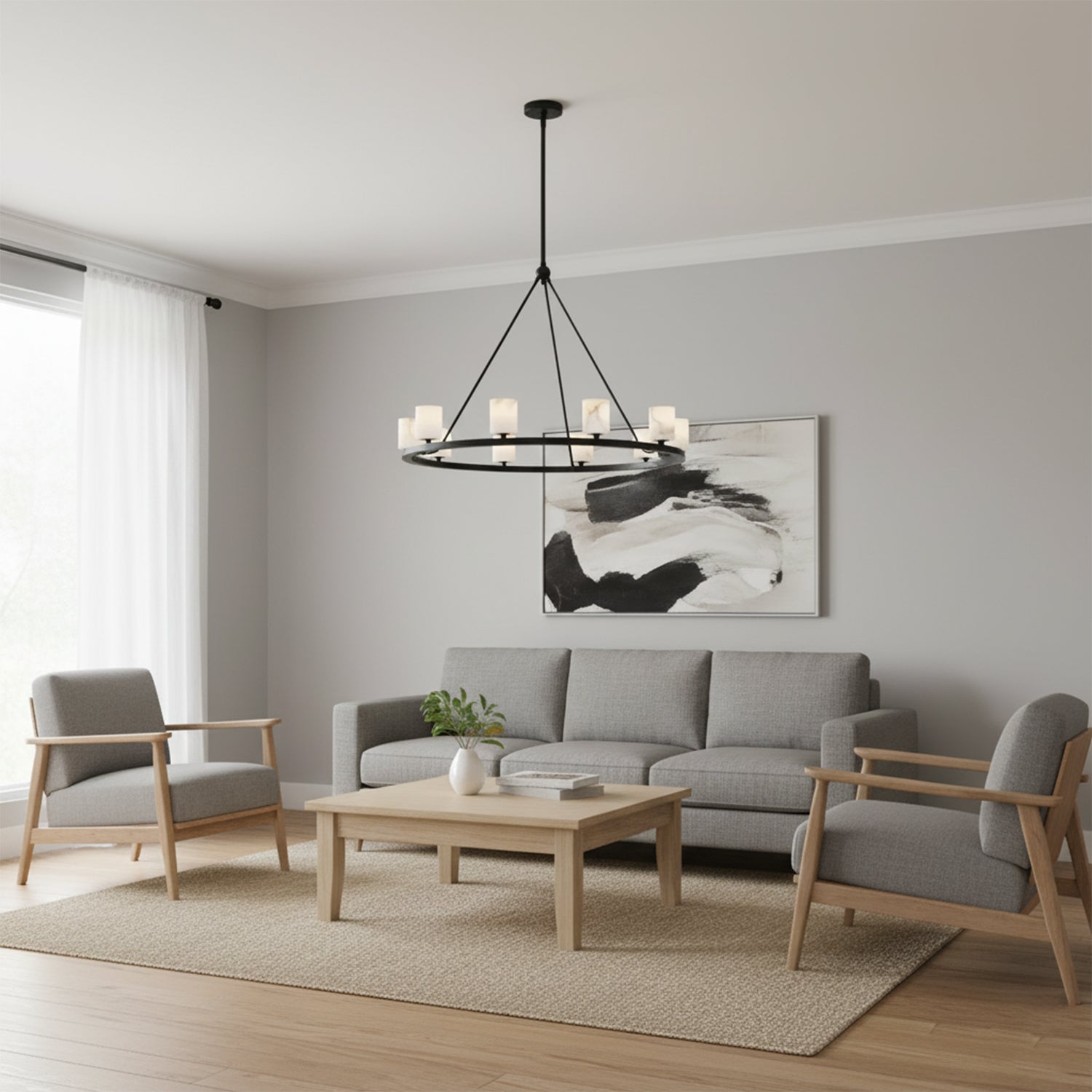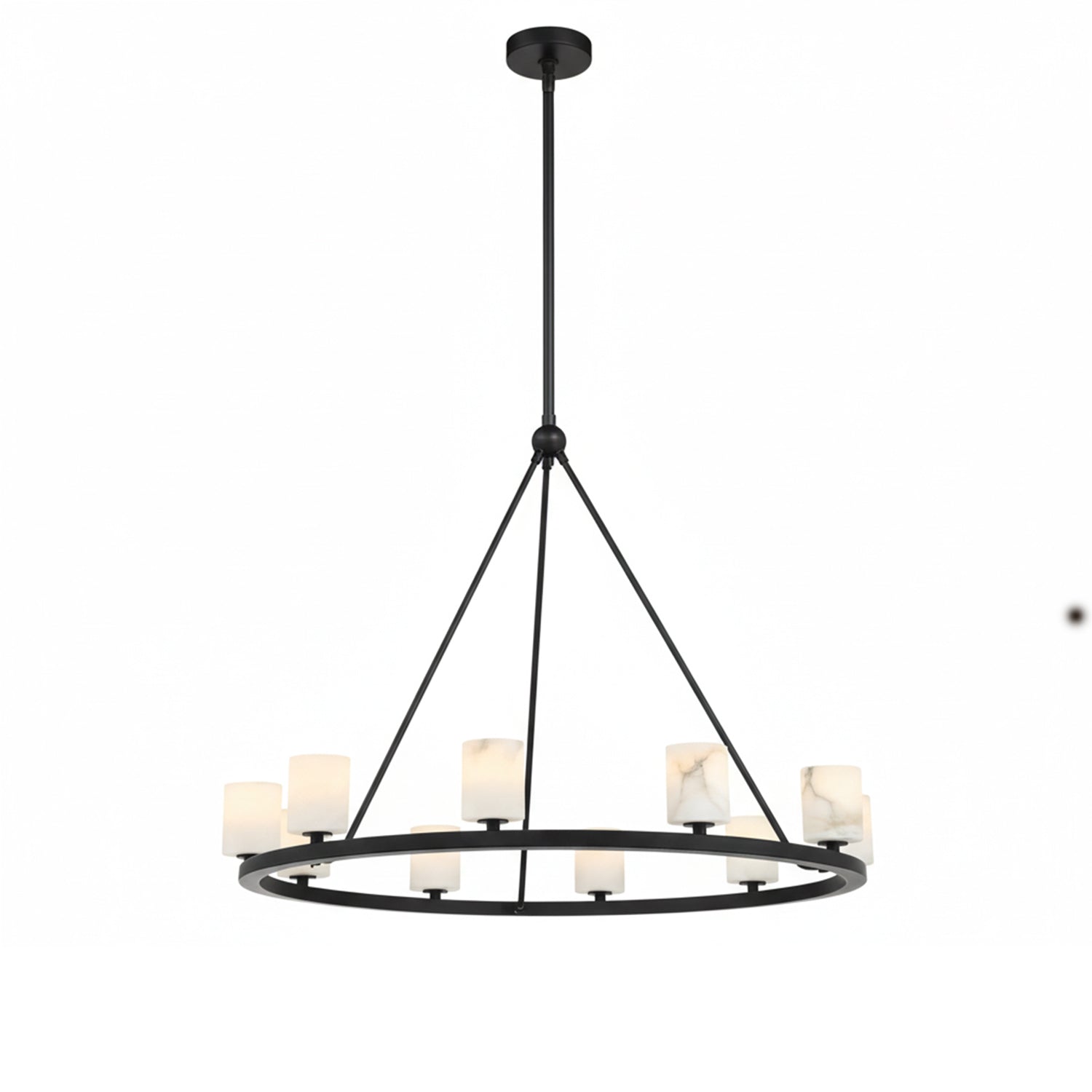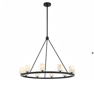 This impressive chandelier is a sleek, modern interpretation of the classic wagon-wheel silhouette, perfectly blending natural elements with architectural design. The fixture is characterized by a large, horizontal ring or hoop, suspended by thin downrods from a ceiling canopy, all finished in a striking Matte Black. Mounted to the ring are multiple vertical cylinder shades crafted from genuine alabaster stone. The dark, minimalist frame provides a clean structure that emphasizes the soft, unique veining and warm glow emitted by the translucent stone, creating a sophisticated and balanced lighting effect. It is a powerful statement piece, ideally suited for large dining rooms, living areas, or grand foyers.