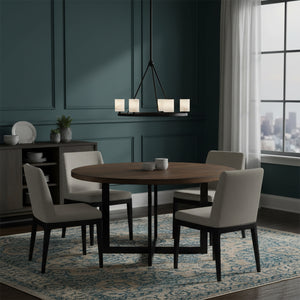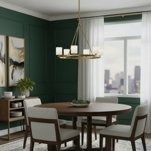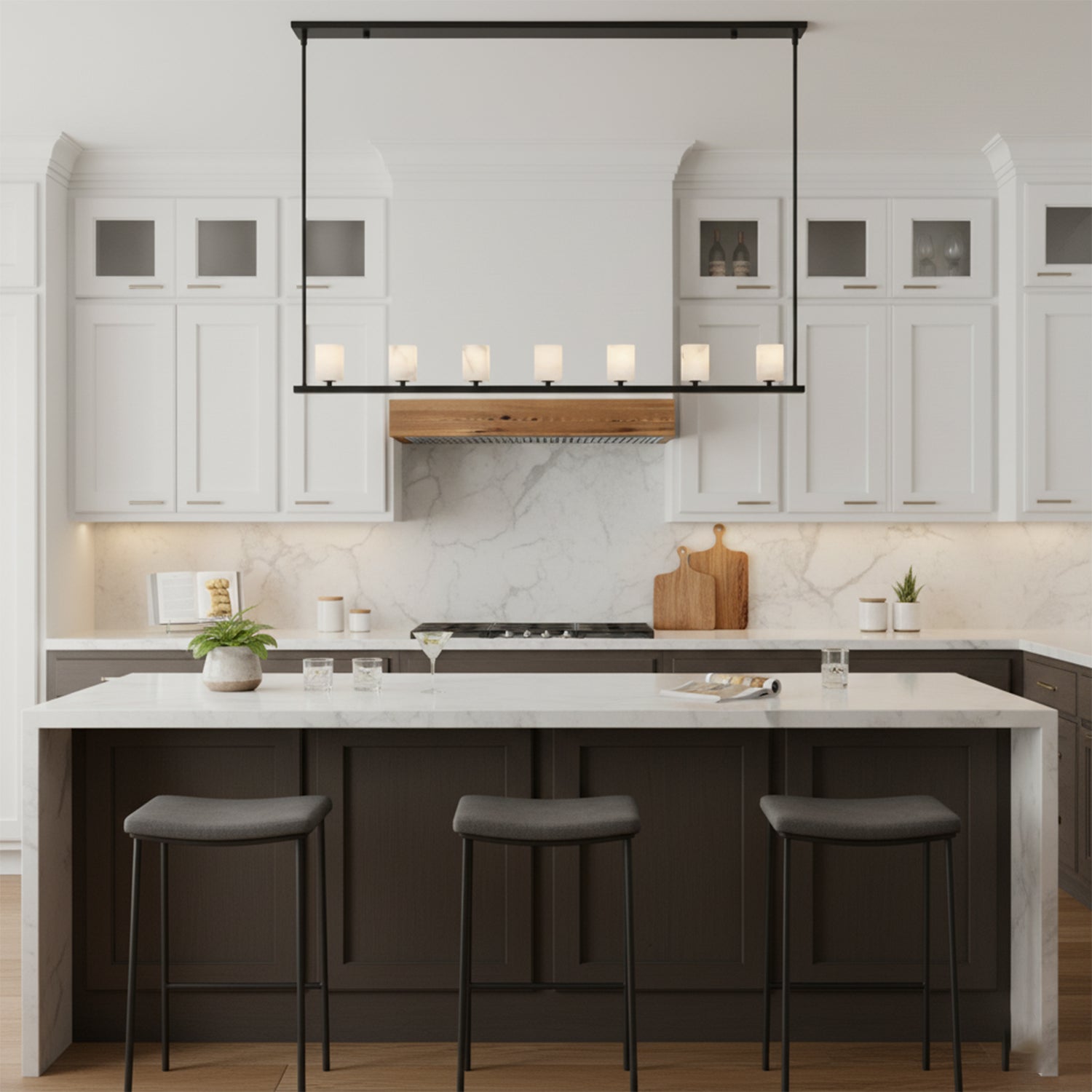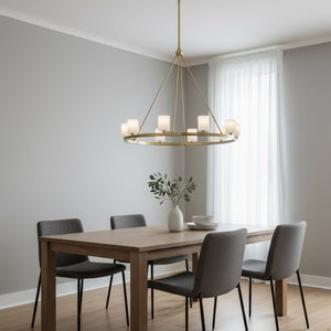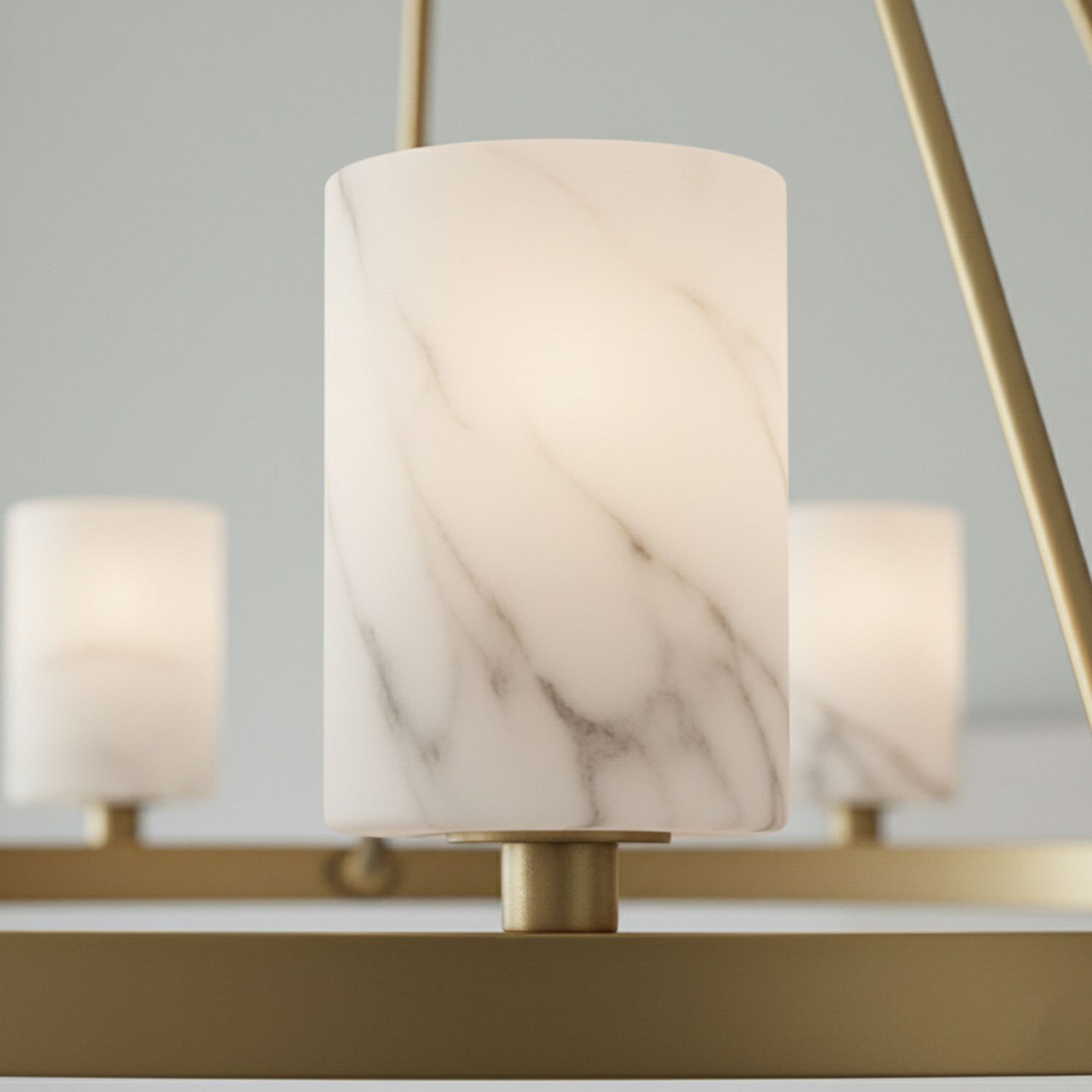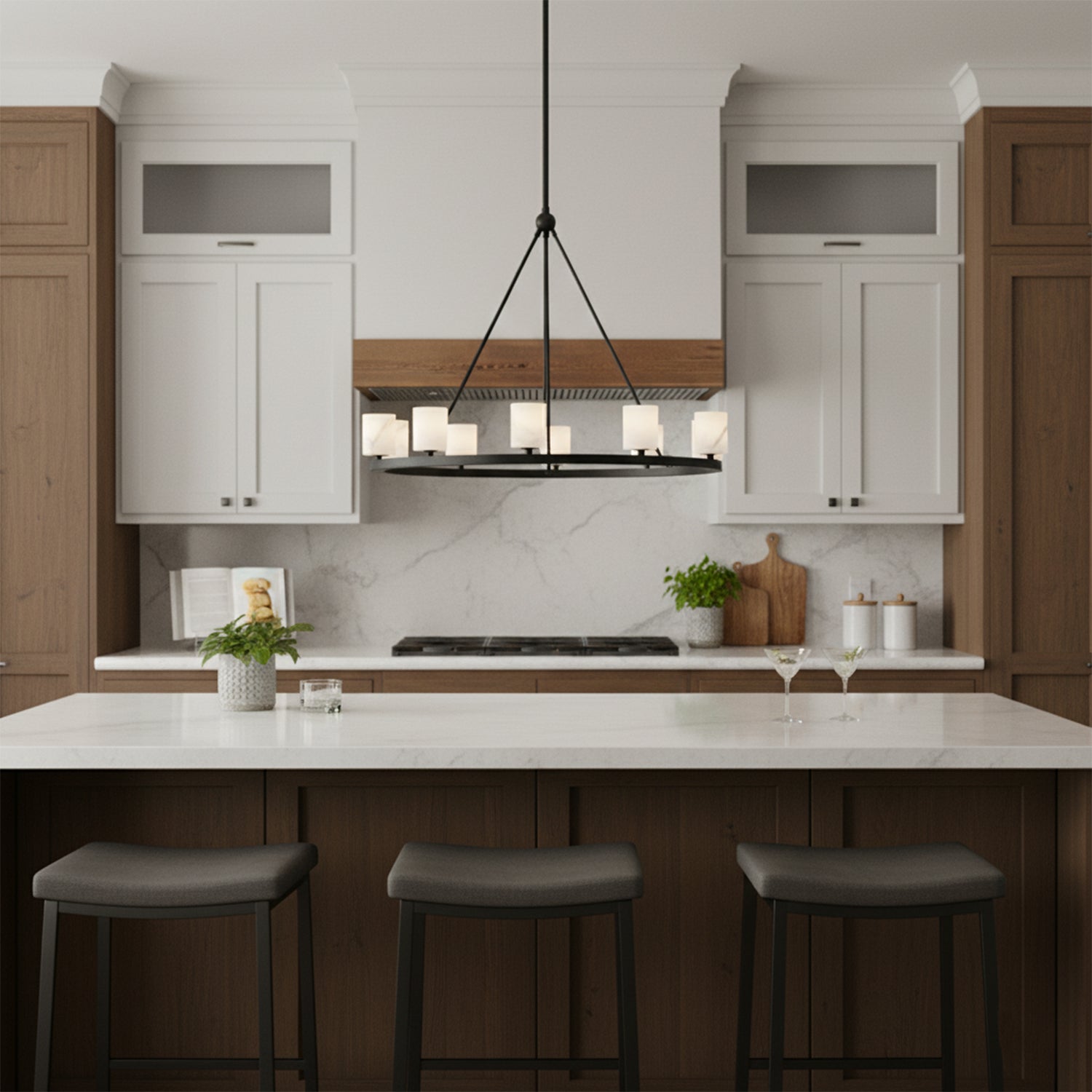 This impressive chandelier is a sleek, modern interpretation of the classic wagon-wheel silhouette, perfectly blending natural elements with architectural design. The fixture is characterized by a large, horizontal ring or hoop, suspended by thin downrods from a ceiling canopy, all finished in a striking Matte Black. Mounted to the ring are multiple vertical cylinder shades crafted from genuine alabaster stone. The dark, minimalist frame provides a clean structure that emphasizes the soft, unique veining and warm glow emitted by the translucent stone, creating a sophisticated and balanced lighting effect. It is a powerful statement piece, ideally suited for large dining rooms, living areas, or grand foyers.