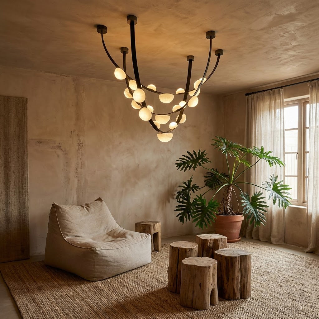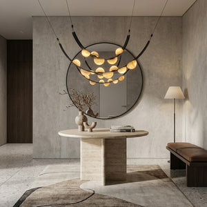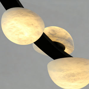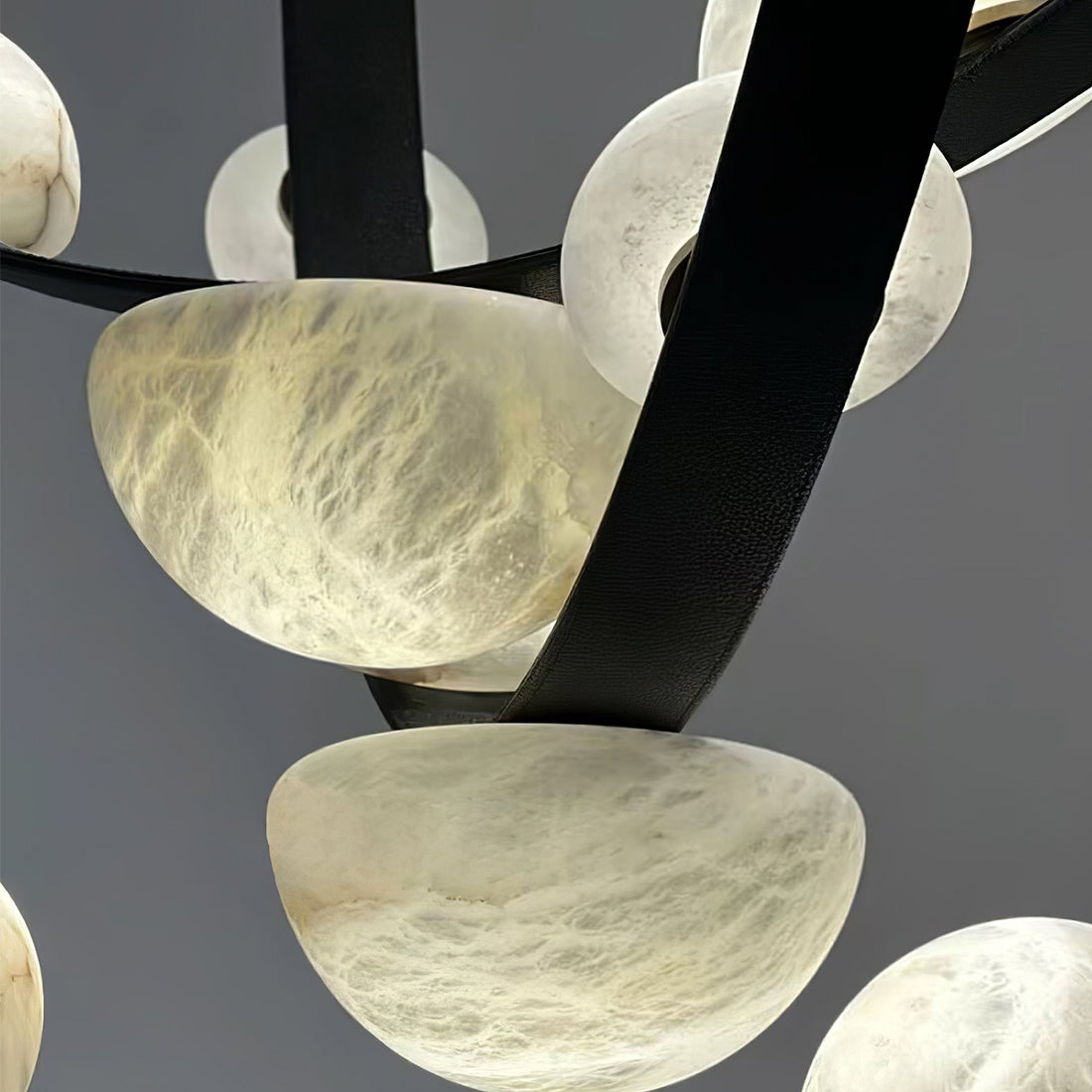 Nestled along the leather arcs, the alabaster shades introduce a gentle contrast in tone and texture. Their naturally translucent stone surfaces bring visual softness and depth, allowing the chandelier to balance bold structure with an understated, atmospheric presence defined by material interplay rather than ornament.