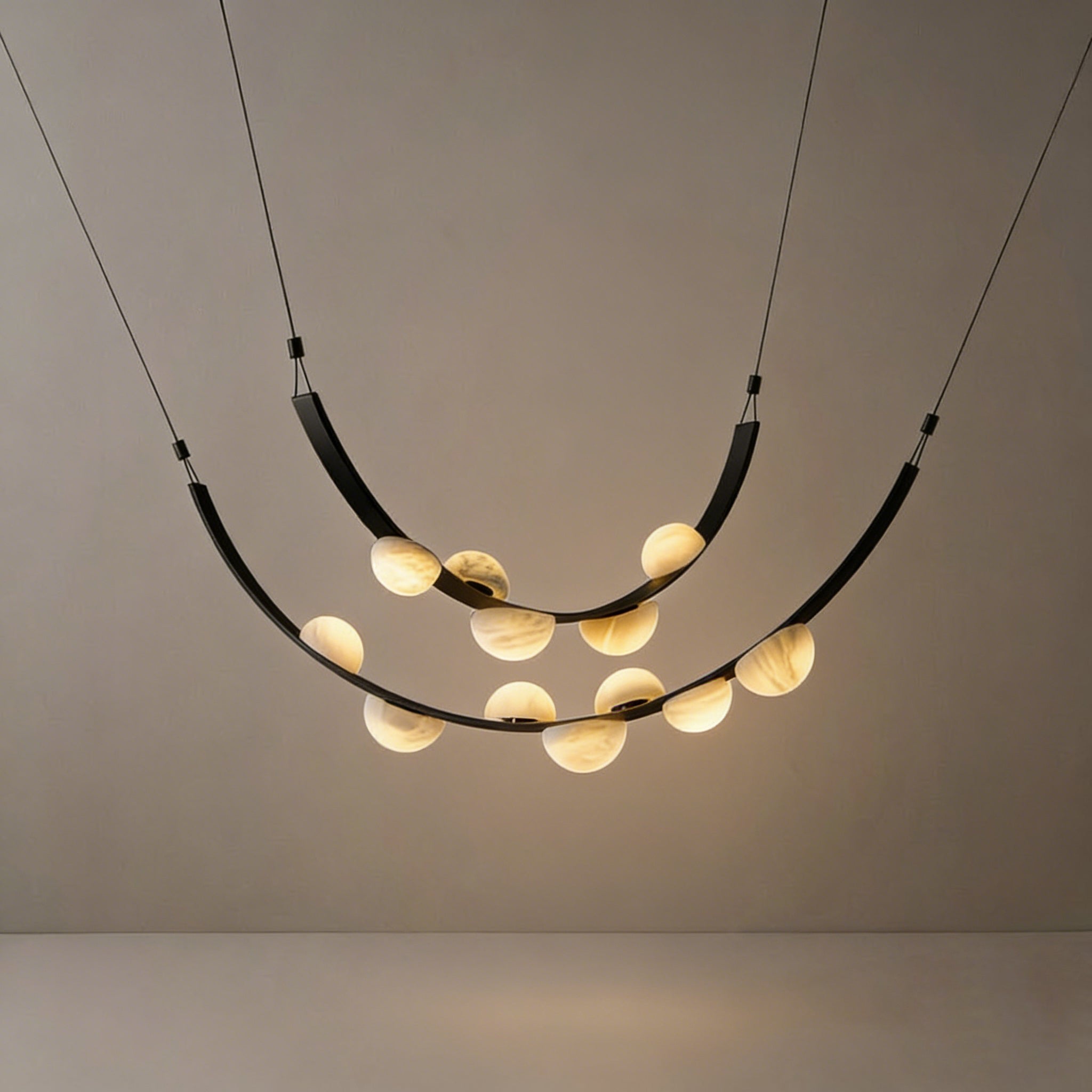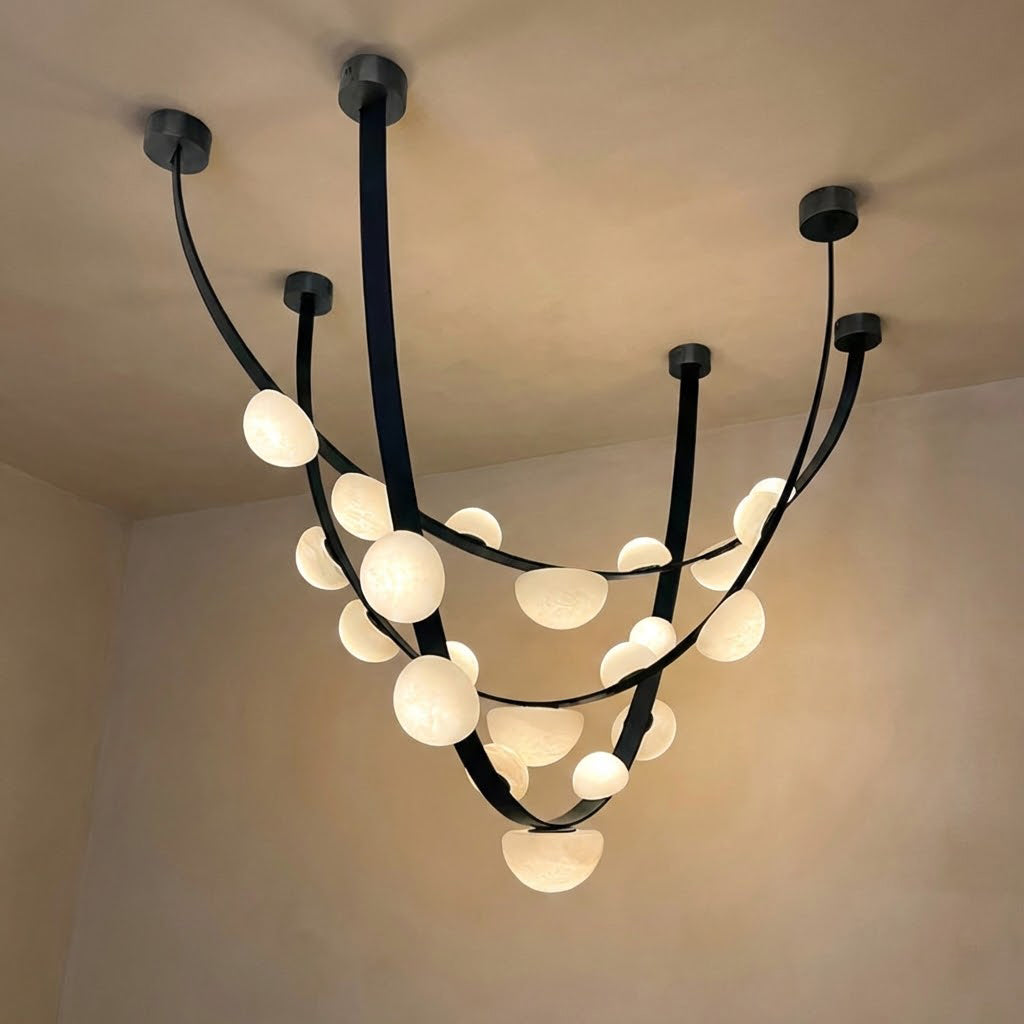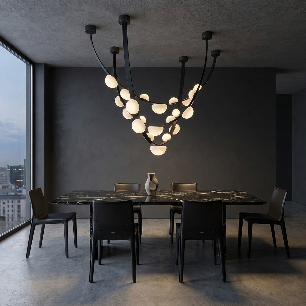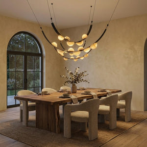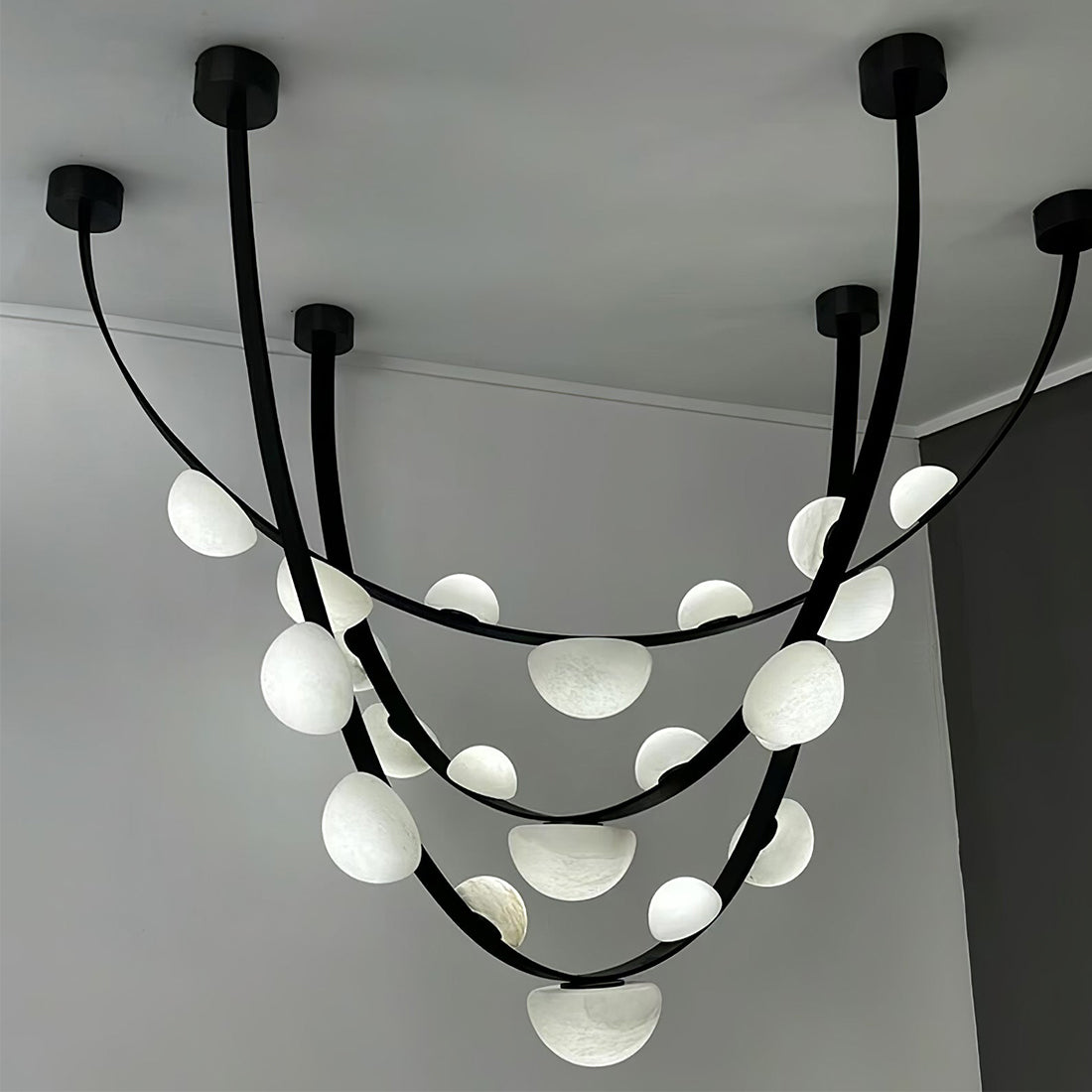 The Alabaster Arc Chandelier features flowing black leather arcs suspended from the ceiling, forming a layered, sculptural composition that feels both fluid and architectural. The soft curves create a sense of movement overhead, making it an expressive centerpiece for dining areas, double-height spaces, or refined living rooms.