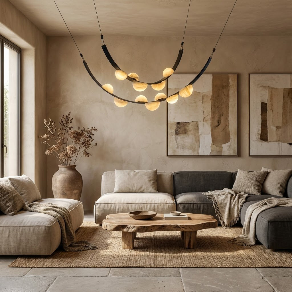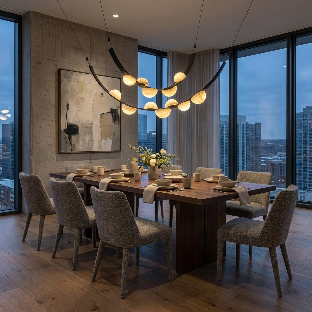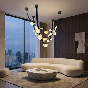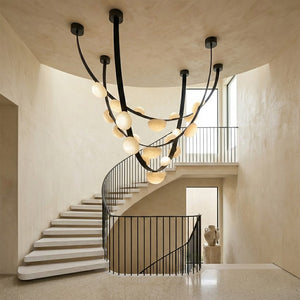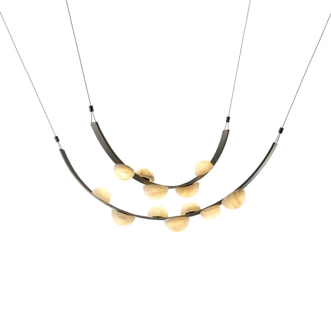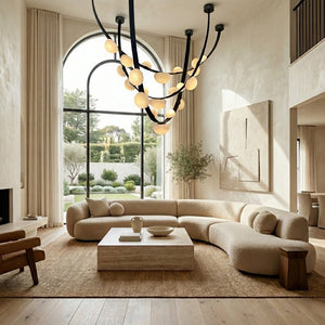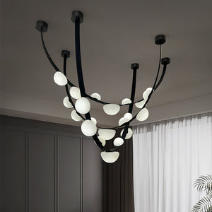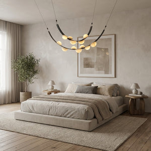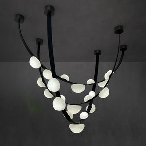 The Alabaster Arc Chandelier features flowing black leather arcs suspended from the ceiling, forming a layered, sculptural composition that feels both fluid and architectural. The soft curves create a sense of movement overhead, making it an expressive centerpiece for dining areas, double-height spaces, or refined living rooms.