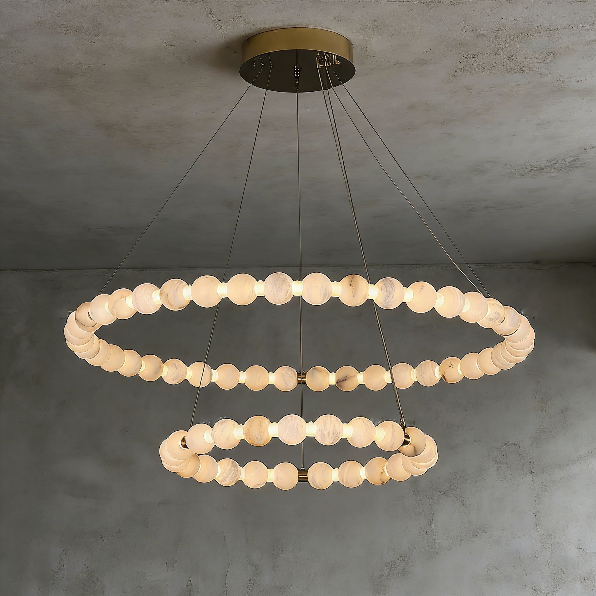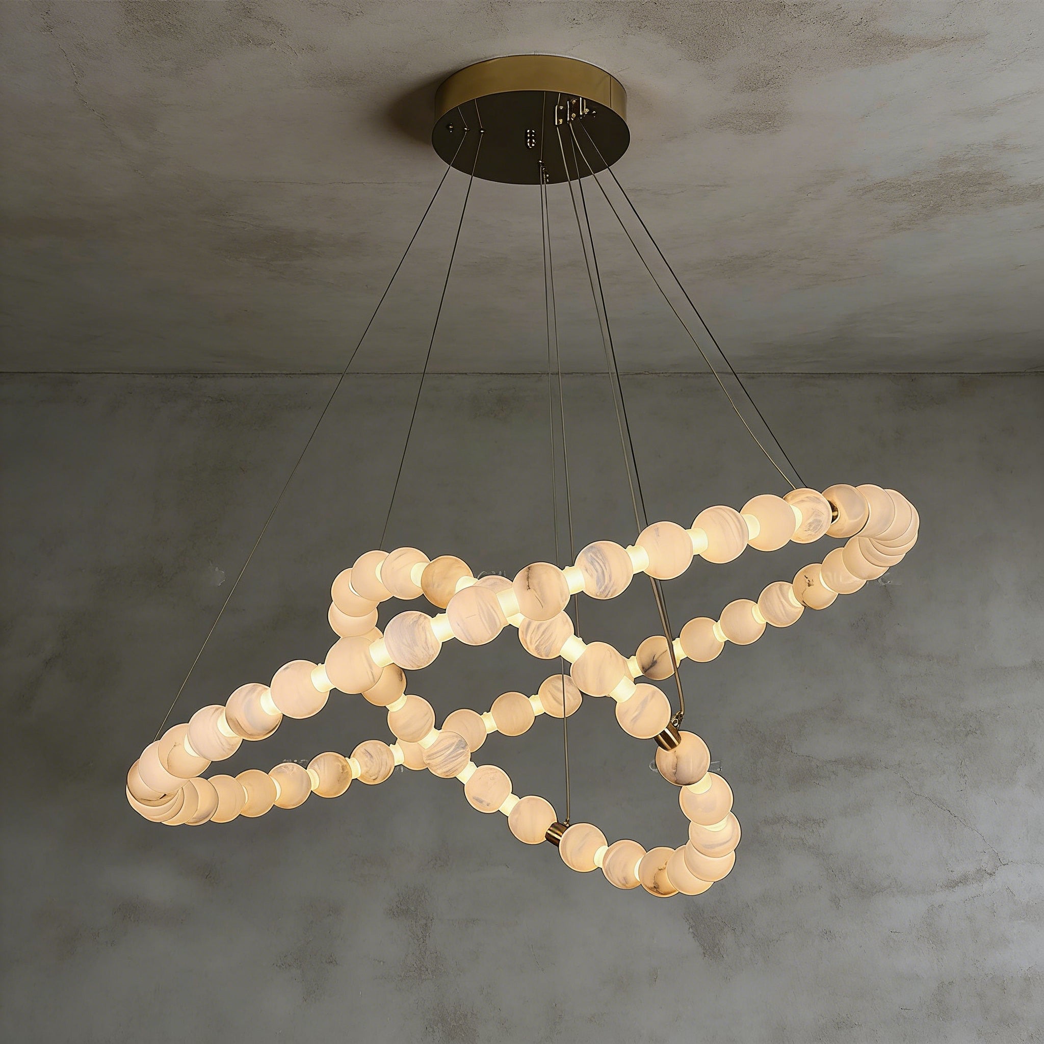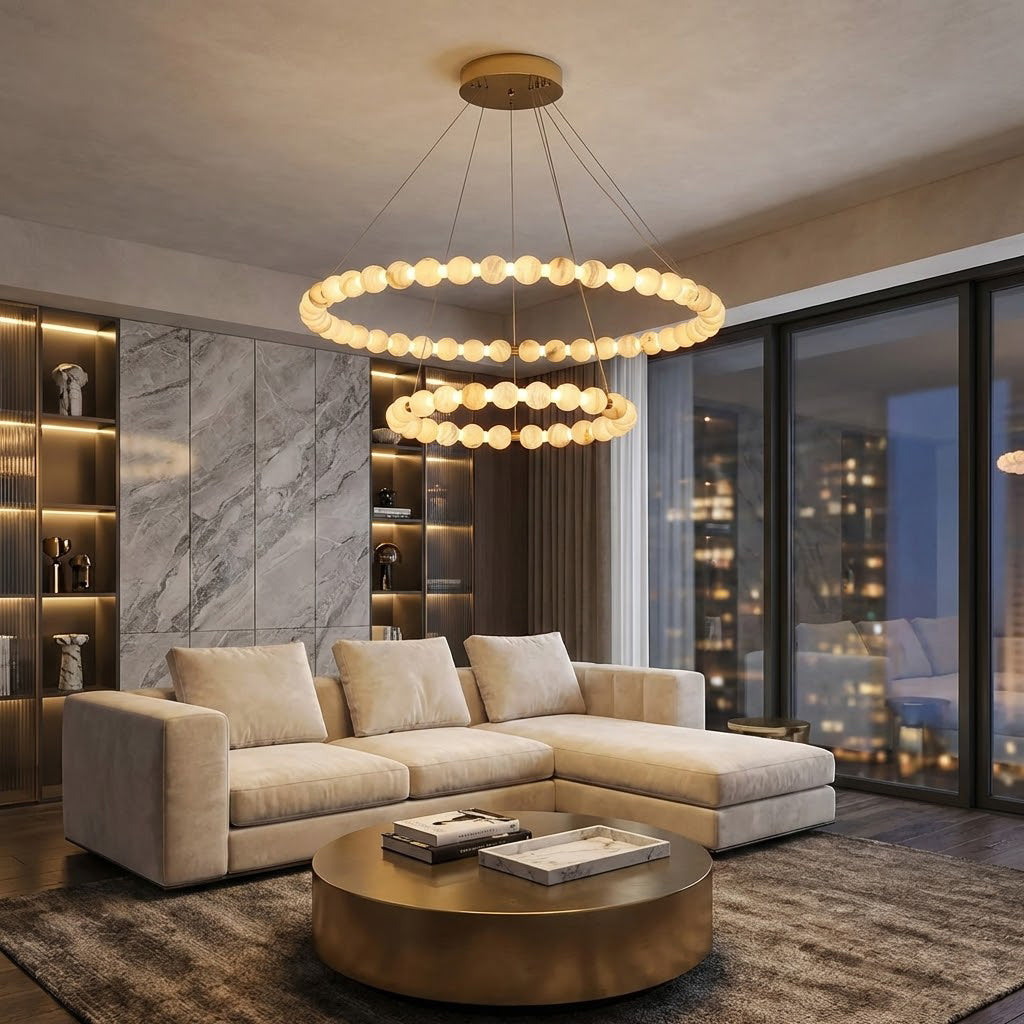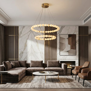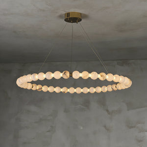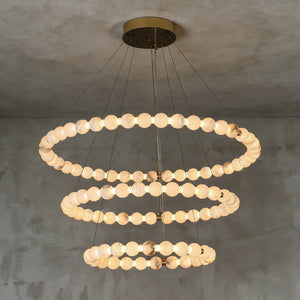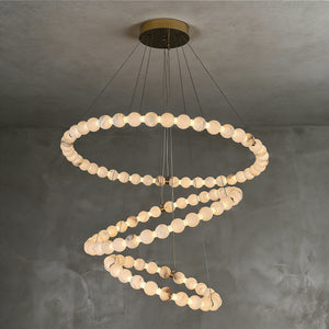 This Alabaster Beaded Ring Chandelier is a masterpiece of organic elegance, defined by its stunning sequence of hand-polished alabaster spheres that form luminous geometric rings. Each orb showcases the unique, ethereal veining inherent to natural stone, ensuring that no two fixtures are exactly alike. When illuminated, the alabaster diffuses a soft, warm glow that highlights its translucent beauty, creating an atmosphere of refined serenity.