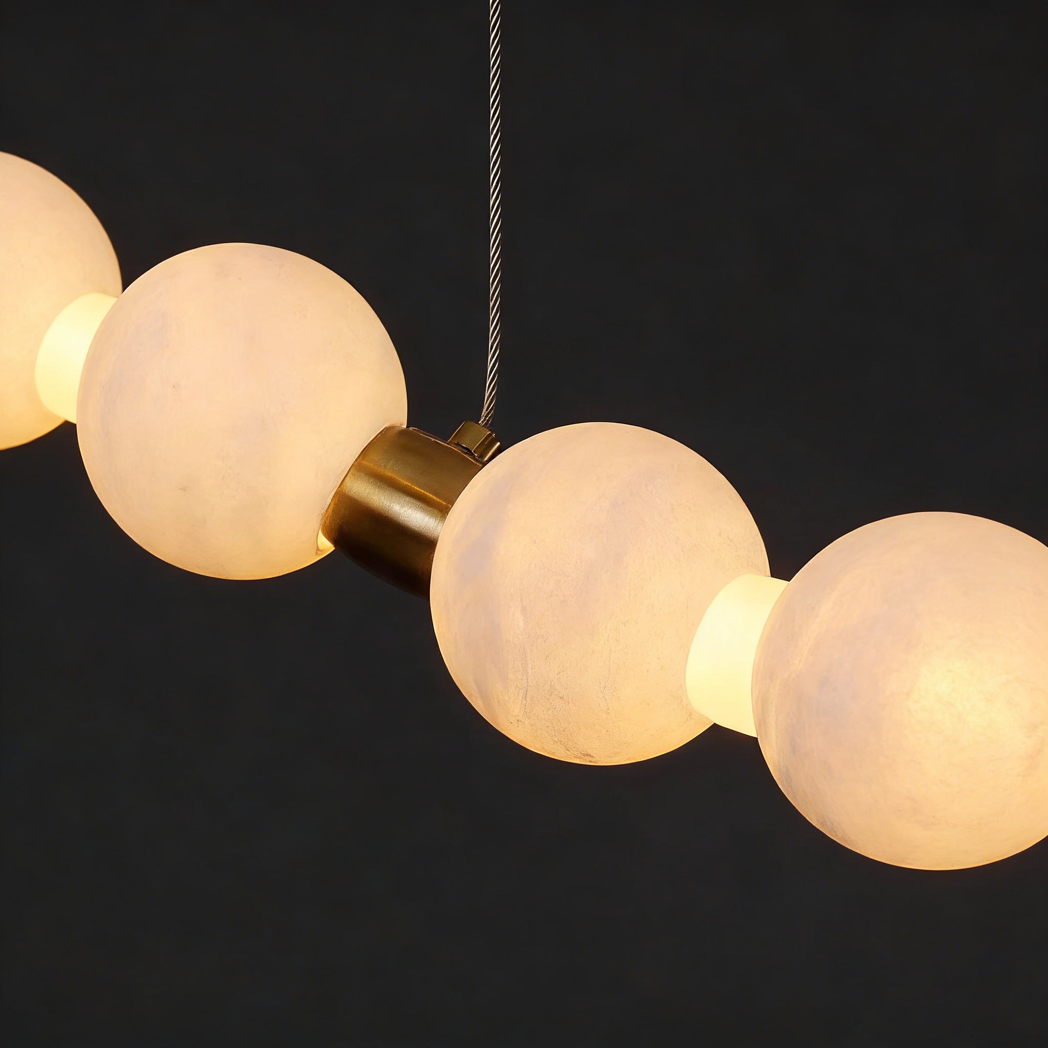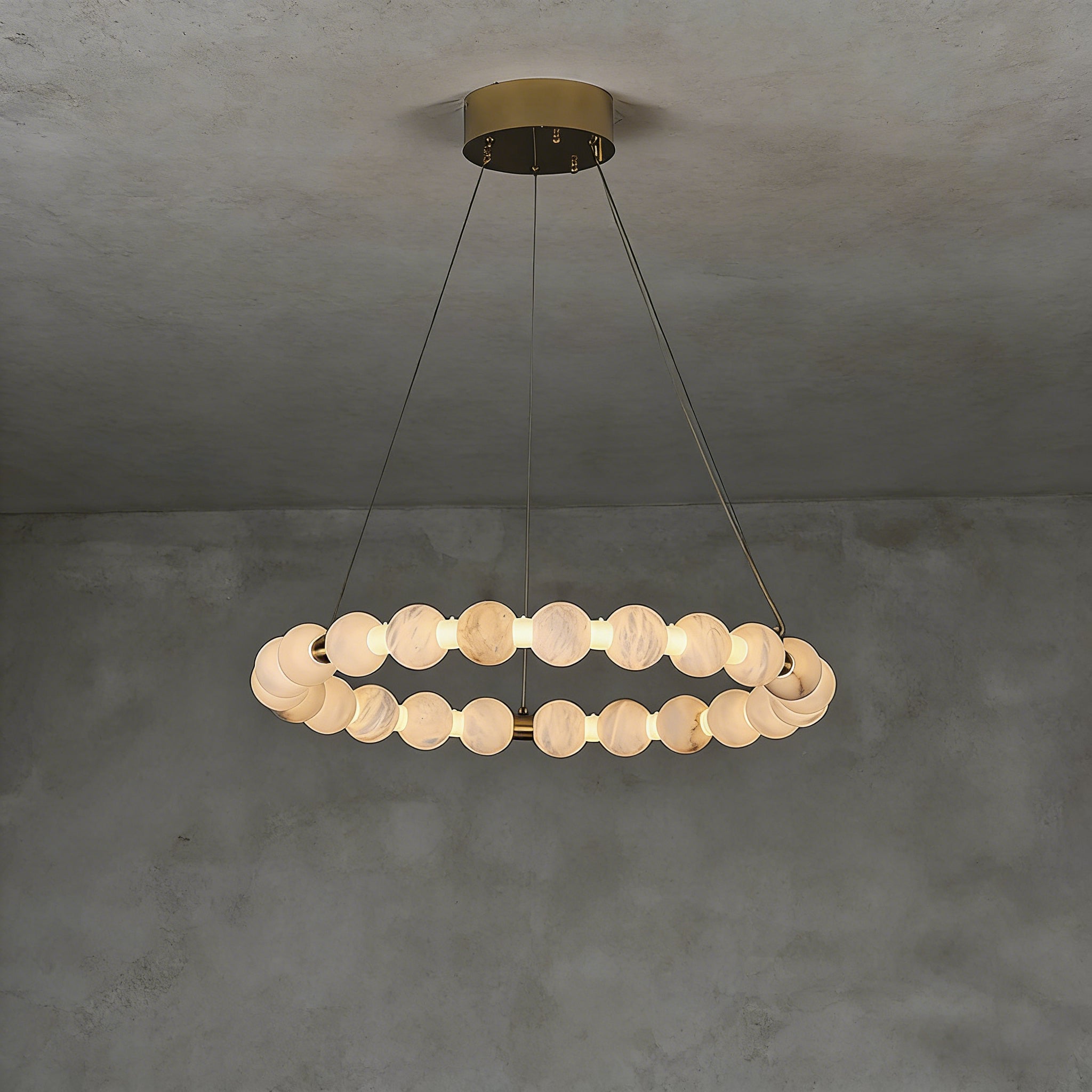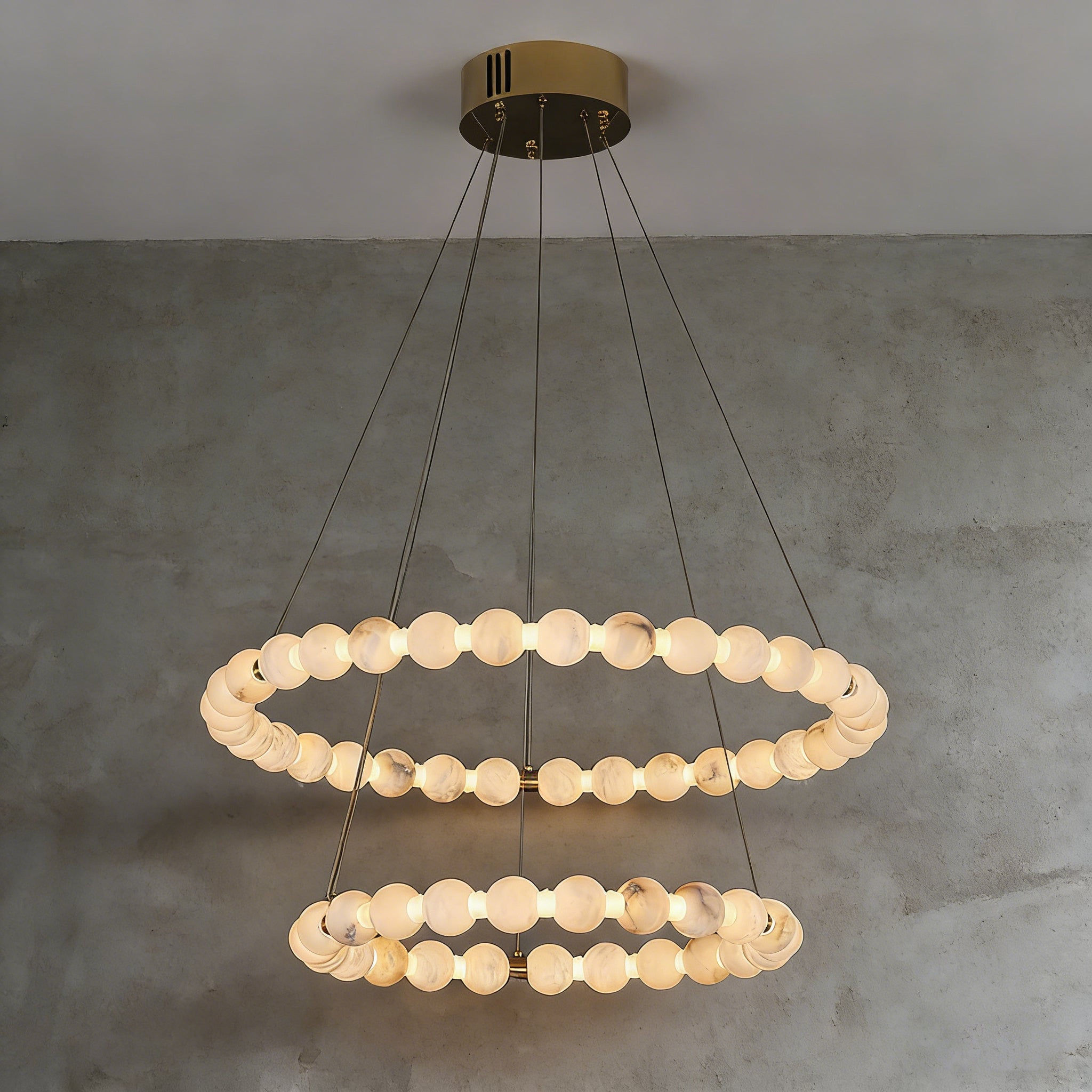 This Alabaster Beaded Ring Chandelier is a masterpiece of organic elegance, defined by its stunning sequence of hand-polished alabaster spheres that form luminous geometric rings. Each orb showcases the unique, ethereal veining inherent to natural stone, ensuring that no two fixtures are exactly alike. When illuminated, the alabaster diffuses a soft, warm glow that highlights its translucent beauty, creating an atmosphere of refined serenity.