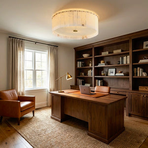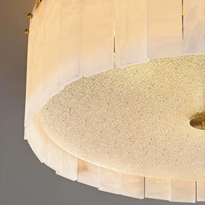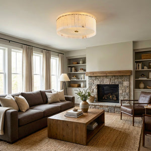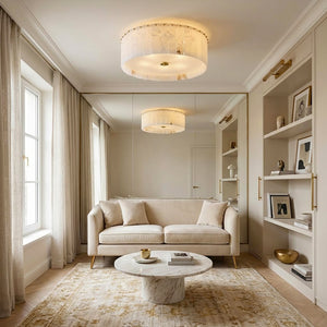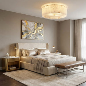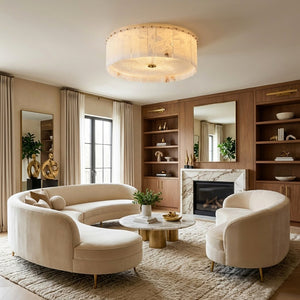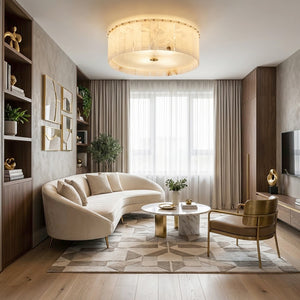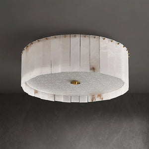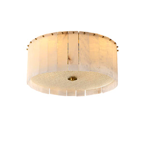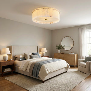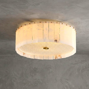 The Alabaster Disc Flush Mount Ceiling Light features a refined circular composition formed by vertically arranged natural alabaster panels that gently diffuse light while showcasing subtle organic veining unique to each piece. A softly textured inner diffuser enhances the warm, even glow, creating a calm ambient atmosphere without visual glare. Its low-profile silhouette keeps the ceiling line clean and uncluttered, making it especially well suited for bedrooms, hallways, and modern living spaces where understated elegance, natural materiality, and balanced illumination are desired.