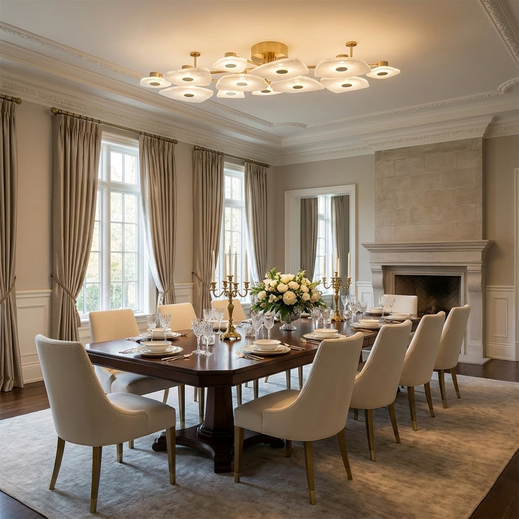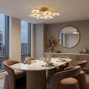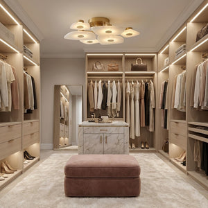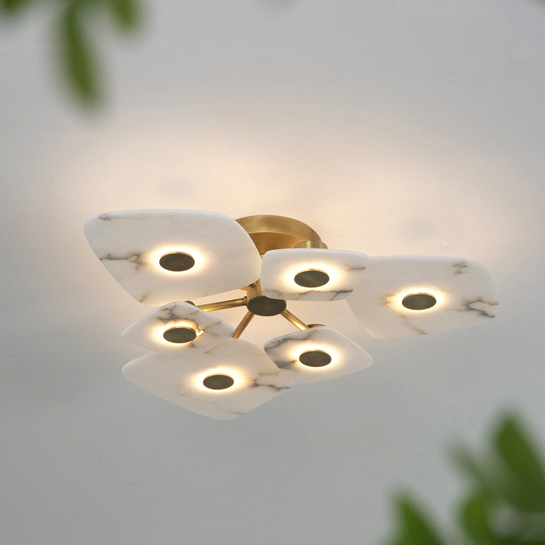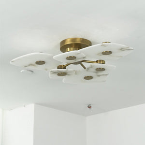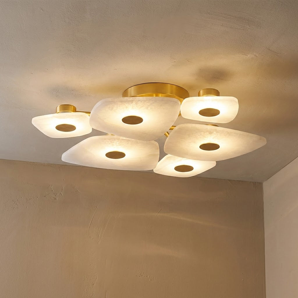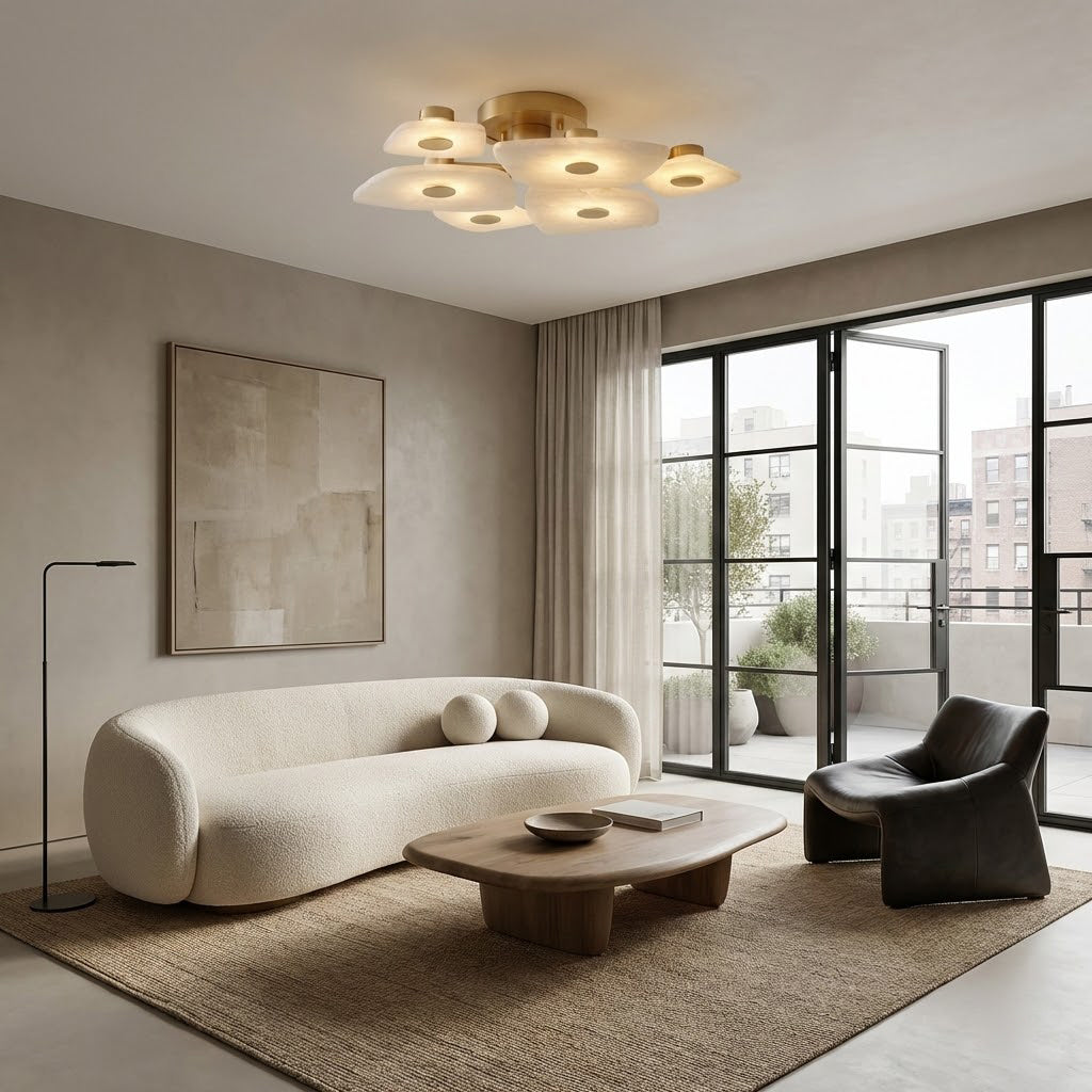 The Alabaster Petal Ceiling Light is shaped by overlapping, petal-inspired alabaster forms that create a gentle, sculptural profile close to the ceiling. Its balanced proportions make it ideal for bedrooms, corridors, and living areas where a refined yet unobtrusive statement is desired.