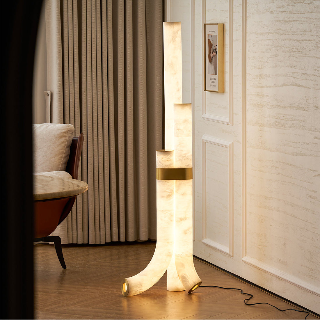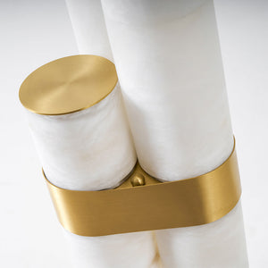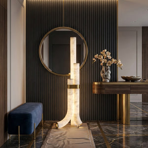 Formed from natural alabaster, the cylindrical body reveals subtle veining and translucency that soften the light as it passes through. The stone gently diffuses illumination to create a warm, ambient effect, enhancing the room through material richness and restrained elegance rather than decorative detail.