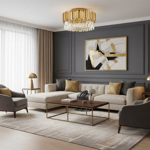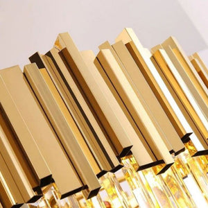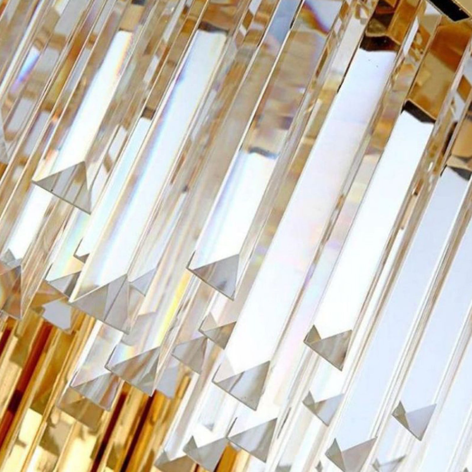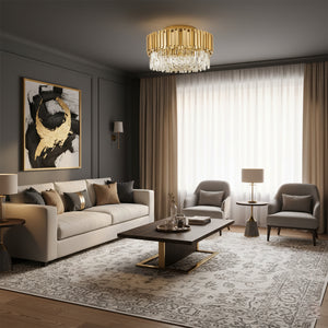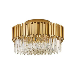 This stunning flush mount fixture is a dazzling statement piece, designed to bring high-end glamour and intense sparkle to spaces with lower ceilings. The chandelier features a rich, polished Gold Finish canopy and frame, arranged in a modern, multi-layered drum shape. The top tier is composed of vertical, gleaming metal rods, creating a smooth, reflective band. Below this, a dense cascade of clear, elongated crystal rods hangs down, catching and refracting the light to create a brilliant, glittering effect. This luxurious blend of warm metal and sharp crystal makes it a focal point ideal for a chic entryway, dressing room, or a contemporary dining room.