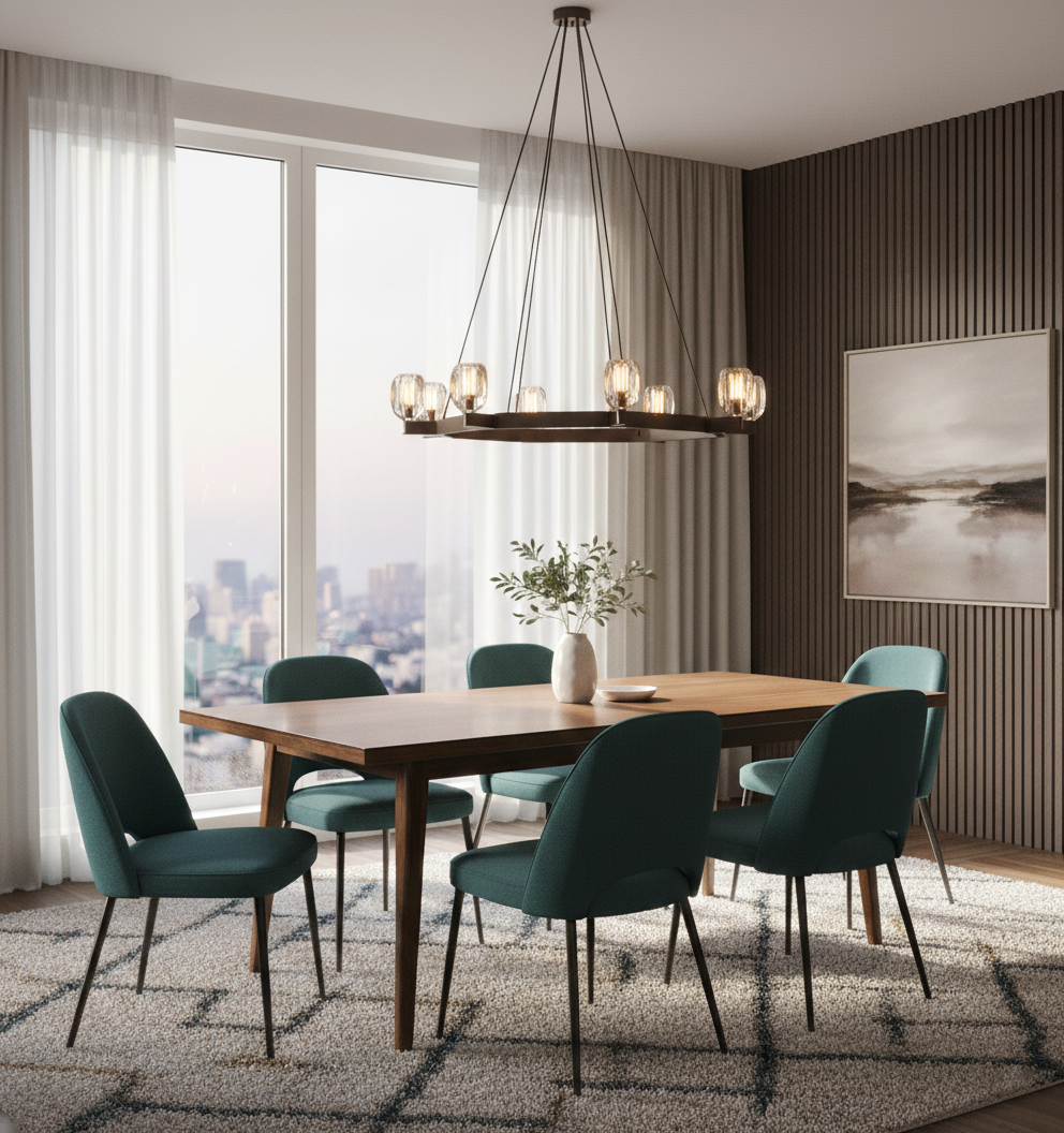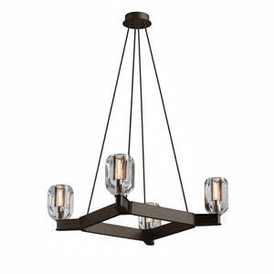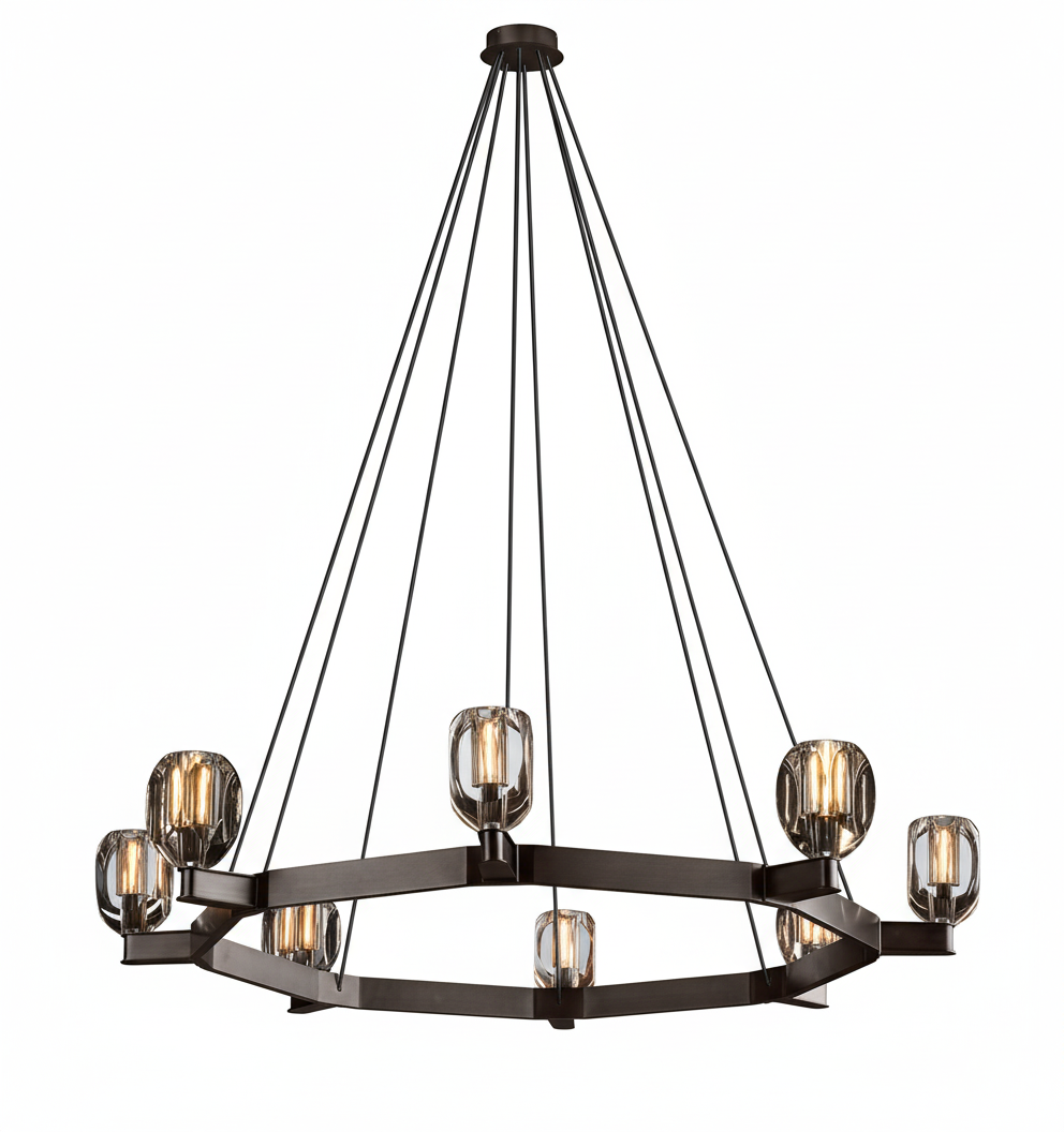 The chandelier features a sophisticated, gently curved metal frame in a rich. This dark frame is beautifully suspended and accented by contrasting lacquered brass hardware, lending a touch of mid-century modern luxury. The upward suspension is achieved via sleek, dark-toned cables, adding a linear, industrial element to the design.