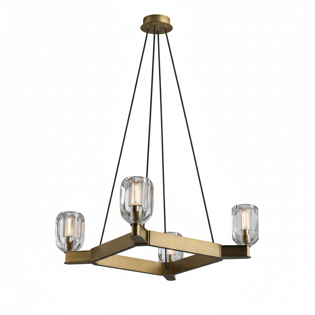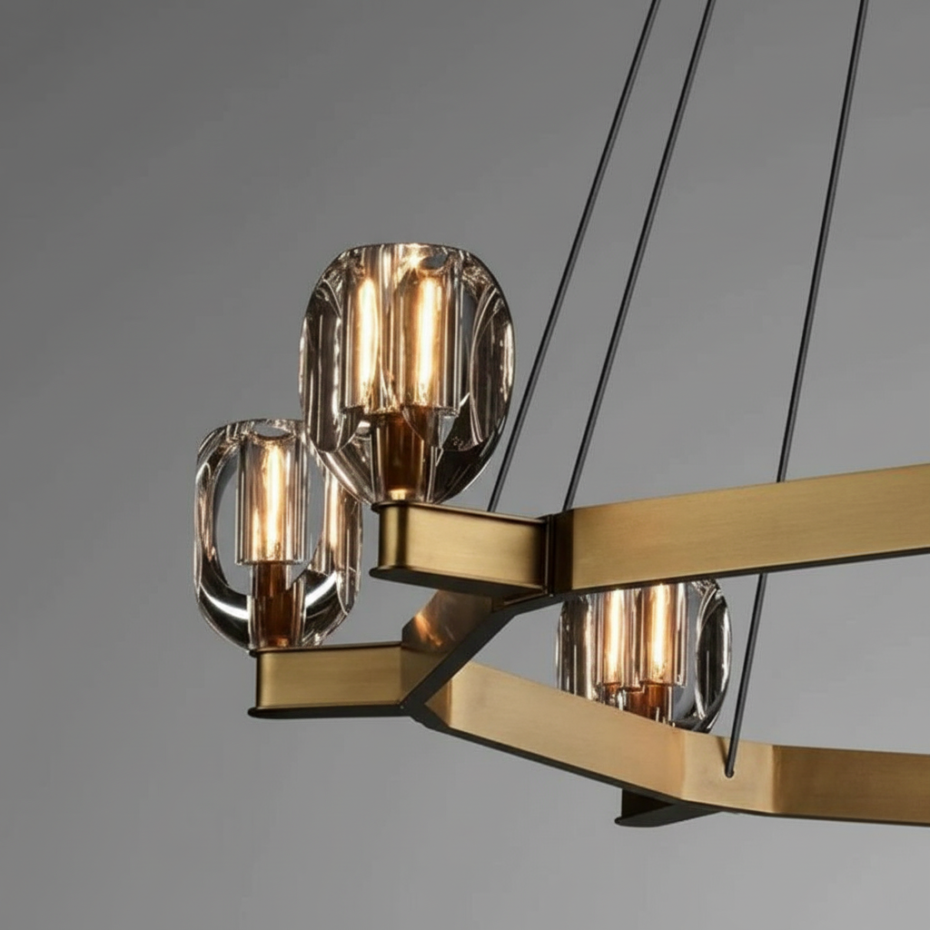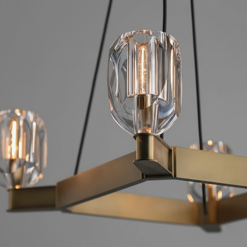 individual light sources are gracefully positioned along the frame, each capped with a distinctive, multi-faceted clear crystal or hand-cut glass shade. The balanced, arrangement ensures ample, evenly distributed illumination, making the Favola Chandelier by Hoailamps a perfect blend of artistic form and functional lighting.