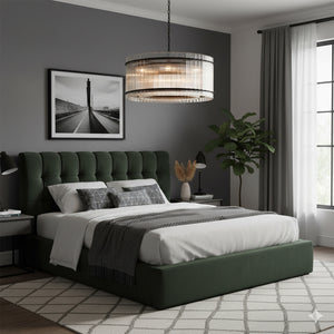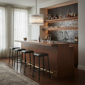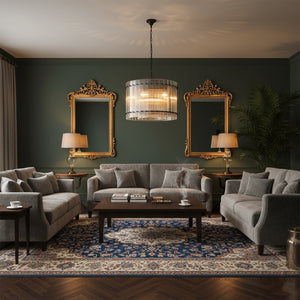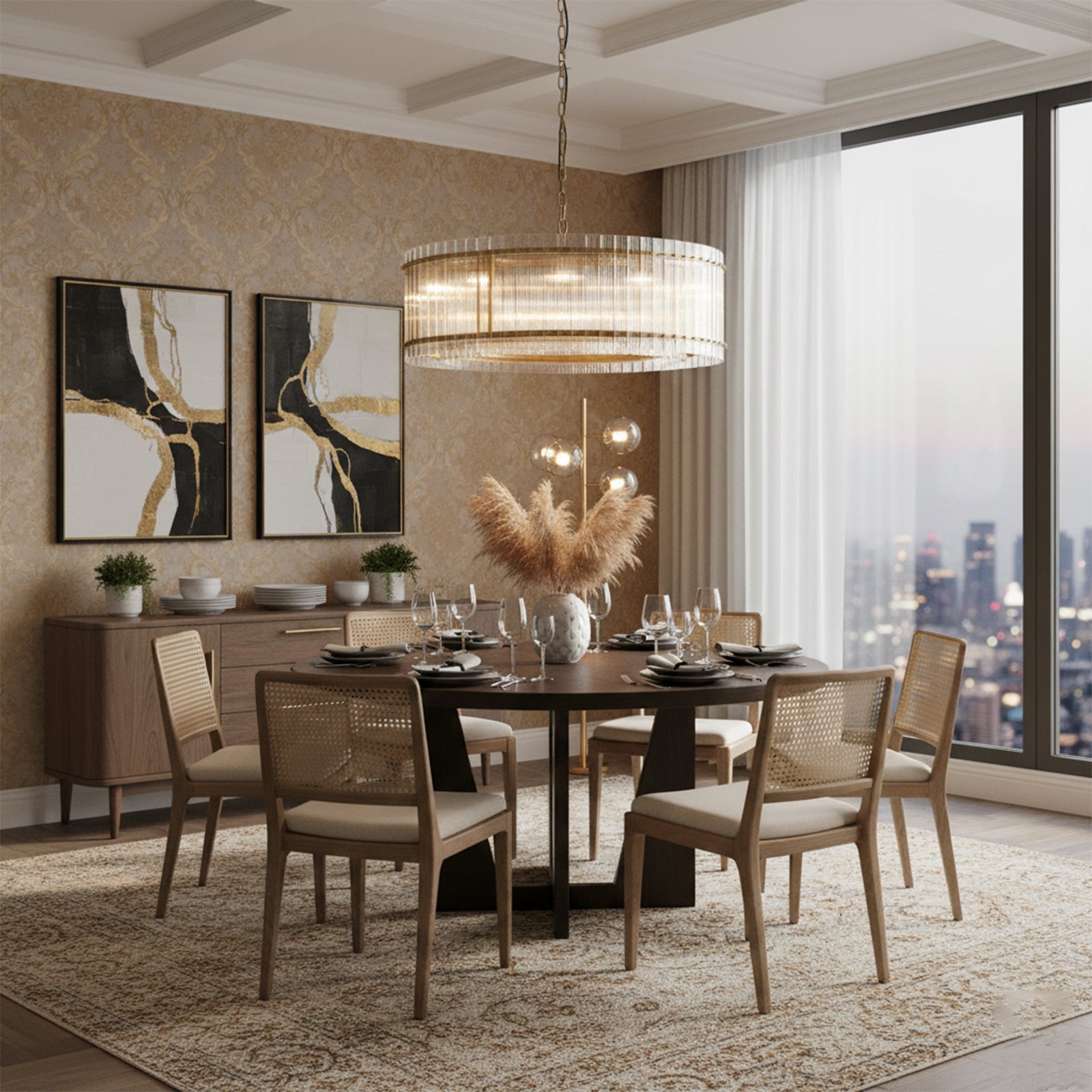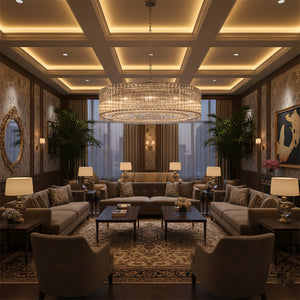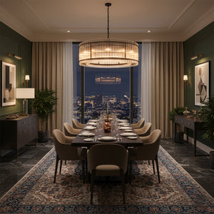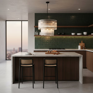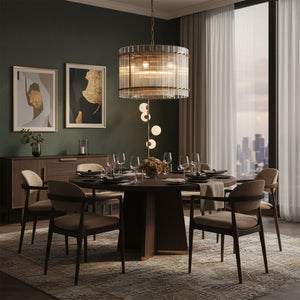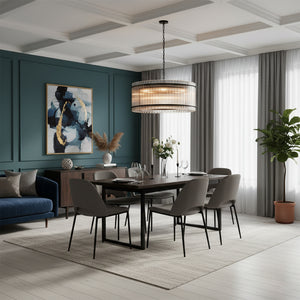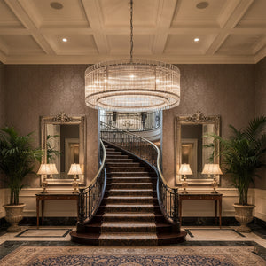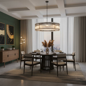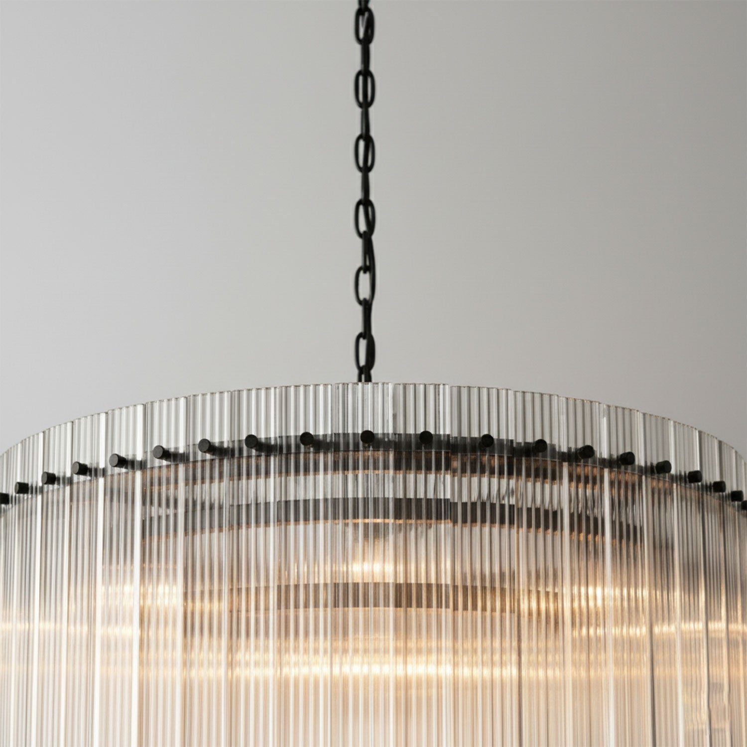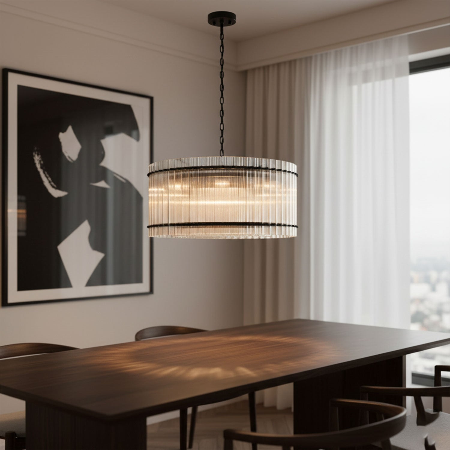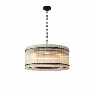 Elevate your living space with this spectacular tiered chandelier, a stunning fusion of vintage Art Deco glamour and contemporary design. The large, drum-shaped silhouette is composed of concentric rings, creating a dramatic sense of depth and scale perfect for a dining room or grand foyer. The light is diffused through hundreds of vertical glass rods, casting a captivating, warm, and shimmering glow throughout the room. Secured by a minimalist black finish frame, this fixture serves as an undeniable architectural centerpiece, instantly commanding attention and adding a luxurious texture to any modern interior.