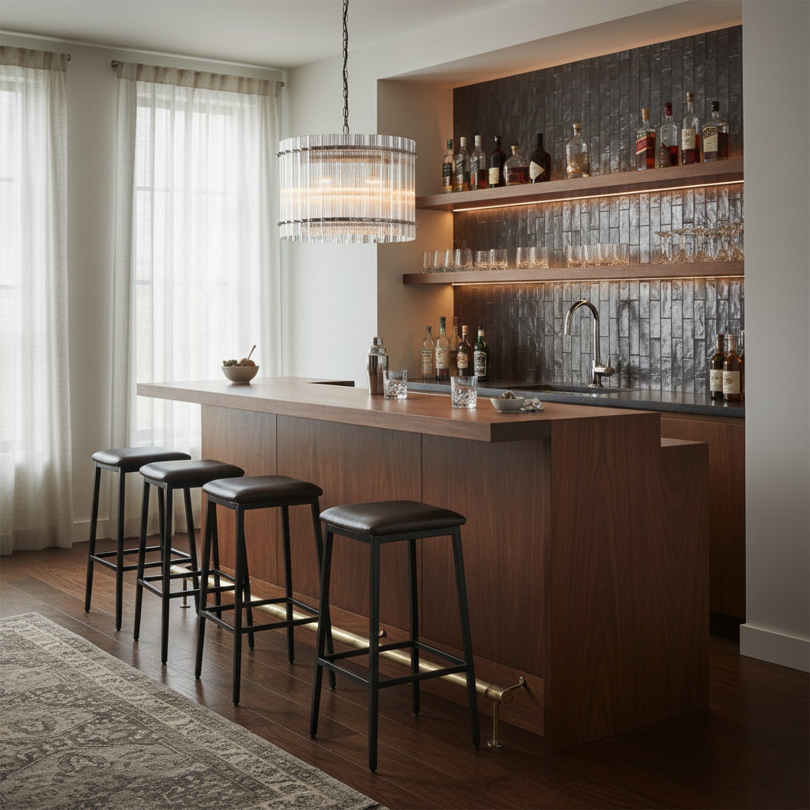 Showcasing meticulous assembly, the glass rods are precisely aligned and secured by thin bands, creating a sophisticated, multi-layered silhouette with a clean, contemporary edge.