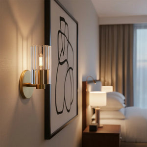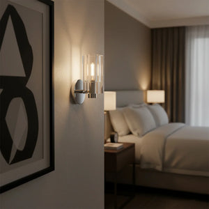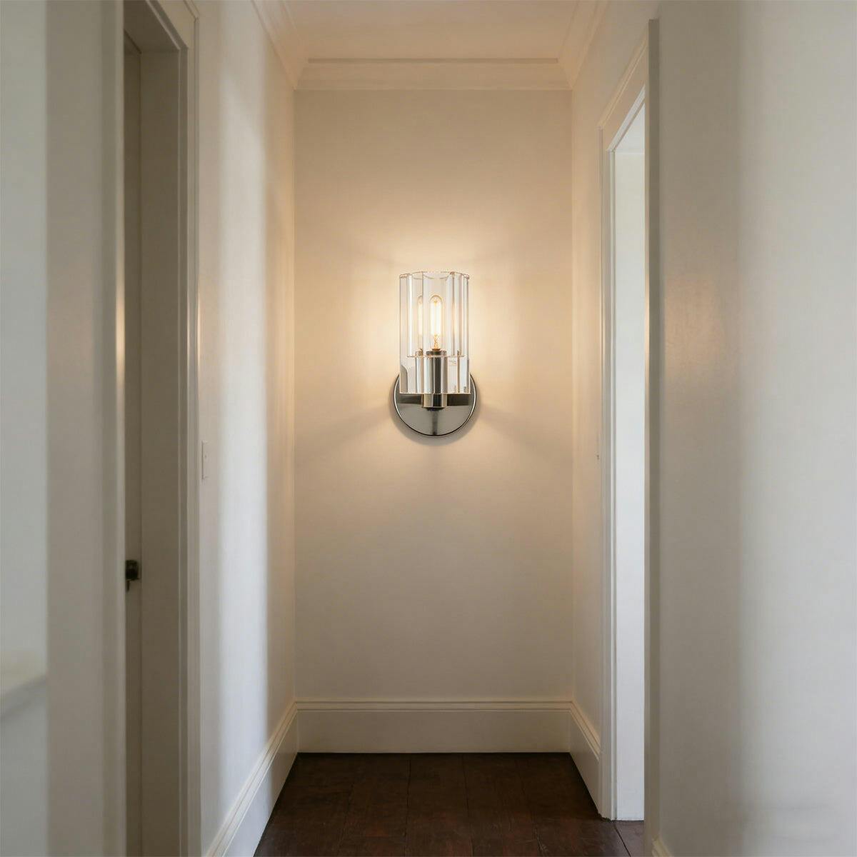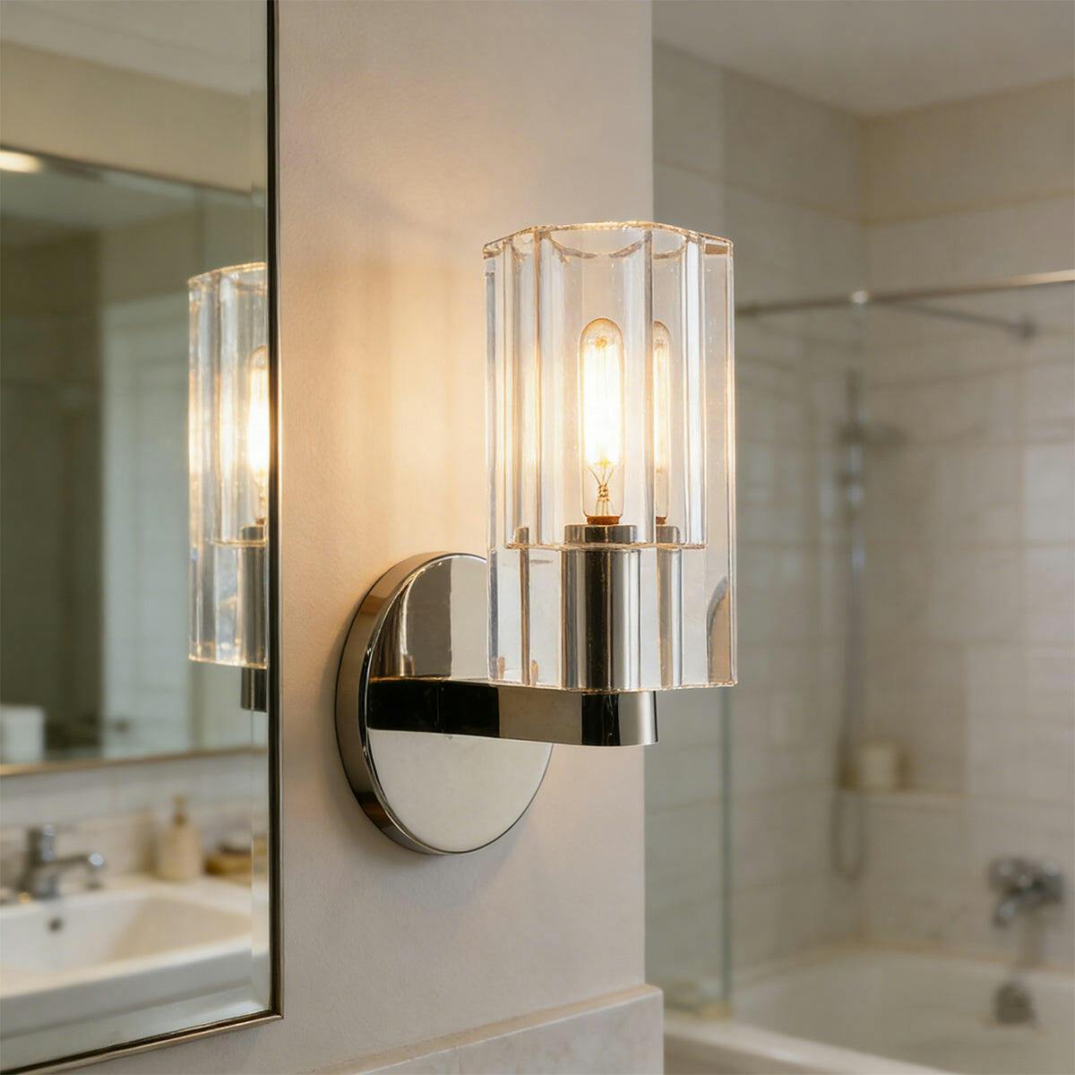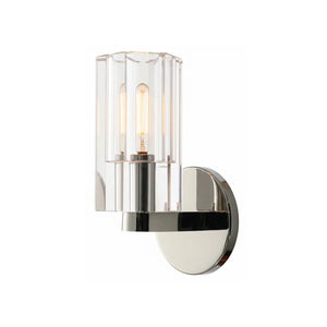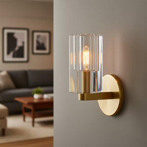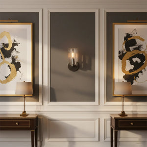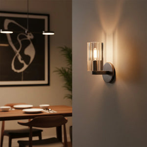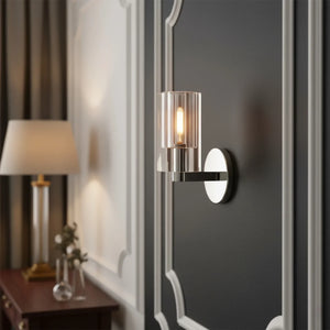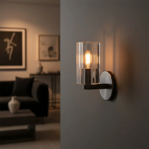 This striking single-light wall sconce is defined by its bold contrast and textural details, offering a sophisticated take on industrial aesthetics. It features a circular backplate and a slim arm, both finished in a dark. The exposed light source is encased in a cylindrical glass shade, half of which is smooth clear glass, while the upper half is heavily fluted or ribbed, creating a unique visual split. The combination of the warm filament light, the textured glass, and the dark metal hardware makes this fixture an excellent accent for flanking a mirror, illuminating a hallway, or adding a touch of polished edge to a modern bathroom.