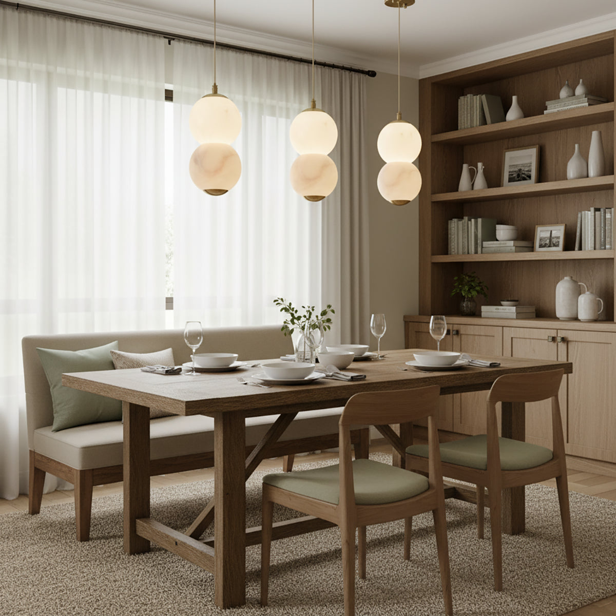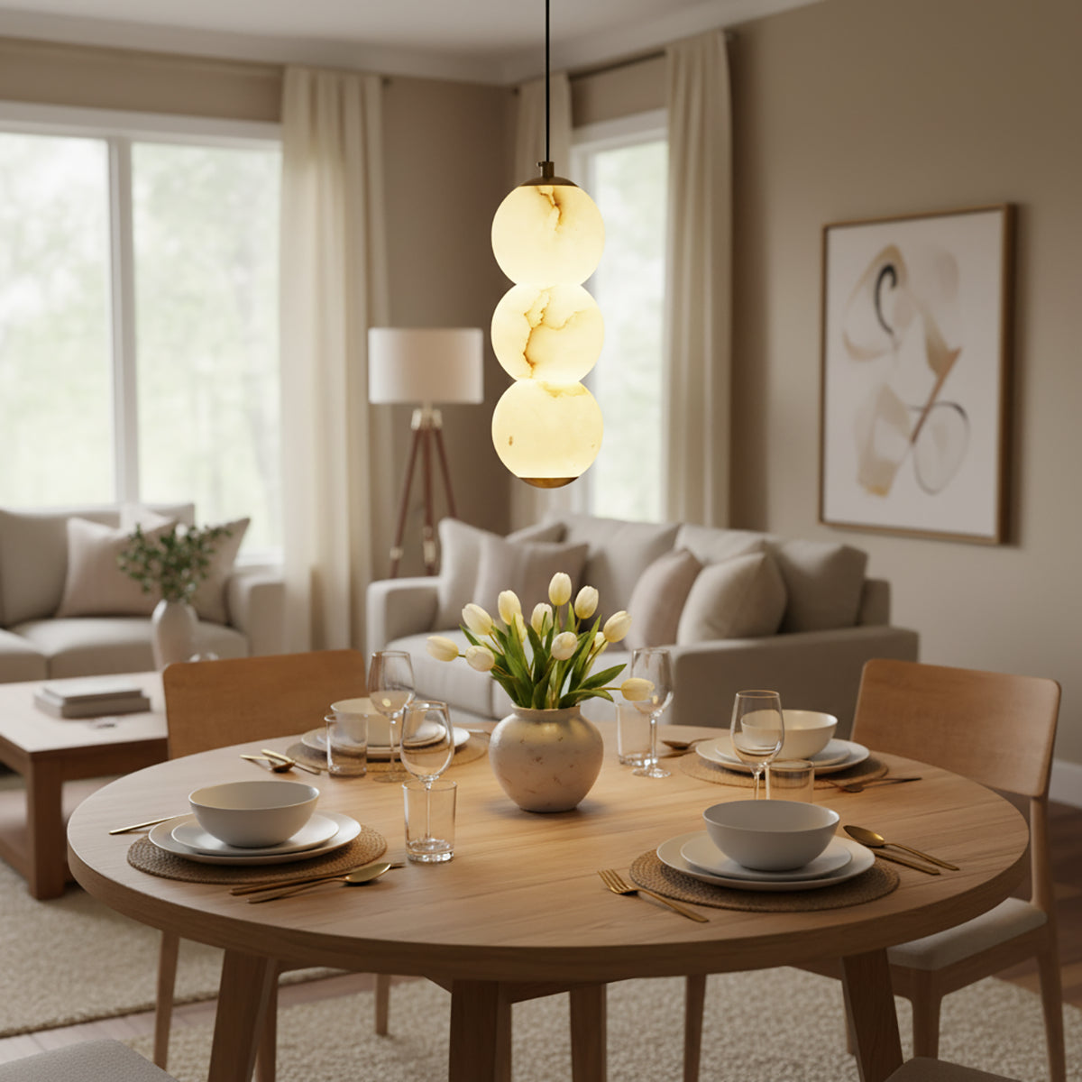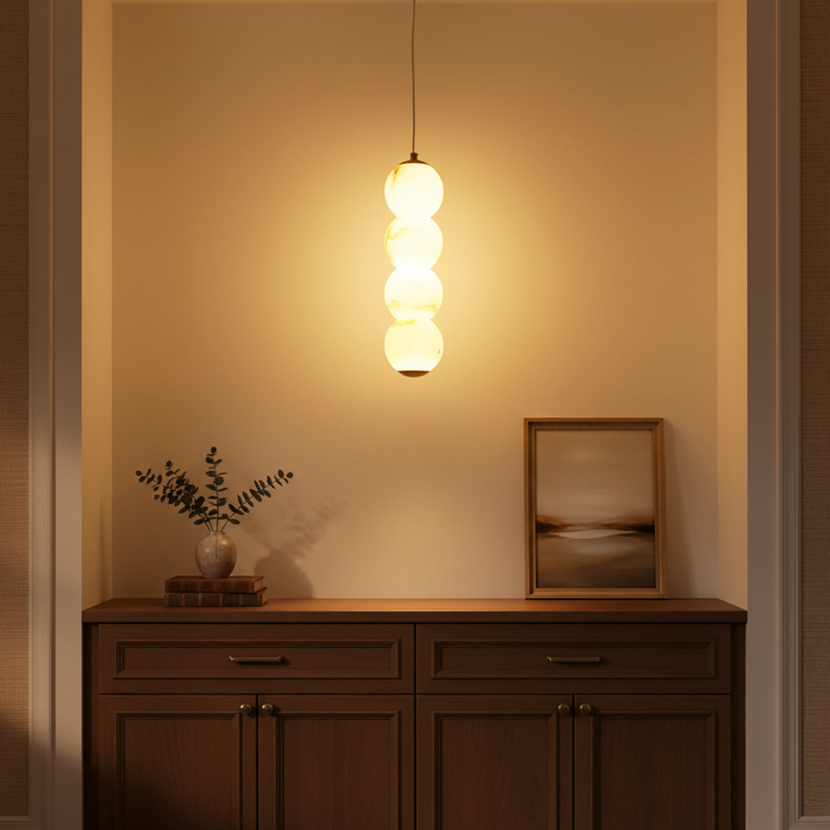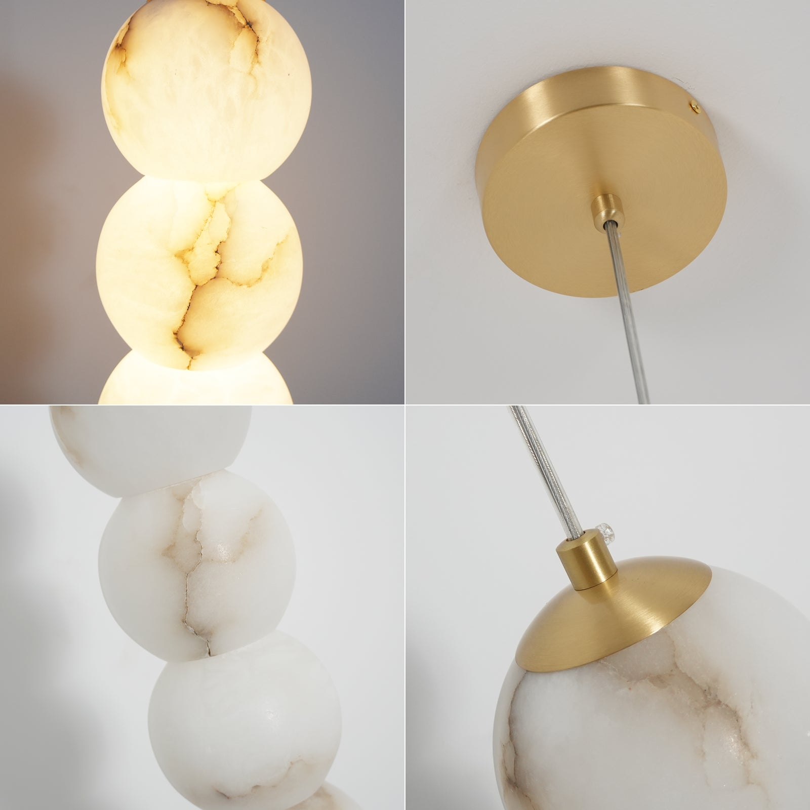Explore the Pearl Alabaster Round Pendant Light today – a masterpiece that blends luxury and functionality! This chandelier, with its softly glowing alabaster spheres, hangs elegantly from a refined frame, exuding sophisticated beauty. Whether suspended above a long dining table, a kitchen island, or as part of a layered lighting design in an open foyer, this chandelier becomes a stunning focal point in any space. Its multi-head design ensures ample and even illumination.