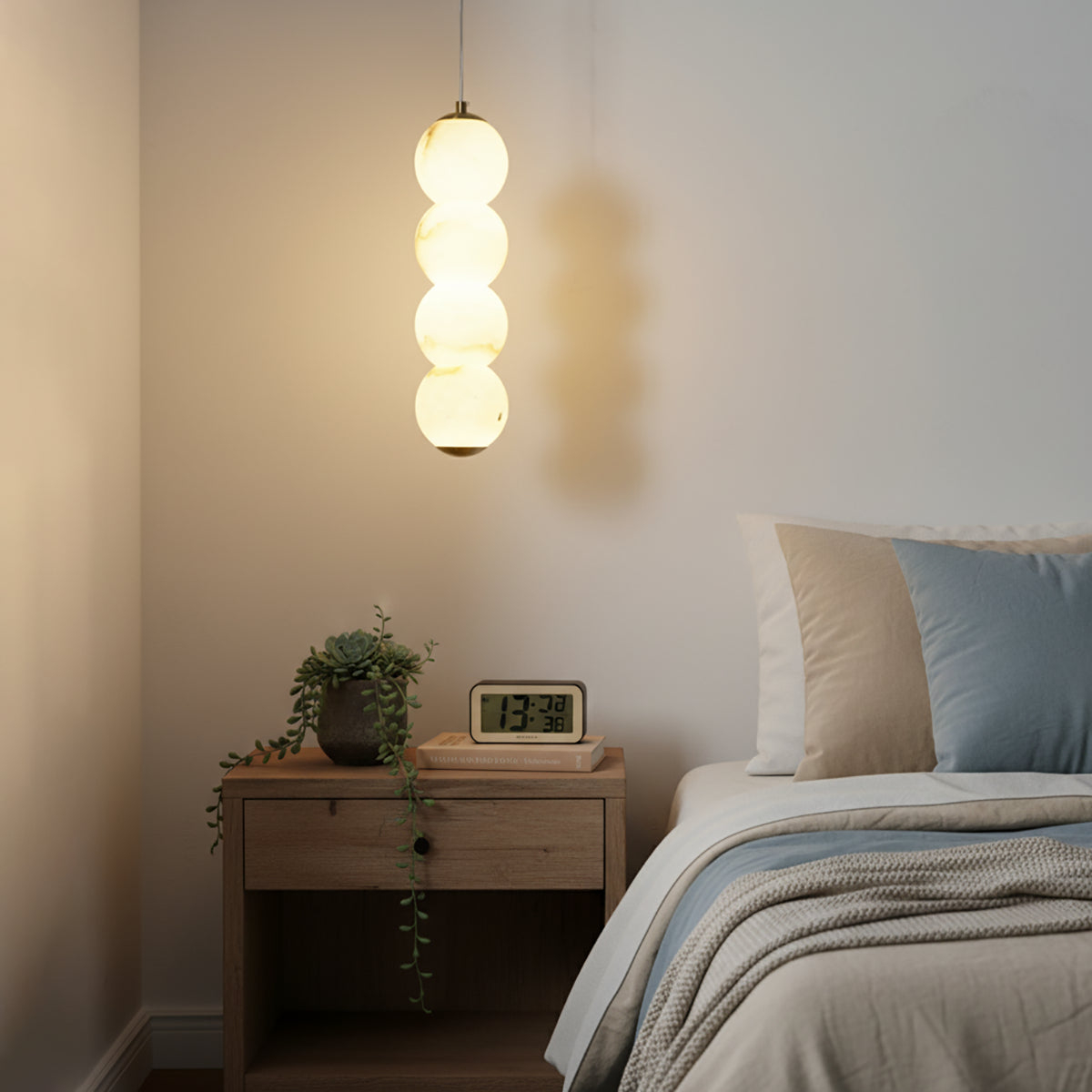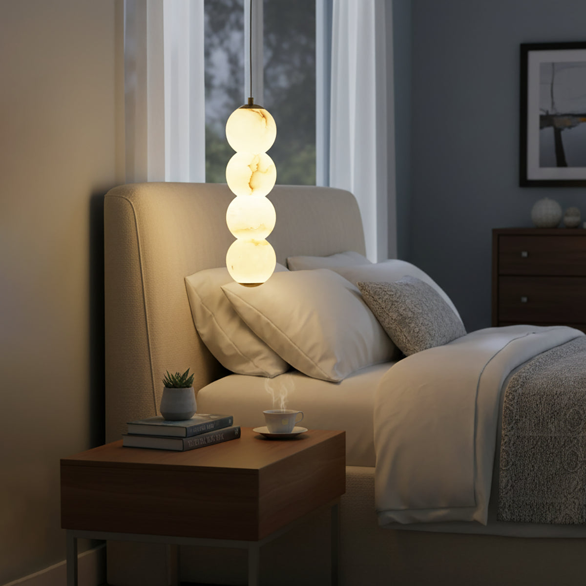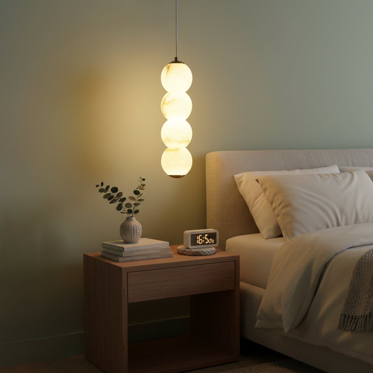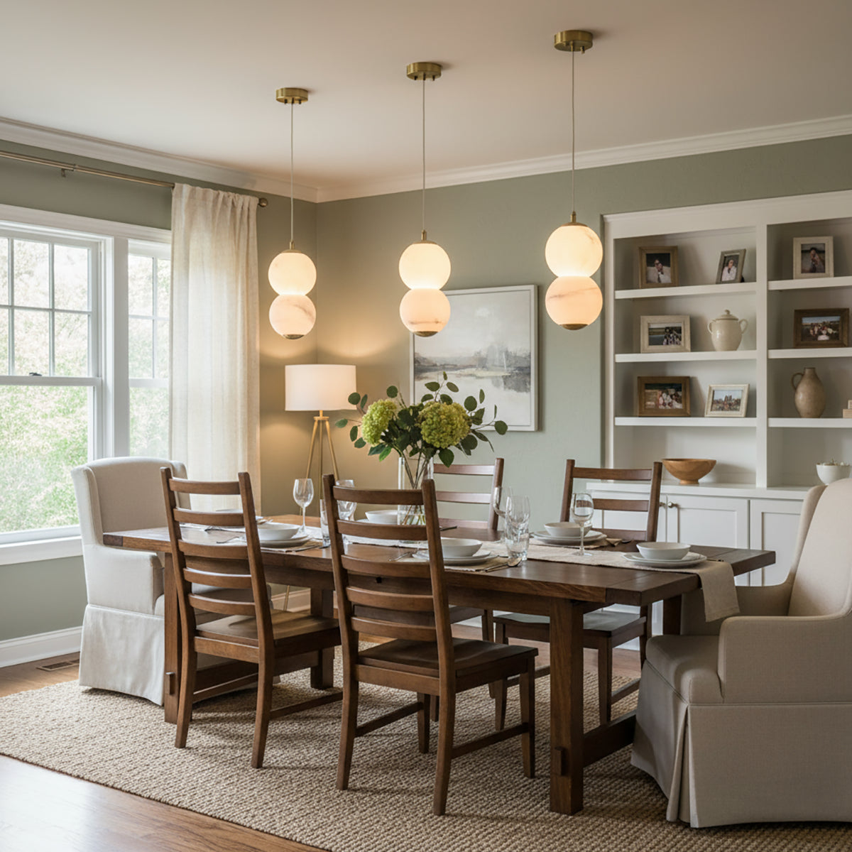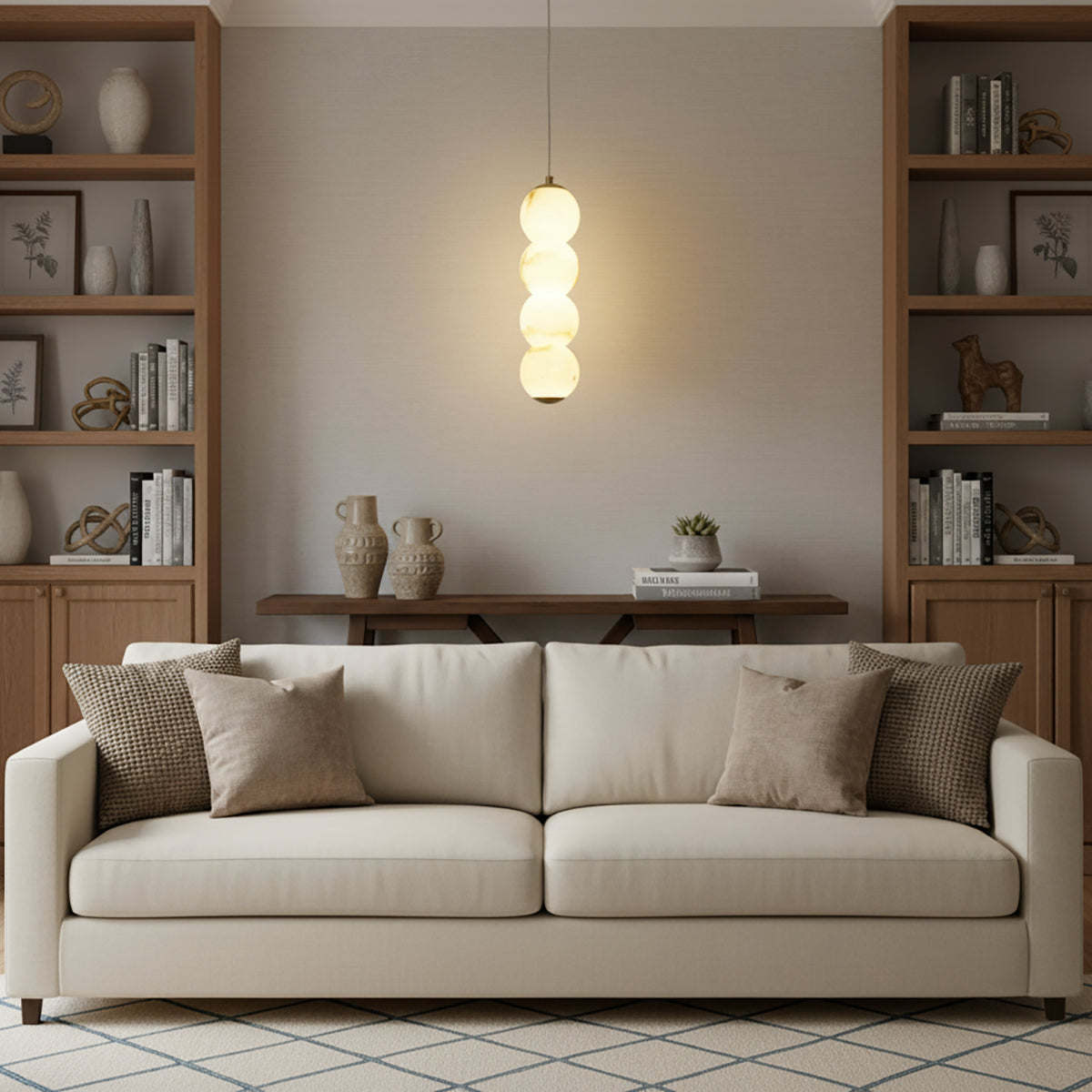 Explore the Pearl Alabaster Round Pendant Light today – a masterpiece that blends luxury and functionality! This chandelier, with its softly glowing alabaster spheres, hangs elegantly from a refined frame, exuding sophisticated beauty. Whether suspended above a long dining table, a kitchen island, or as part of a layered lighting design in an open foyer, this chandelier becomes a stunning focal point in any space. Its multi-head design ensures ample and even illumination.