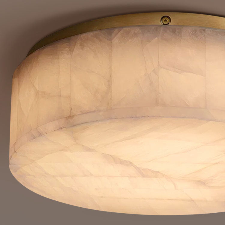 Minimalist in form, dramatic in effect, our Rivage Round ceiling lampby Timothy Oulton celebrates the beauty of calcite, a translucent stone with a warm, natural glow. Polished sheets of stone are expertly pieced to create a smooth, continuous surface, while subtle illumination from within highlights the organic coloration and veining. Each fixture is a one-of-a-kind statement.