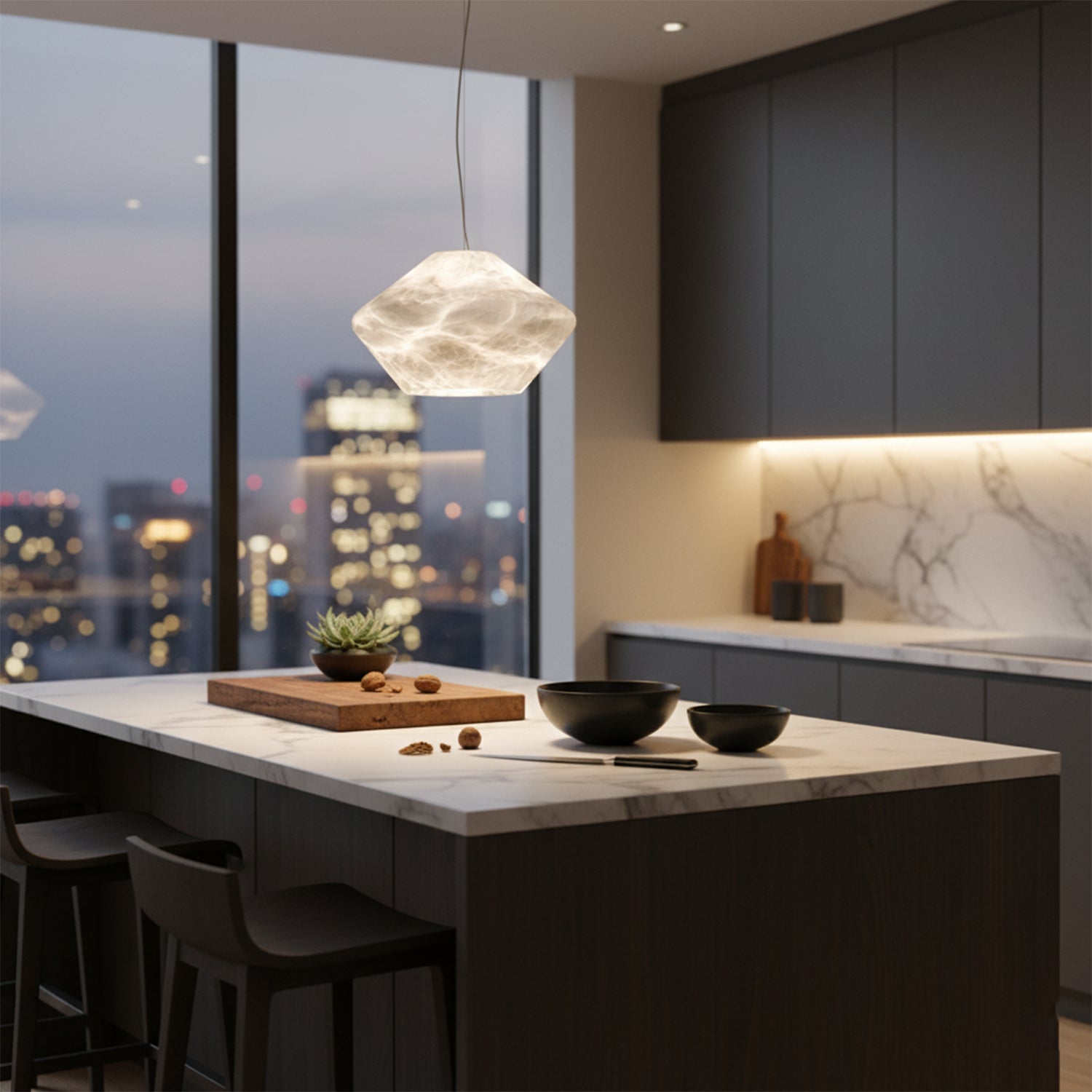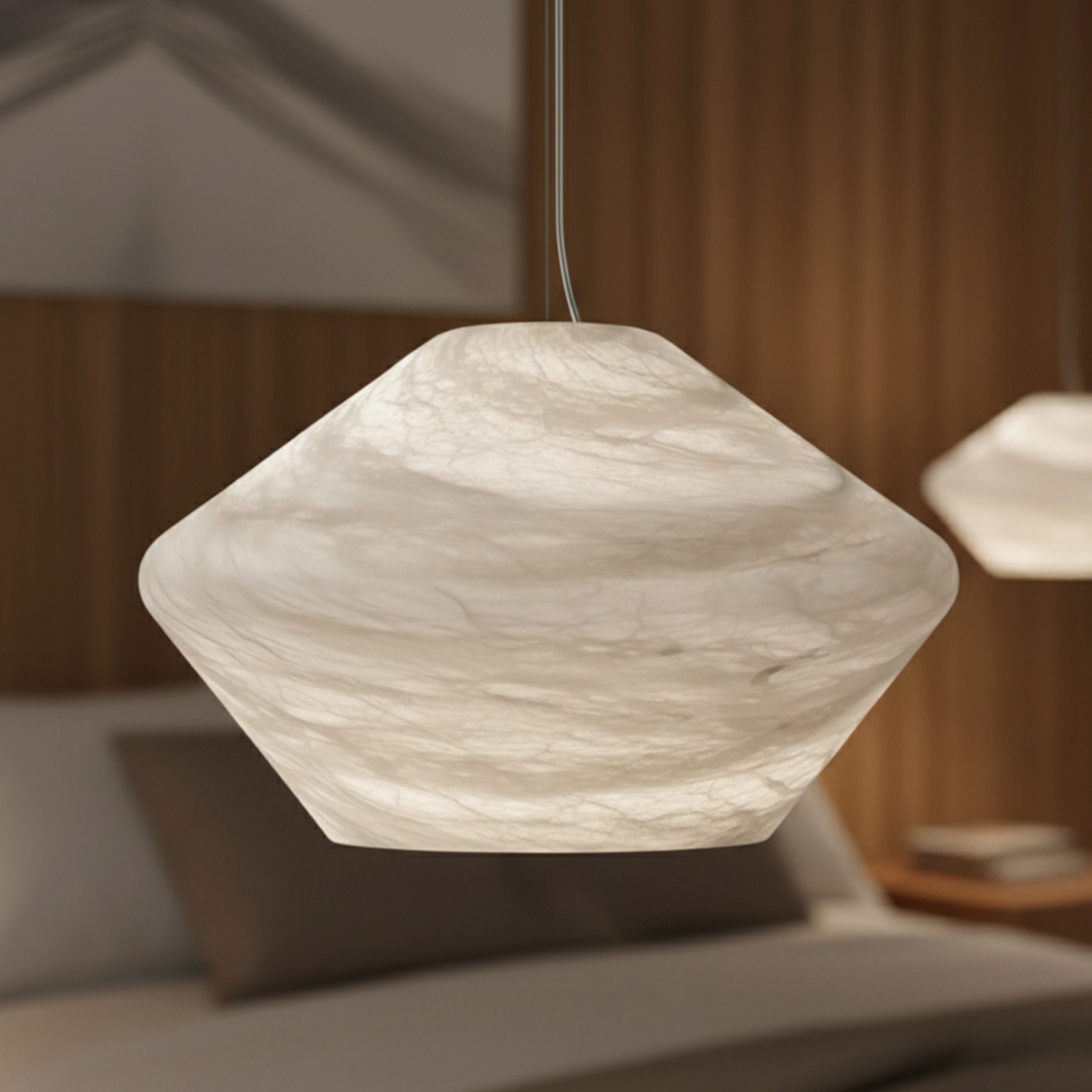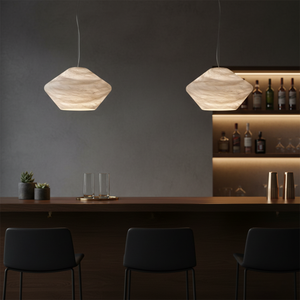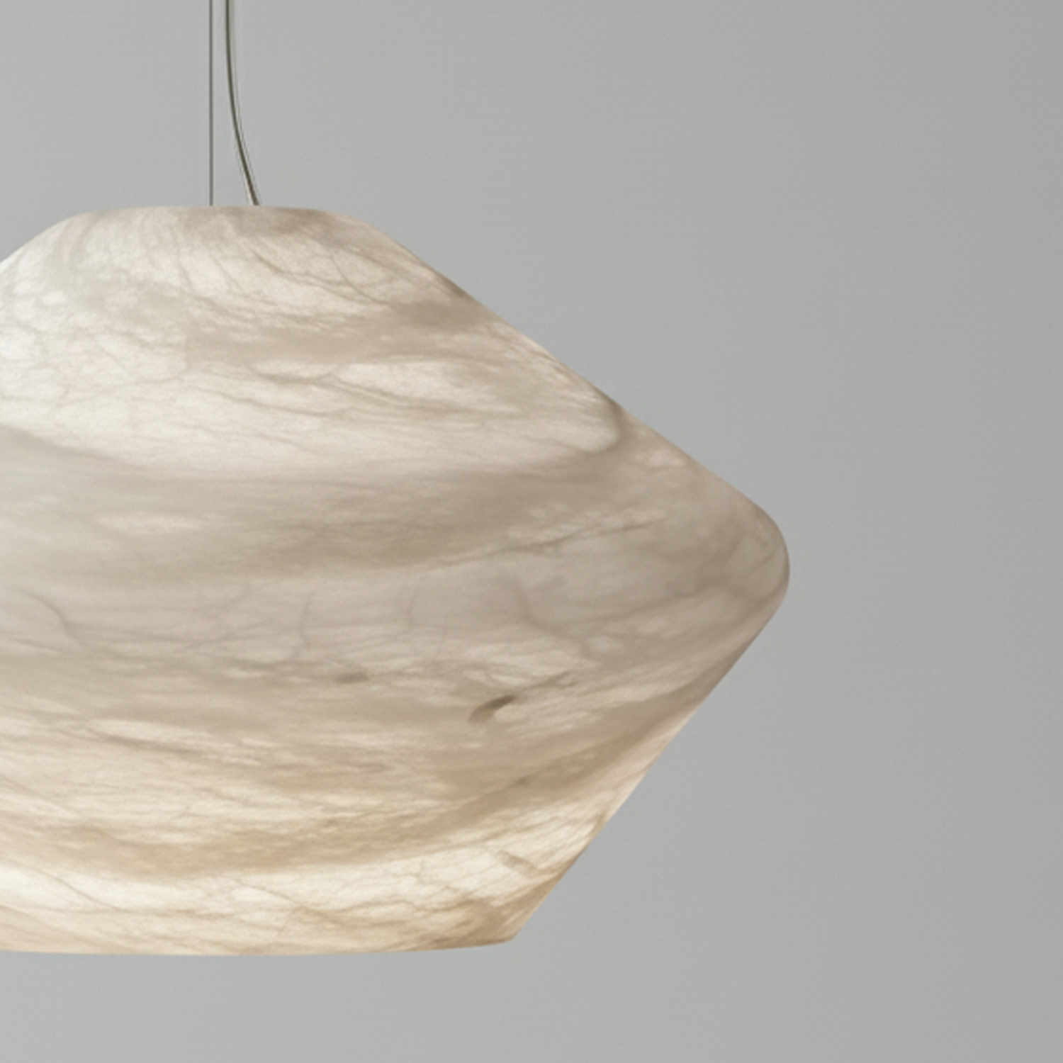 This exquisite pendant light provides serene, ambient illumination, making it a perfect accent for spaces requiring soft, such as a cozy corner or dining nook. The fixture features a wide, shallow dome shade crafted from natural alabaster stone, suspended by a slim black cord. A subtle brass detail at the top of the shade provides a delicate metallic warmth that contrasts beautifully with the milky white stone. When lit, the alabaster’s natural veining and translucency are enhanced, filtering the light into a warm, inviting glow that is gentle and non-glaring. Its refined, organic form serves as a tranquil, sculptural focal point.