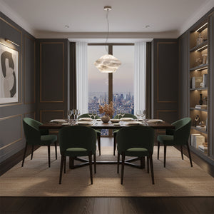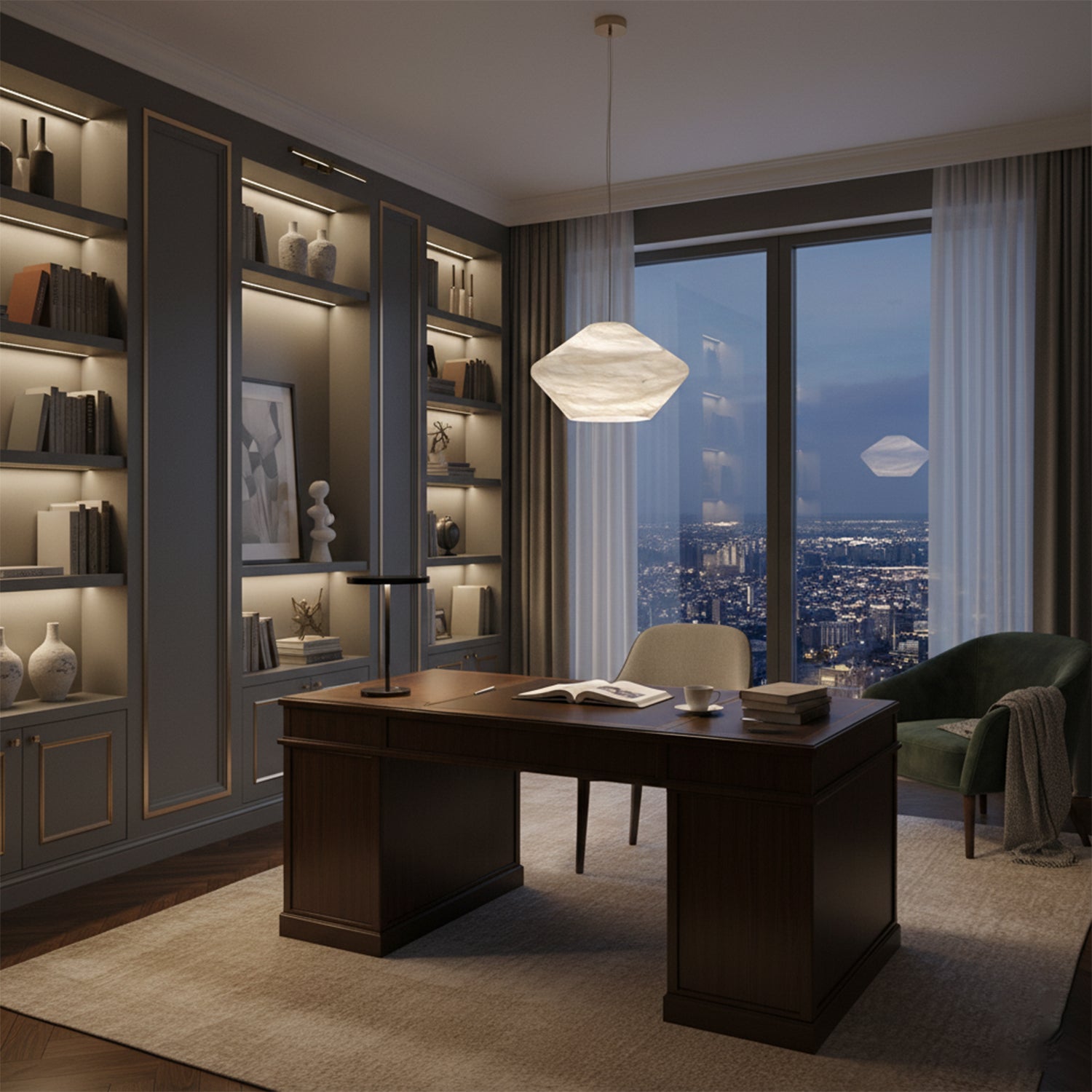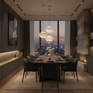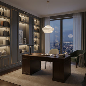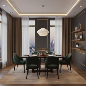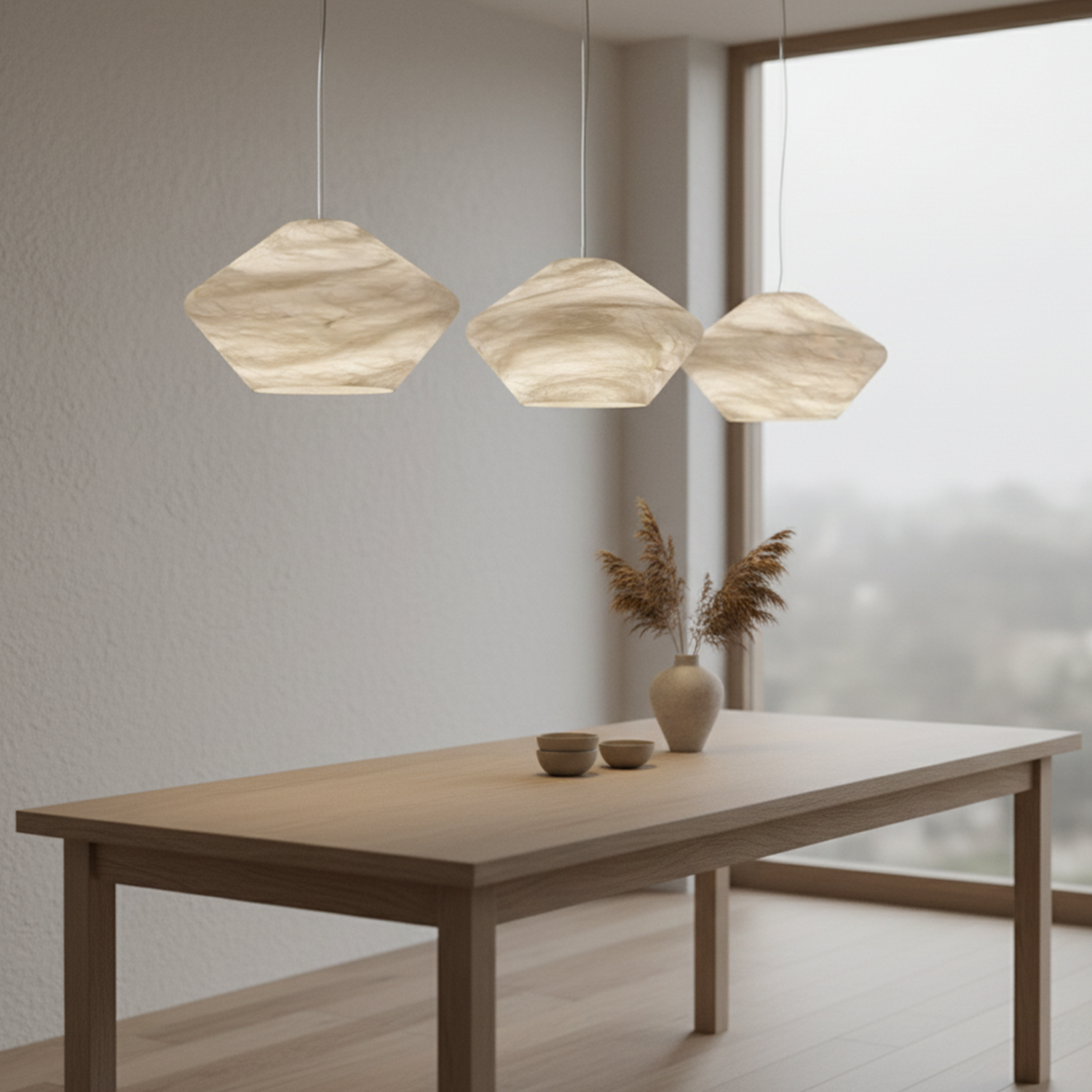This exquisite pendant light provides serene, ambient illumination, making it a perfect accent for spaces requiring soft, such as a cozy corner or dining nook. The fixture features a wide, shallow dome shade crafted from natural alabaster stone, suspended by a slim black cord. A subtle brass detail at the top of the shade provides a delicate metallic warmth that contrasts beautifully with the milky white stone. When lit, the alabaster’s natural veining and translucency are enhanced, filtering the light into a warm, inviting glow that is gentle and non-glaring. Its refined, organic form serves as a tranquil, sculptural focal point.