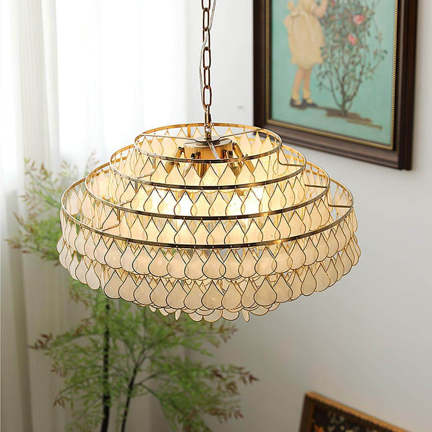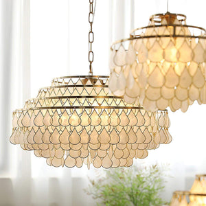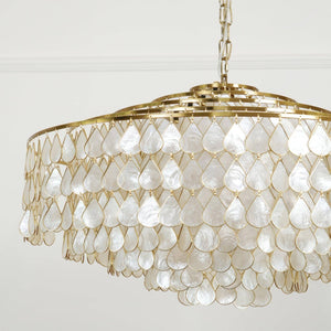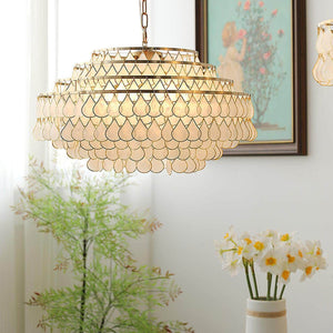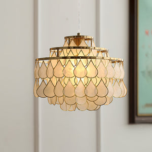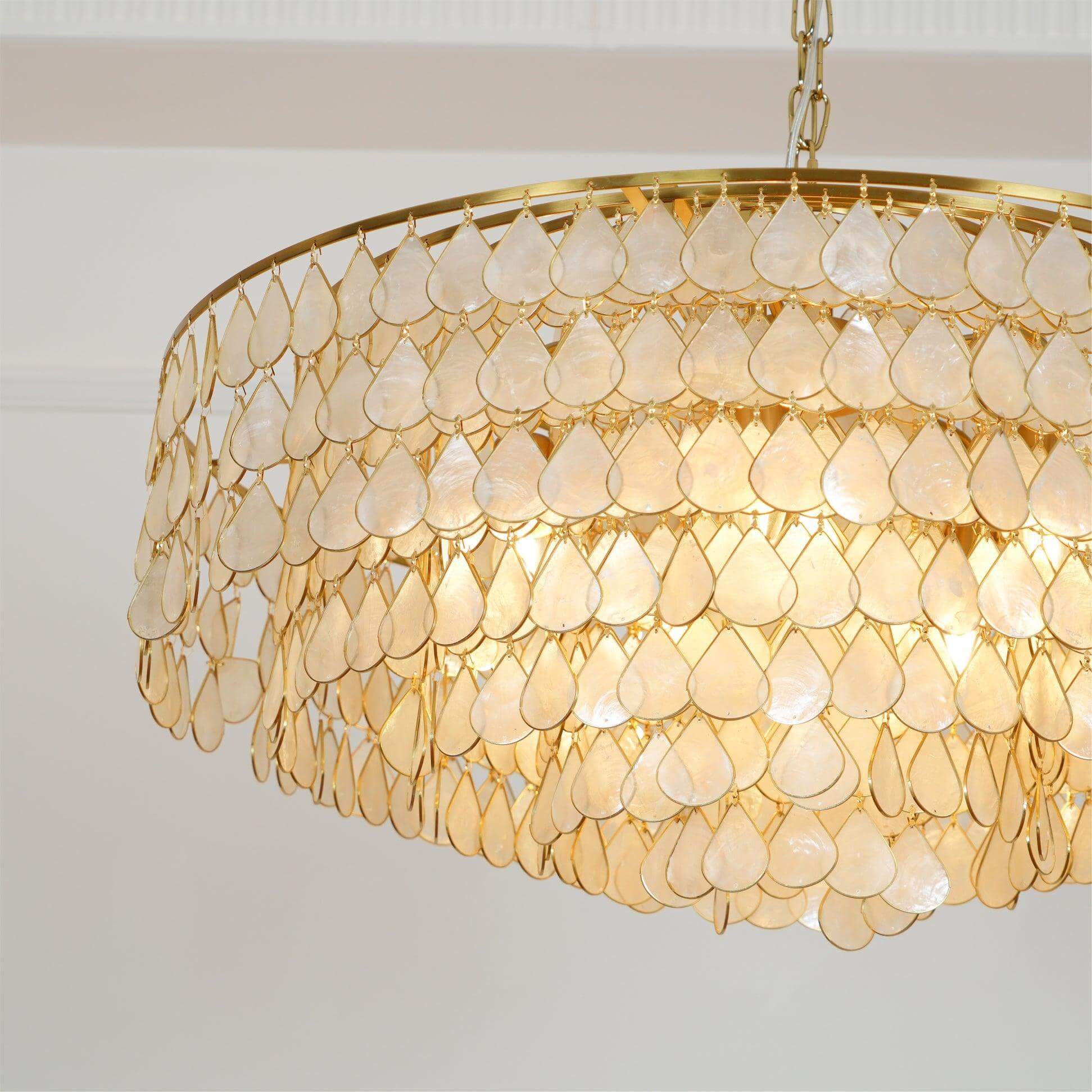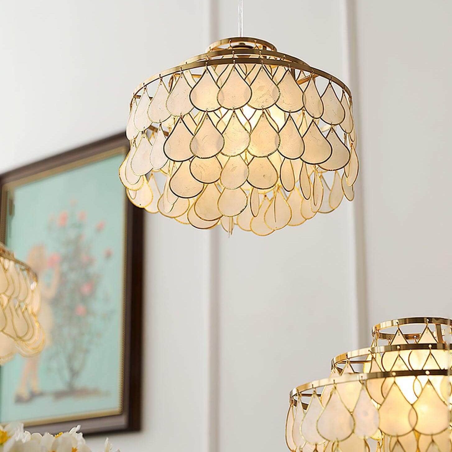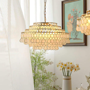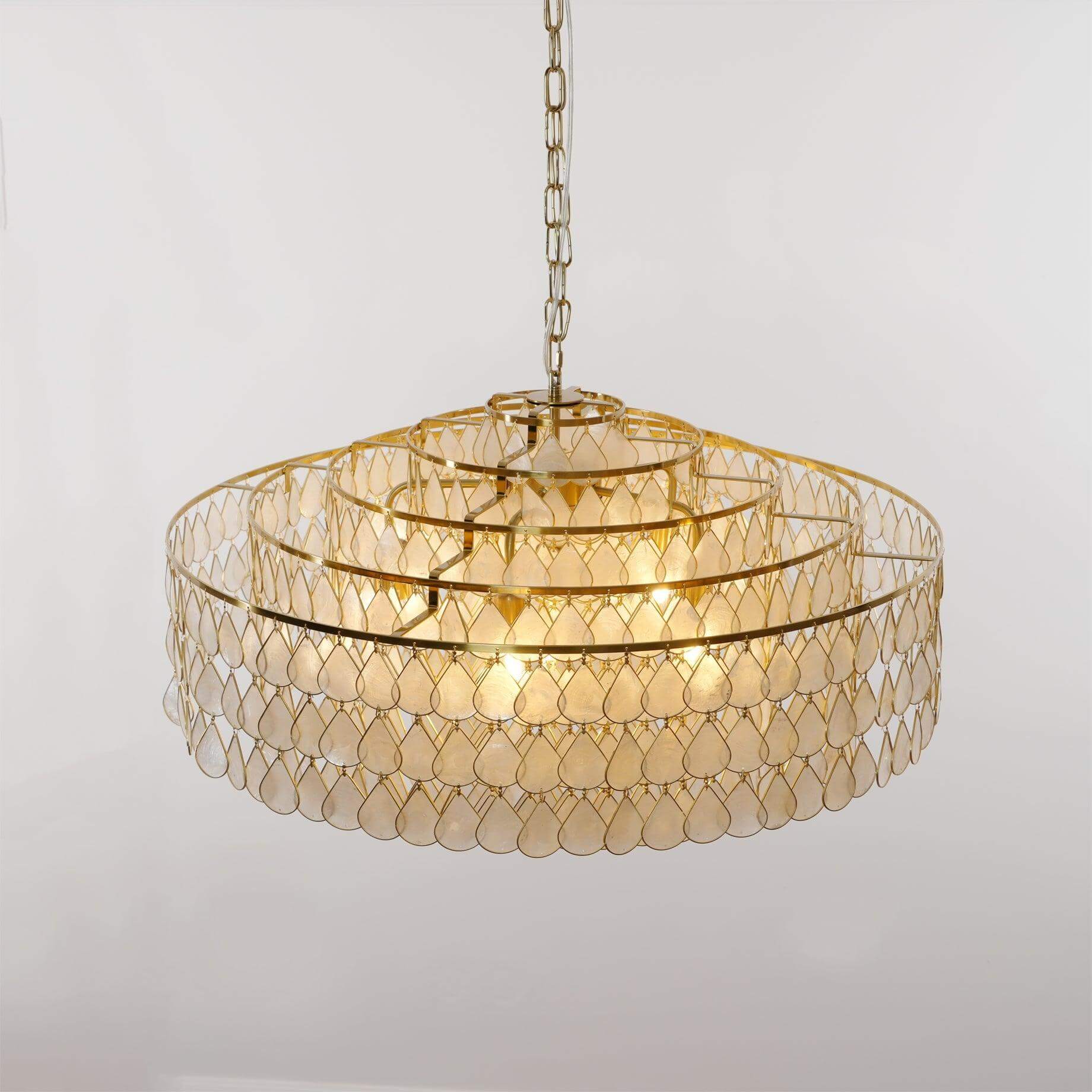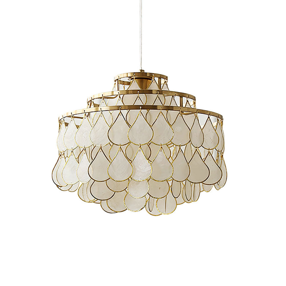 This unique Teardrops Capiz Chandelier is sure to add a touch of elegance to any room. Handmade with real shell, this lamp casts a soft, warm light, perfect for ambient lighting. The stylish design features a natural shell surface, making it a beautiful addition to any home.