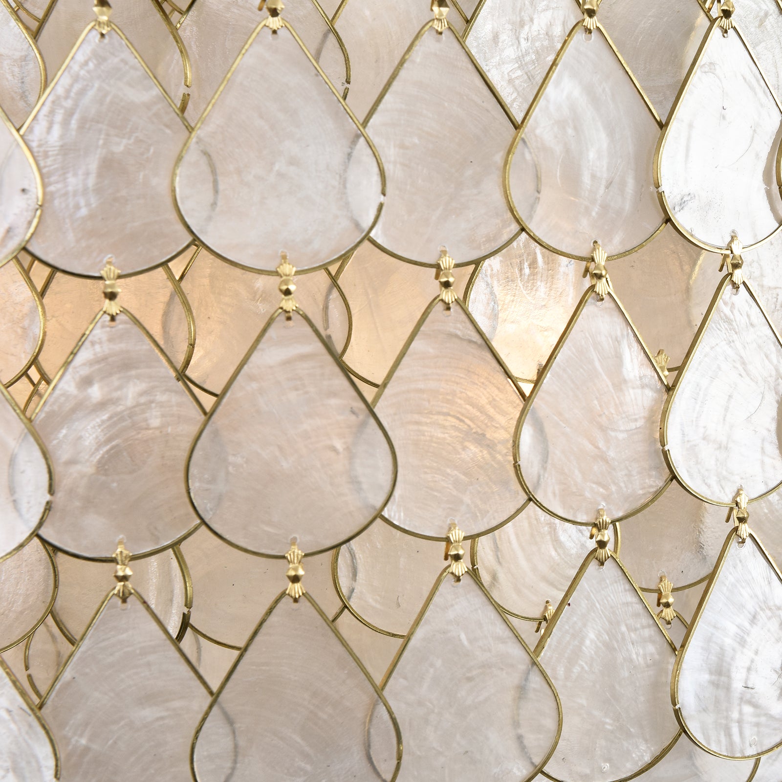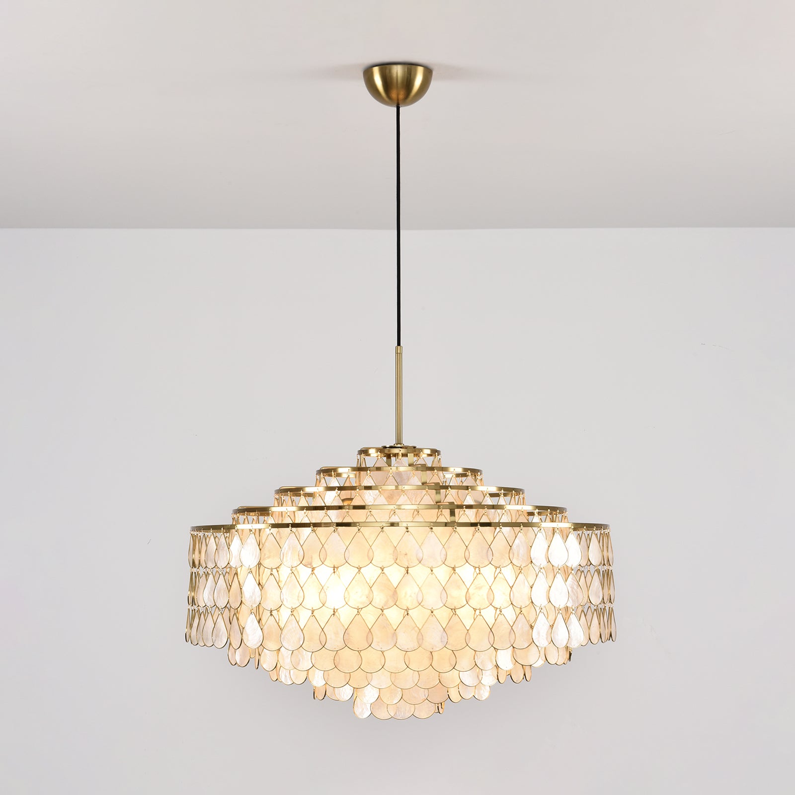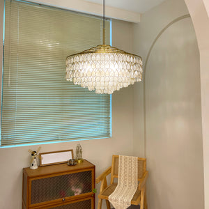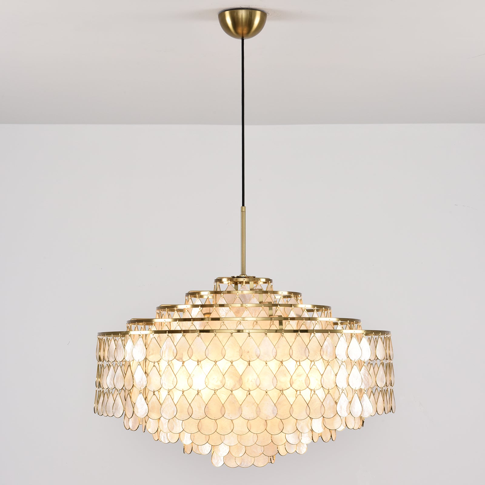 Infuse your home with the tranquil beauty of the ocean and effortlessly luxurious design! The Shell Teardrops Tiered Chandelier is the ultimate choice for creating a romantic and elegant ambiance. This pendant light features a striking, multi-layered structure, with delicate natural shell pieces meticulously suspended from a circular body, shaped like shimmering teardrops. Each shell is secured by a delicate copper frame.
