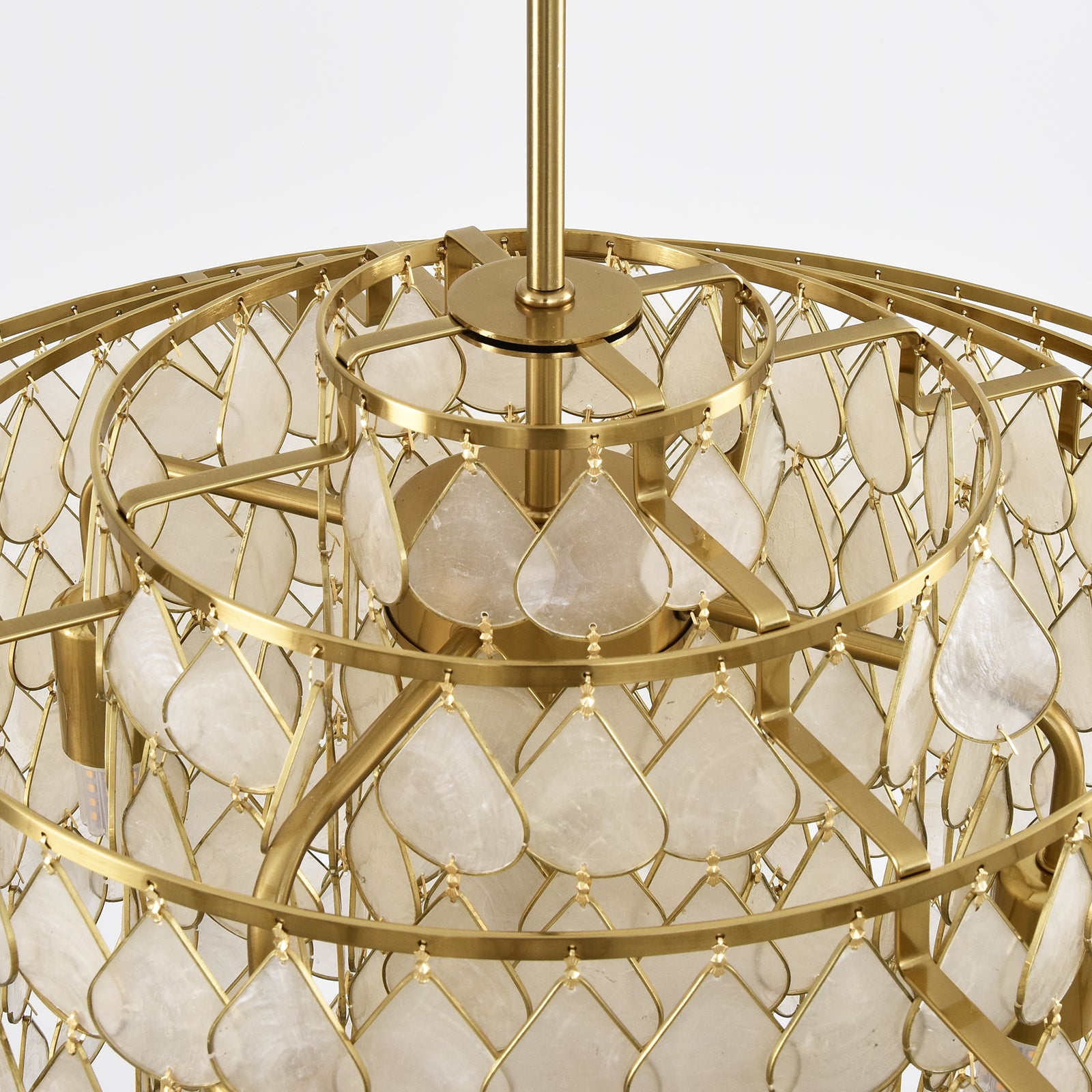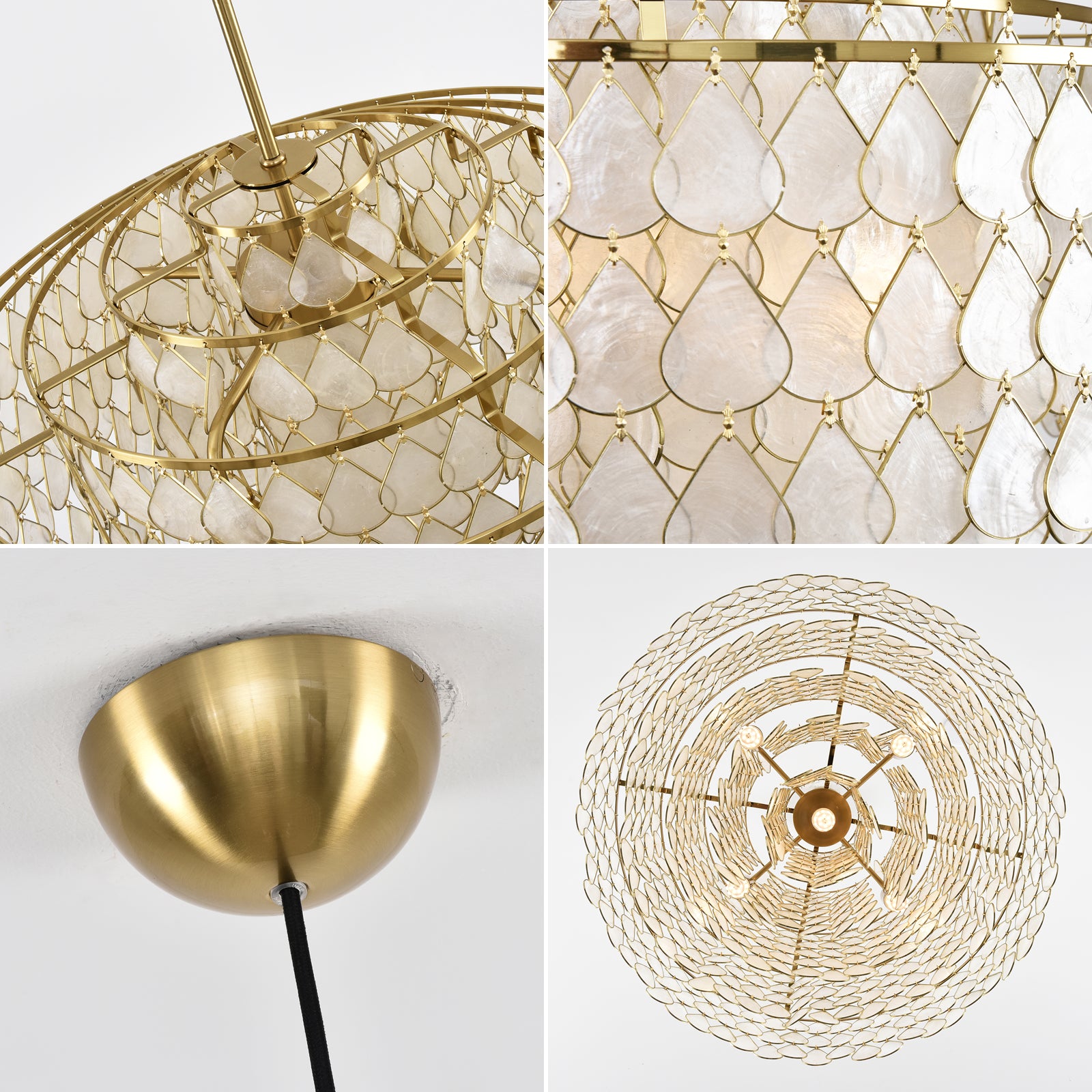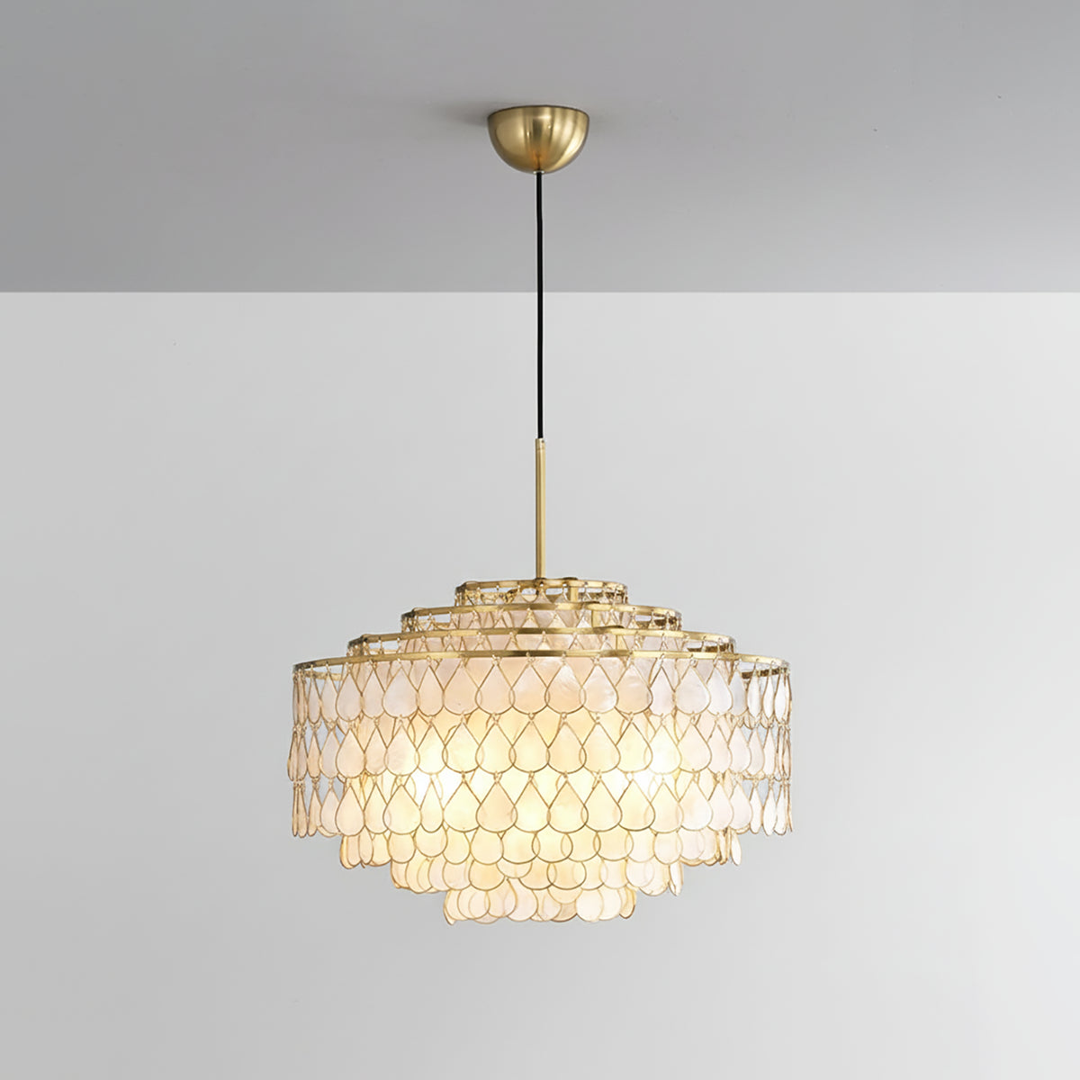 Infuse your home with the tranquil beauty of the ocean and effortlessly luxurious design! The Shell Teardrops Tiered Chandelier is the ultimate choice for creating a romantic and elegant ambiance. This pendant light features a striking, multi-layered structure, with delicate natural shell pieces meticulously suspended from a circular body, shaped like shimmering teardrops. Each shell is secured by a delicate copper frame.