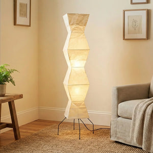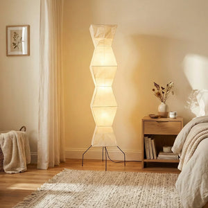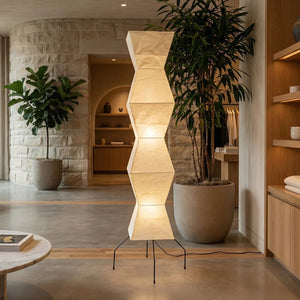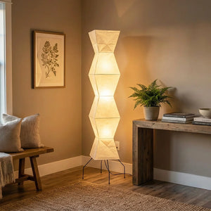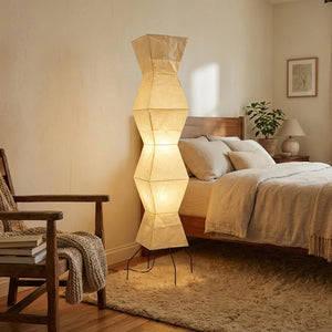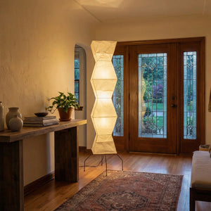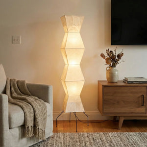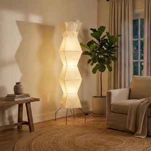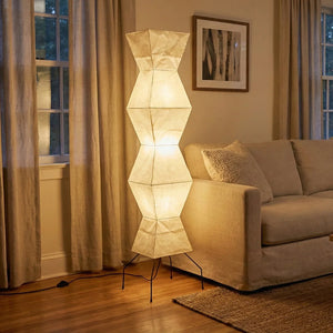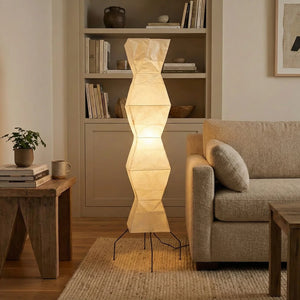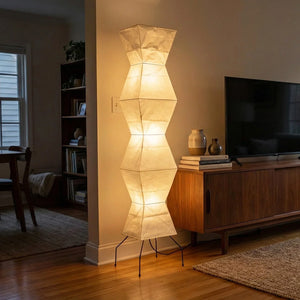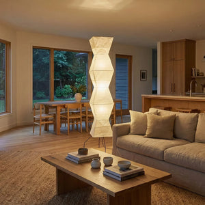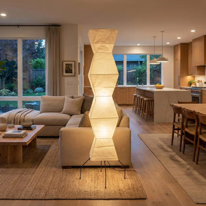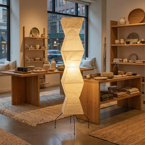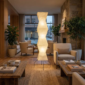 The Akari Hourglass Shape UF4-L9 Floor Lamp is a masterpiece that perfectly blends traditional craftsmanship with modern geometric design. It not only provides functional lighting but also elevates the style of any space with its unique artistic flair. It's a quintessential piece for Wabi-Sabi style homes and is also perfectly suited for Scandinavian or Mid-Century Modern interior design. Its tall and elegant silhouette makes it ideal for placement in a sofa corner, in front of a floor-to-ceiling window, or beside a bed, serving as a central light source to enhance the ambiance.