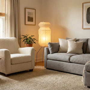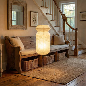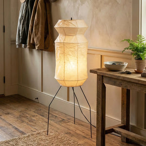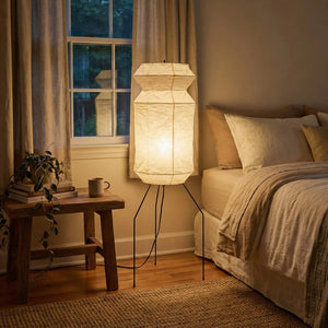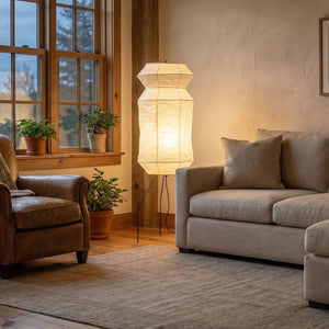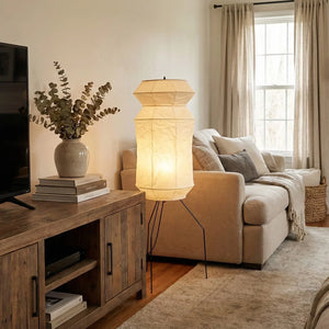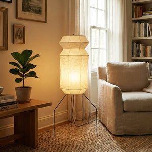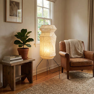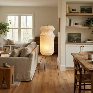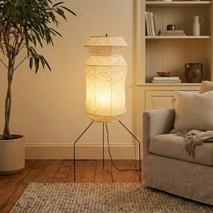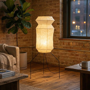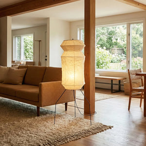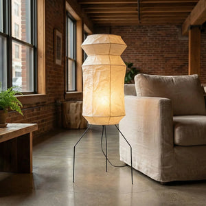 The Lantern Akari Hourglass UF3-L6 Floor Lamp introduces elegance and luxury to your space.  Perfectly suited for those seeking tranquility and a refined interior design, it's the perfect finishing touch for Wabi-Sabi style homes. With its tall silhouette, it's ideal for placement in a sofa corner, next to a floor-to-ceiling window, or in a meditation space, acting as a visual focal point. The ribbed structure of the paper surface creates captivating linear projections when illuminated, adding depth and dimension to the space.
