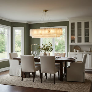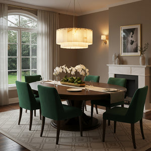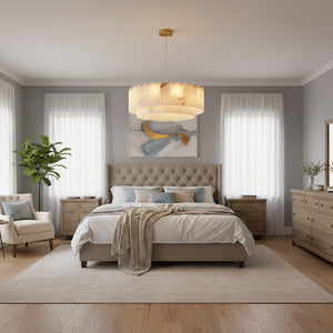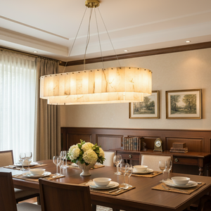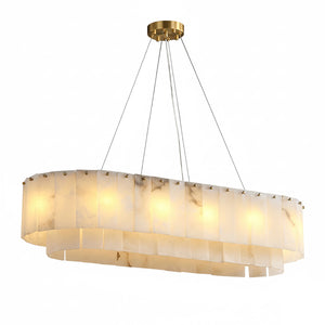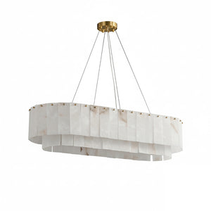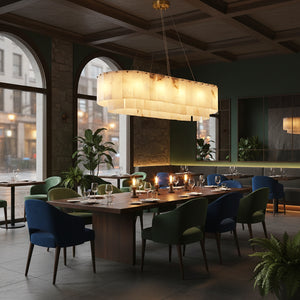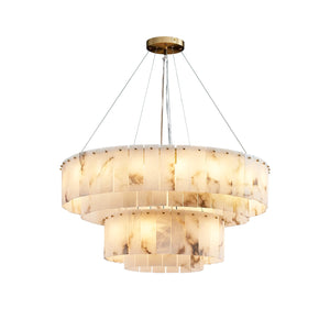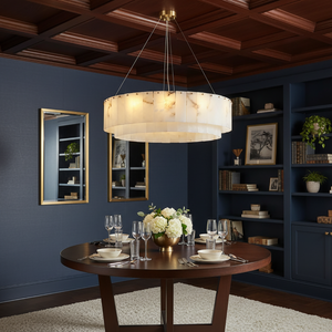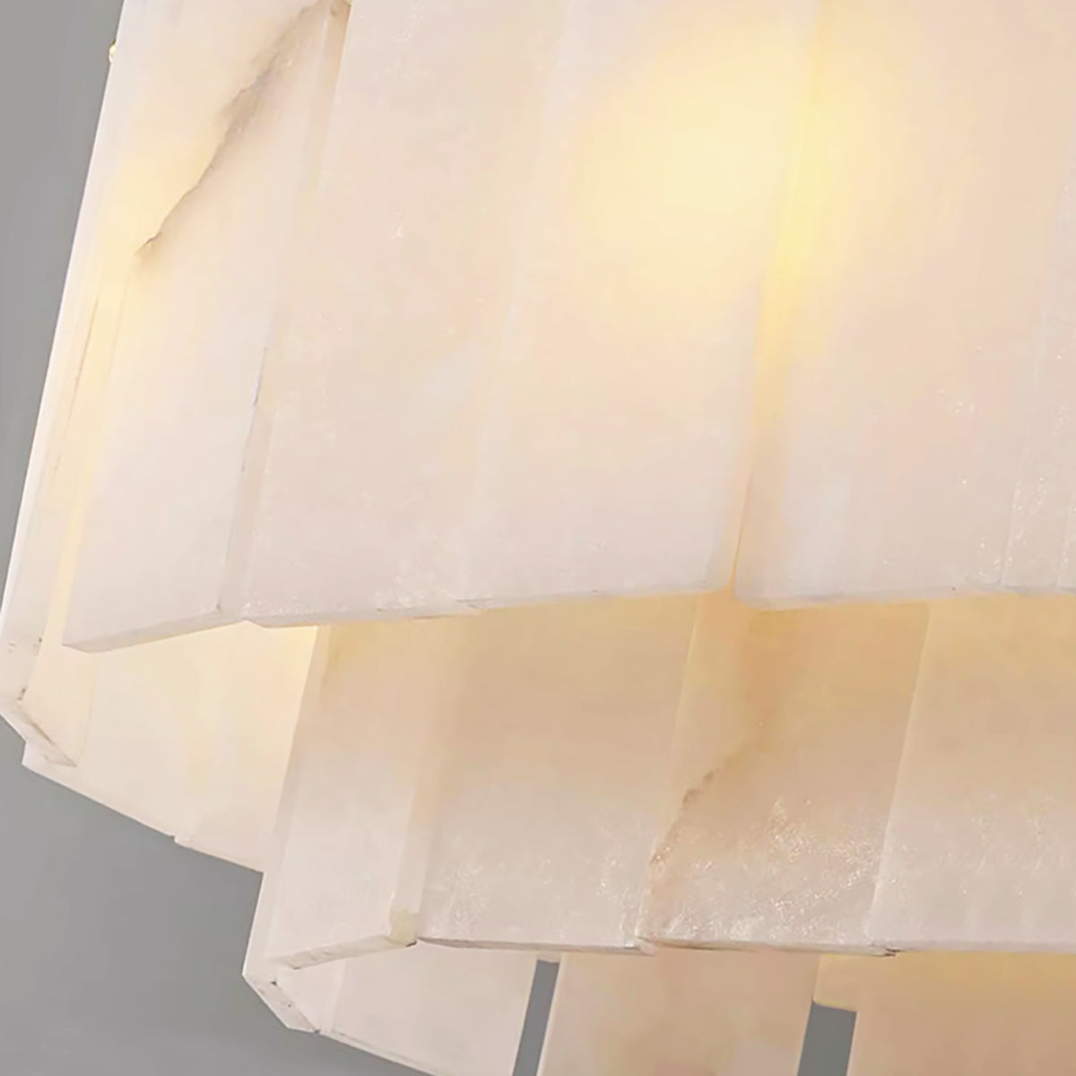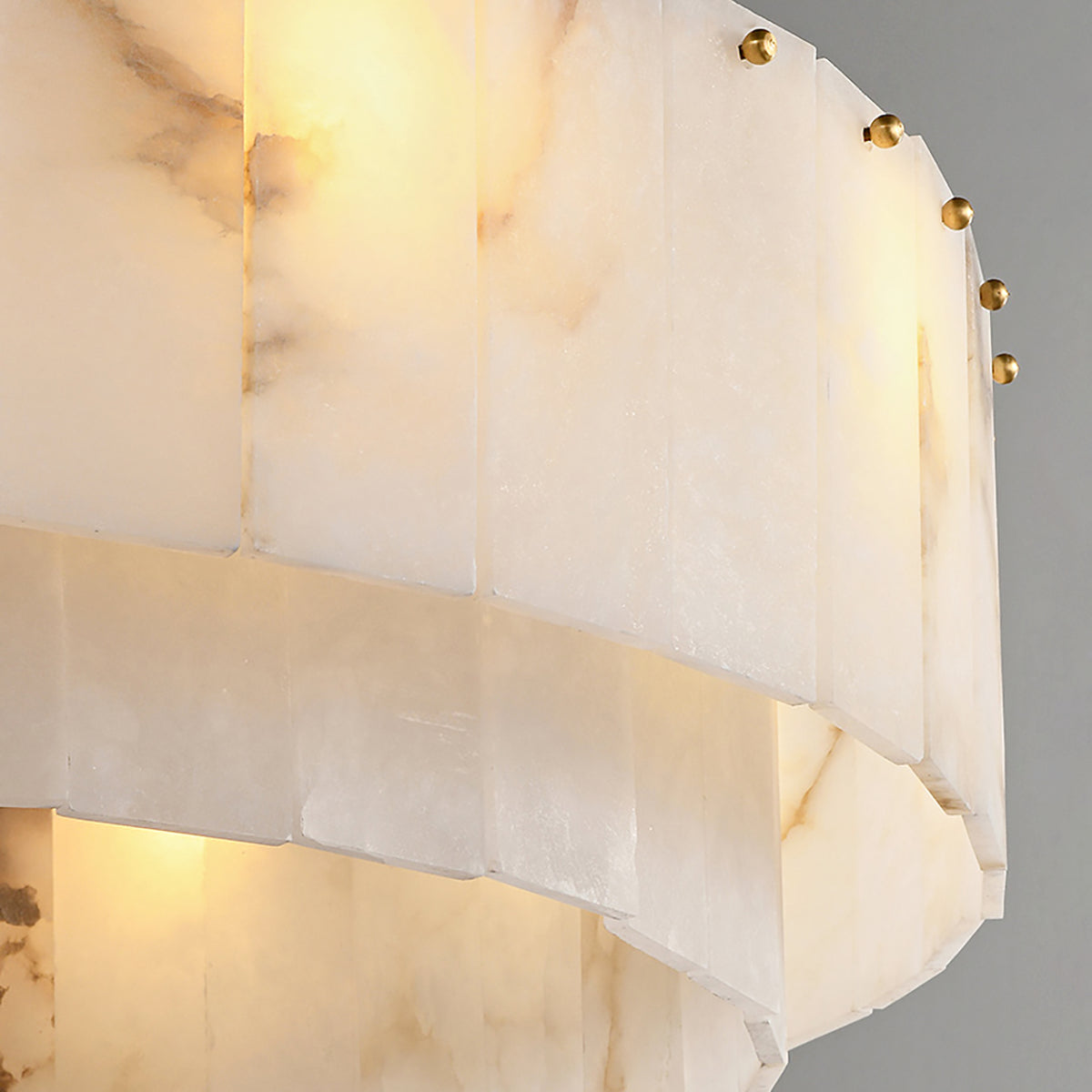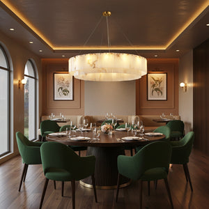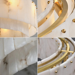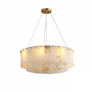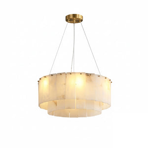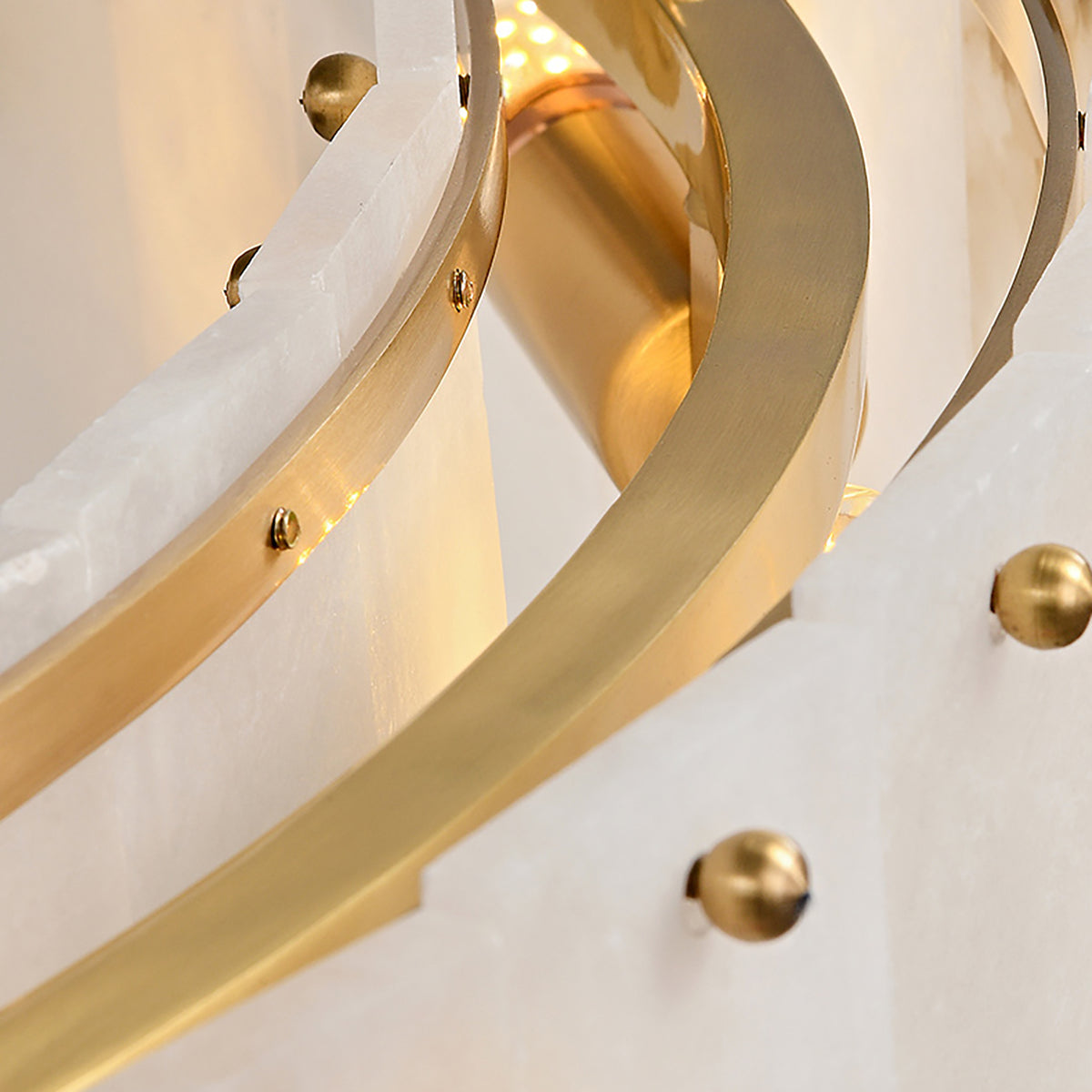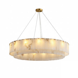 The Layered Alabaster Ring Chandelier perfectly blends luxury and natural aesthetics. Its body is constructed from layers of meticulously cut and polished alabaster stone panels. Its striking double or multi-tiered ring structure forms a sweeping, layered drum-like form, creating a powerful visual impact and a modern, sculptural quality. Supported by an exquisite brass frame and hanging hardware, it embodies the utmost quality and modern luxury. Whether hung above a luxurious dining table, a spacious living room, a hotel lobby, or a high-end commercial space, this chandelier instantly elevates the space and becomes an undisputed artistic centerpiece.