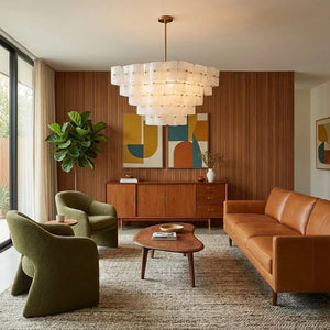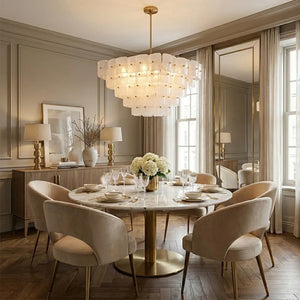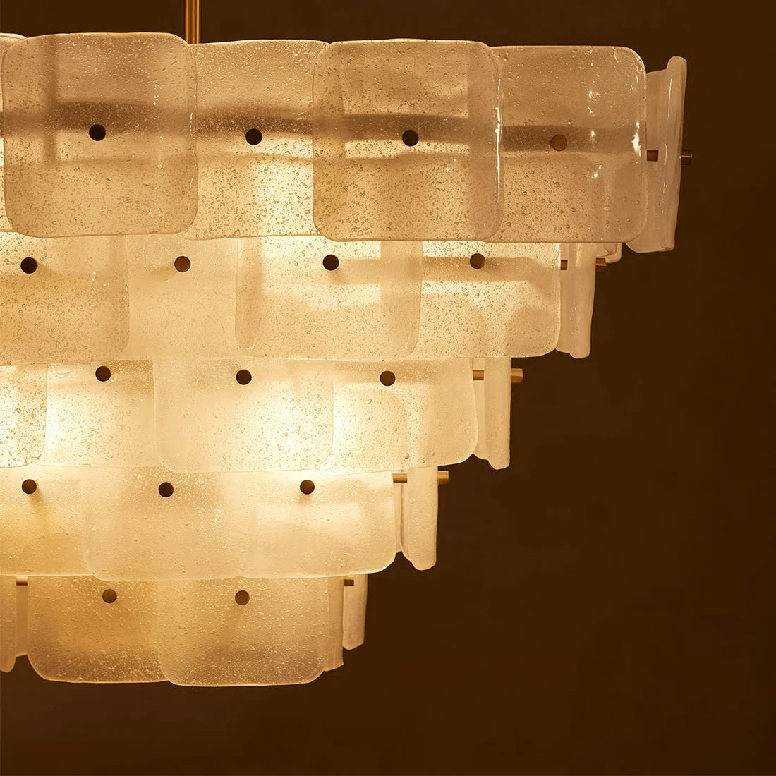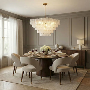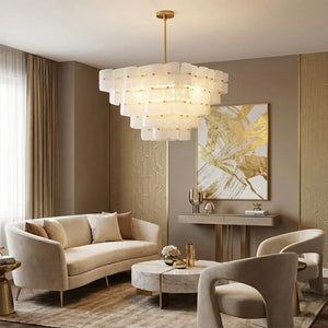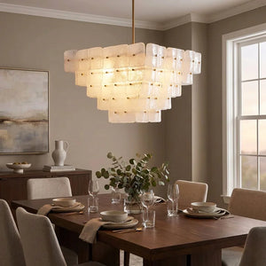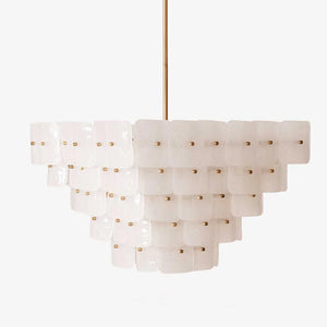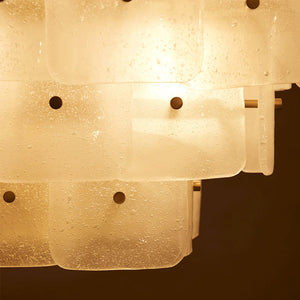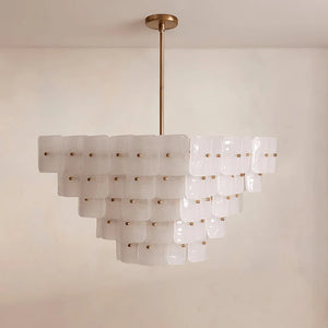 The Tiered Glass Chandelier presents a vertical, stepped silhouette formed by layers of white frosted bubble glass panels. Its orderly composition and soft visual weight make it a natural focal point for dining areas, stairwells, or open spaces where ceiling height can be fully appreciated.