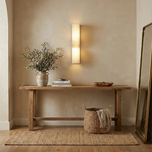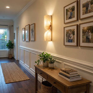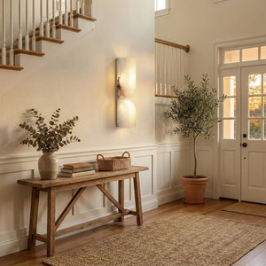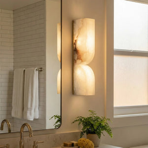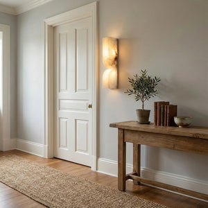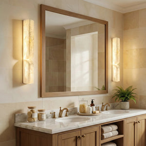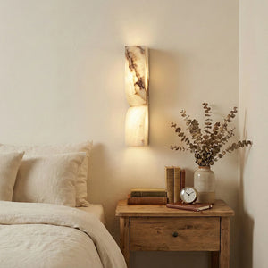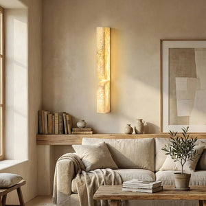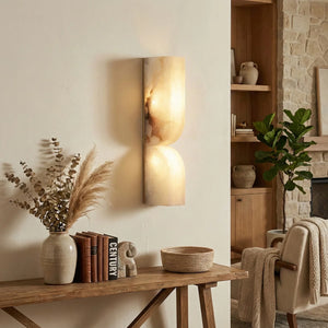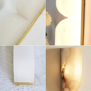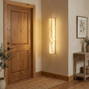 The Rectangular Essence Alabaster Wall Sconce seamlessly integrates artistry and ambiance into your space. More than just a light fixture, it's a profound statement of timeless design and natural beauty. Its slender and elegant structure is perfect for hallways, living rooms, or as a sophisticated accent beside a bed or mirror in a bedroom. Combining sculptural aesthetics with lighting functionality, it effectively elevates the style and depth of your interior space while providing practical illumination.
