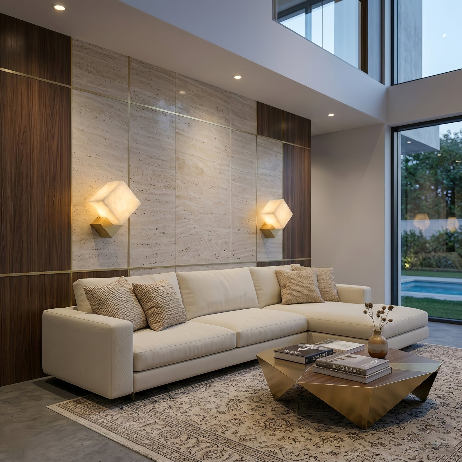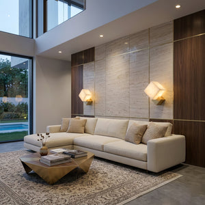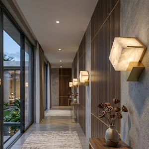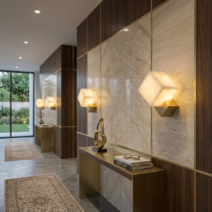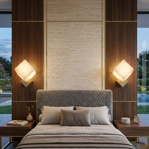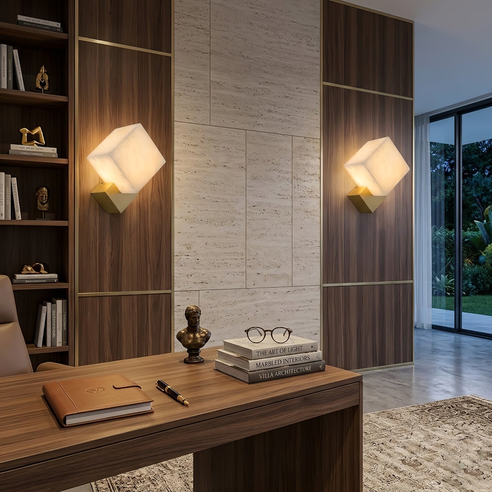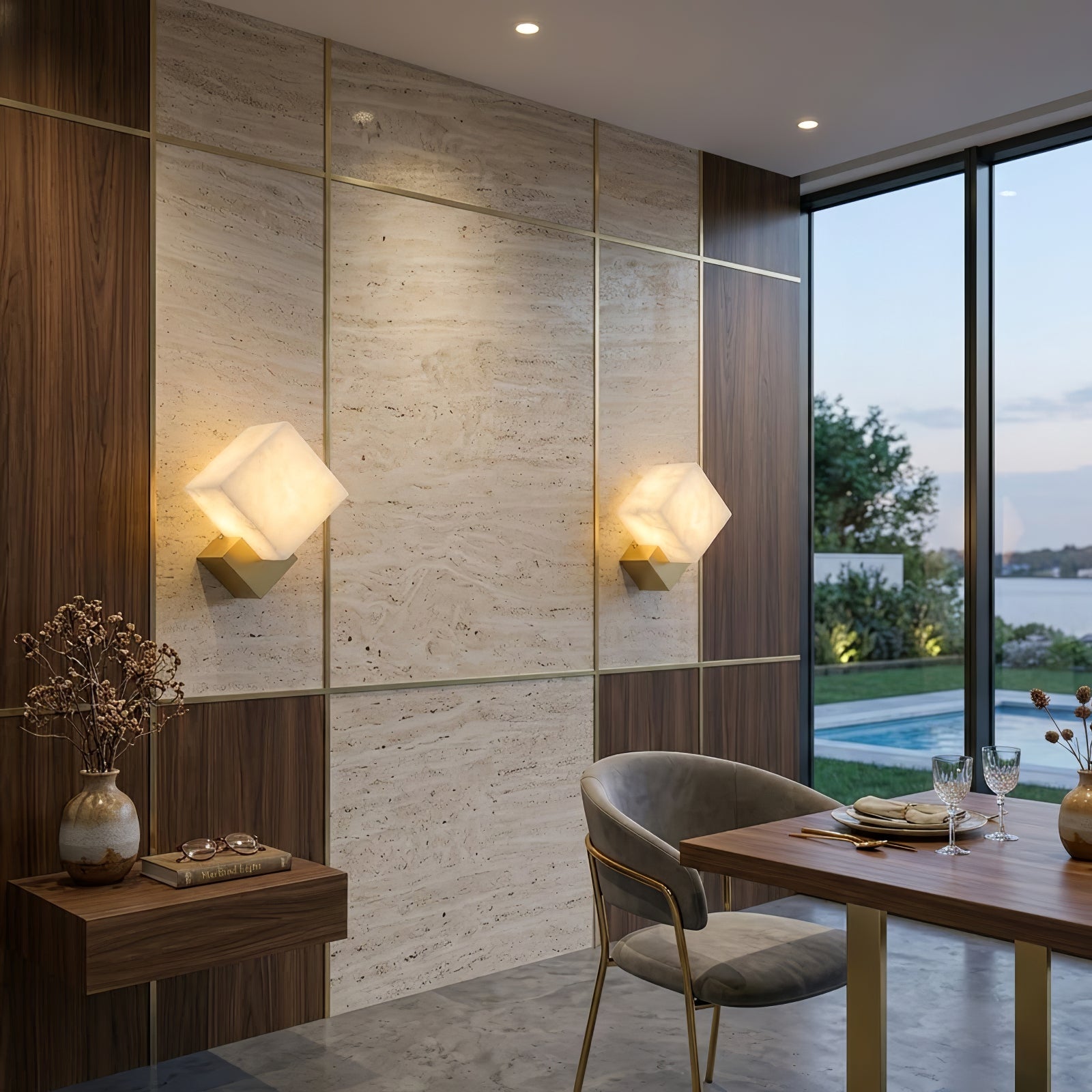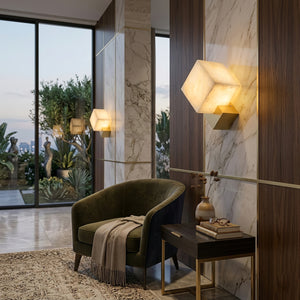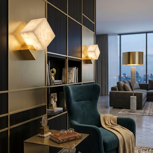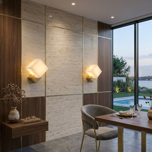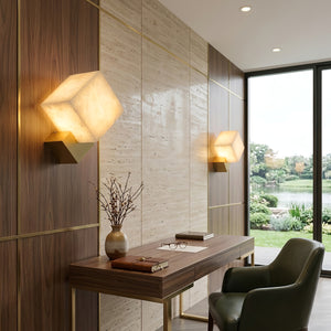 This sconce celebrates the raw beauty of hand-cut natural alabaster, meticulously paired with a heavy solid brass frame to strike a perfect balance between delicate artistry and industrial durability.the stone acts as a natural filter. It softens the light, transforming it into a warm, ethereal diffusion that casts a gentle, atmospheric radiance against your walls.Whether flanking a headboard in the bedroom, guiding the way through a hallway, or adding a layer of sophisticated accent lighting to a living room, this cube sconce provides more than just illumination—it creates an inviting sanctuary.