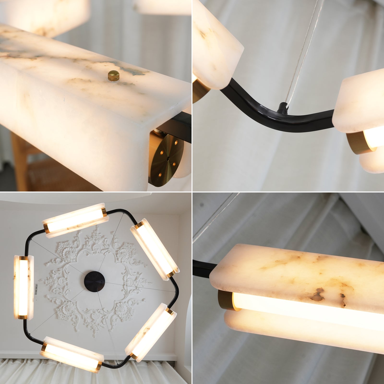 Each alabaster accent retains the unique natural texture of the stone. When light shines through the alabaster, it emits a soft, luminous glow. This geometric structure effortlessly complements contemporary interior design styles such as Italian light luxury, modern minimalist, and minimalism.