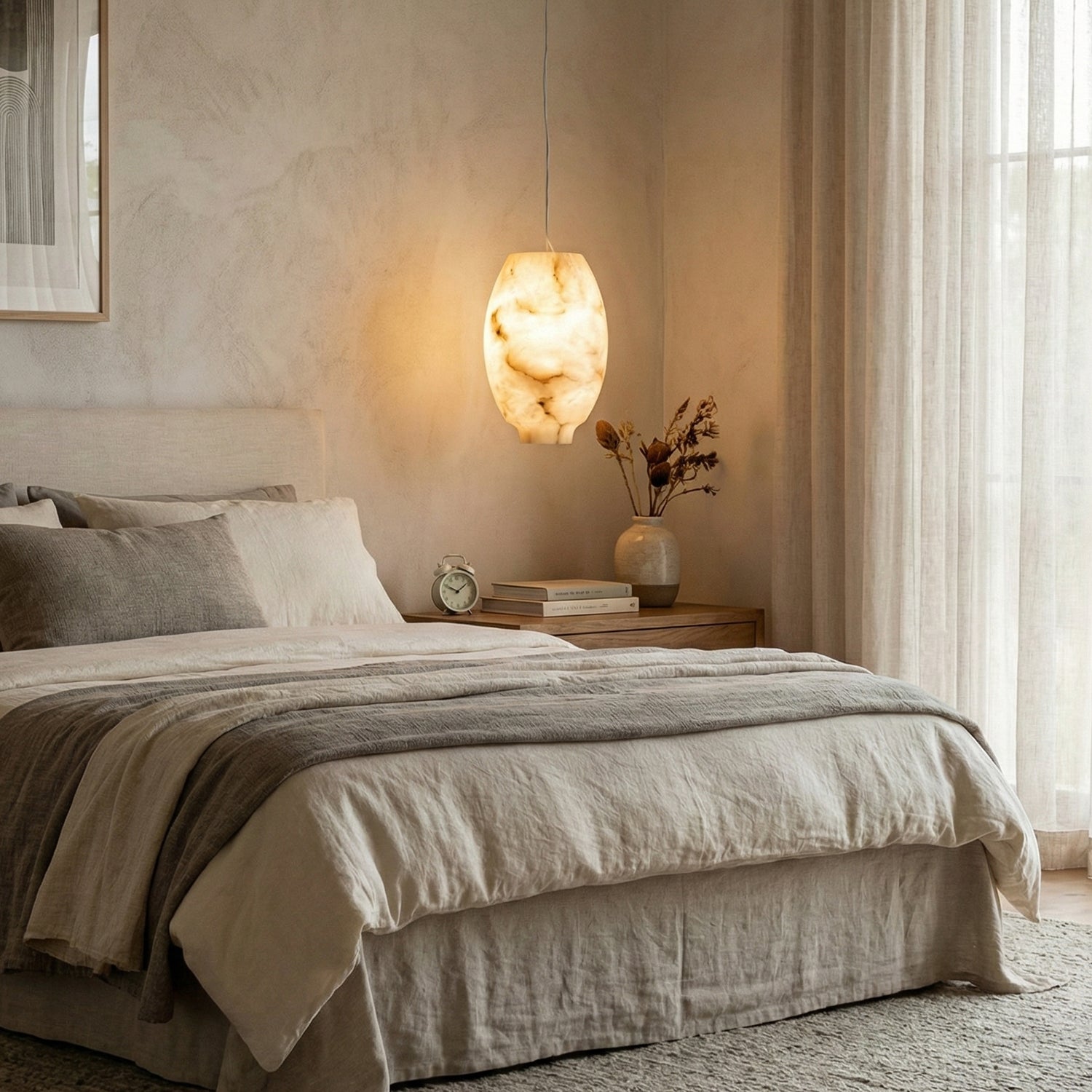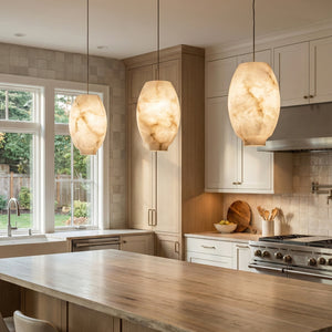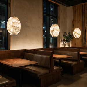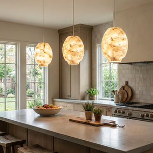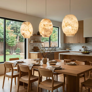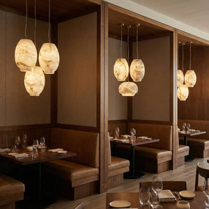 Featuring a classic dome design, its clean yet gentle curves effortlessly complement various modern or French interior styles. This shape focuses and directs light downwards, instantly elevating the ambiance of any dinner setting. Made from high-quality natural alabaster, this rare material possesses a warm, luminous glow that no artificial material can replicate. Each lamp retains the unique texture of the stone, making it a one-of-a-kind artistic display piece. Thanks to the natural translucent properties of alabaster, it achieves precise soft light control, transforming harsh light sources into gentle, diffused light, creating a warm and inviting atmosphere.