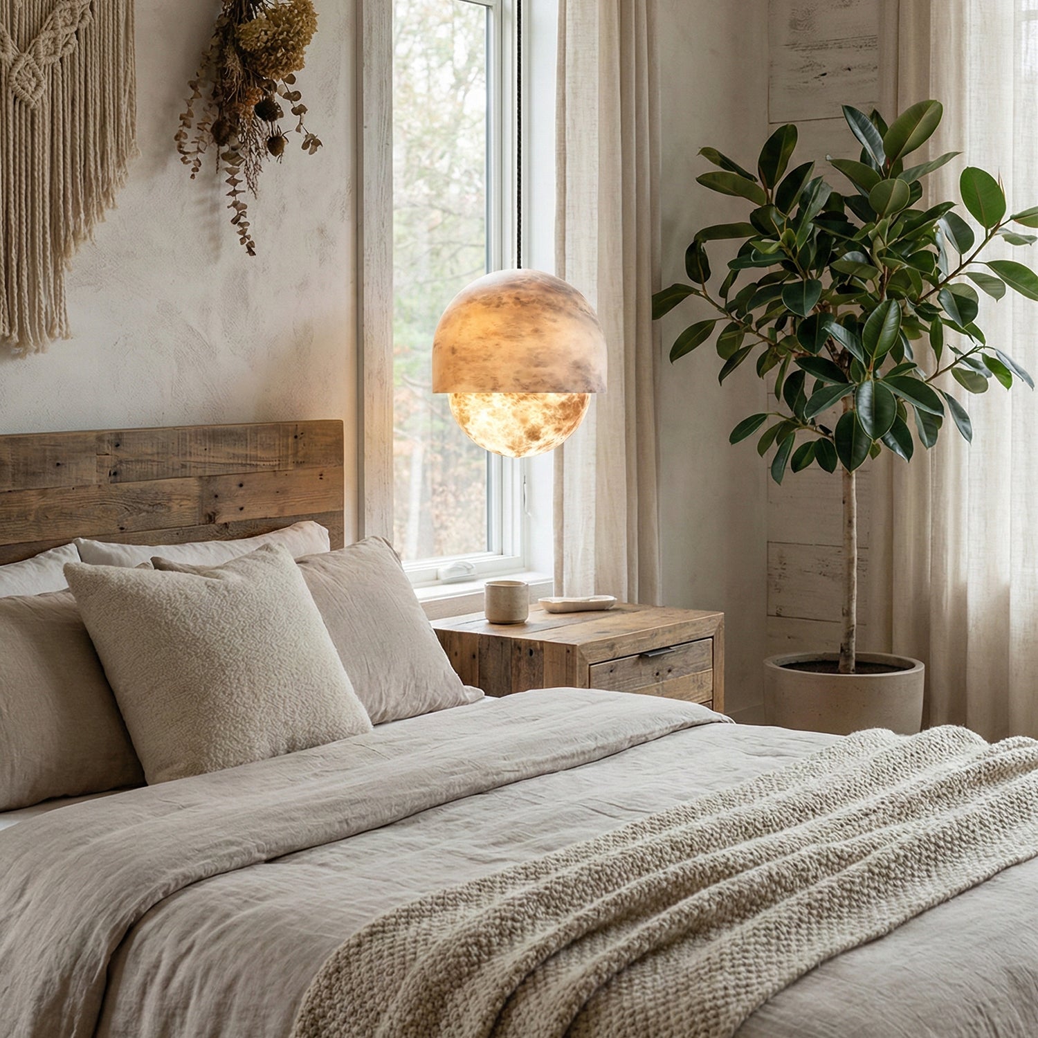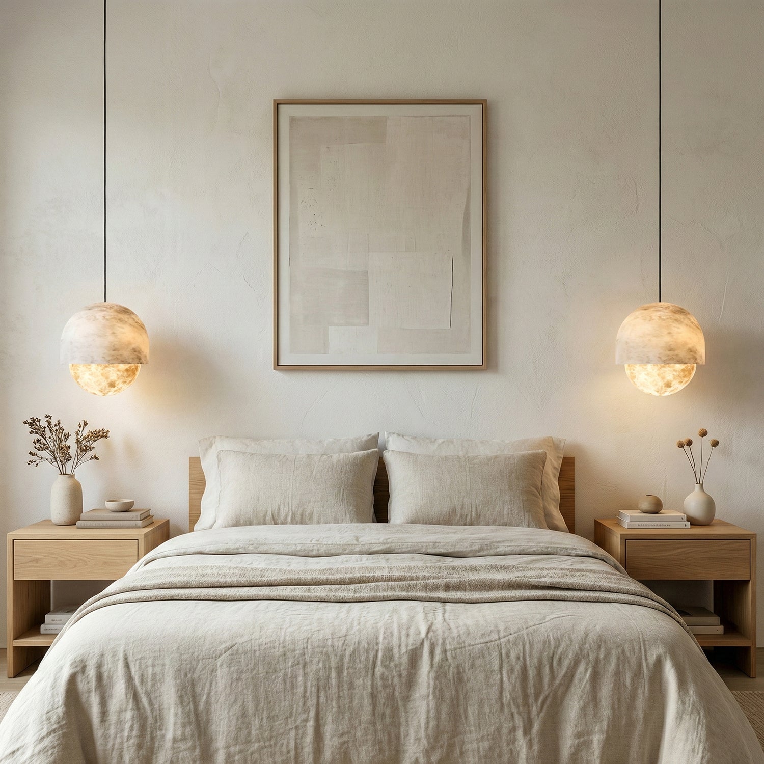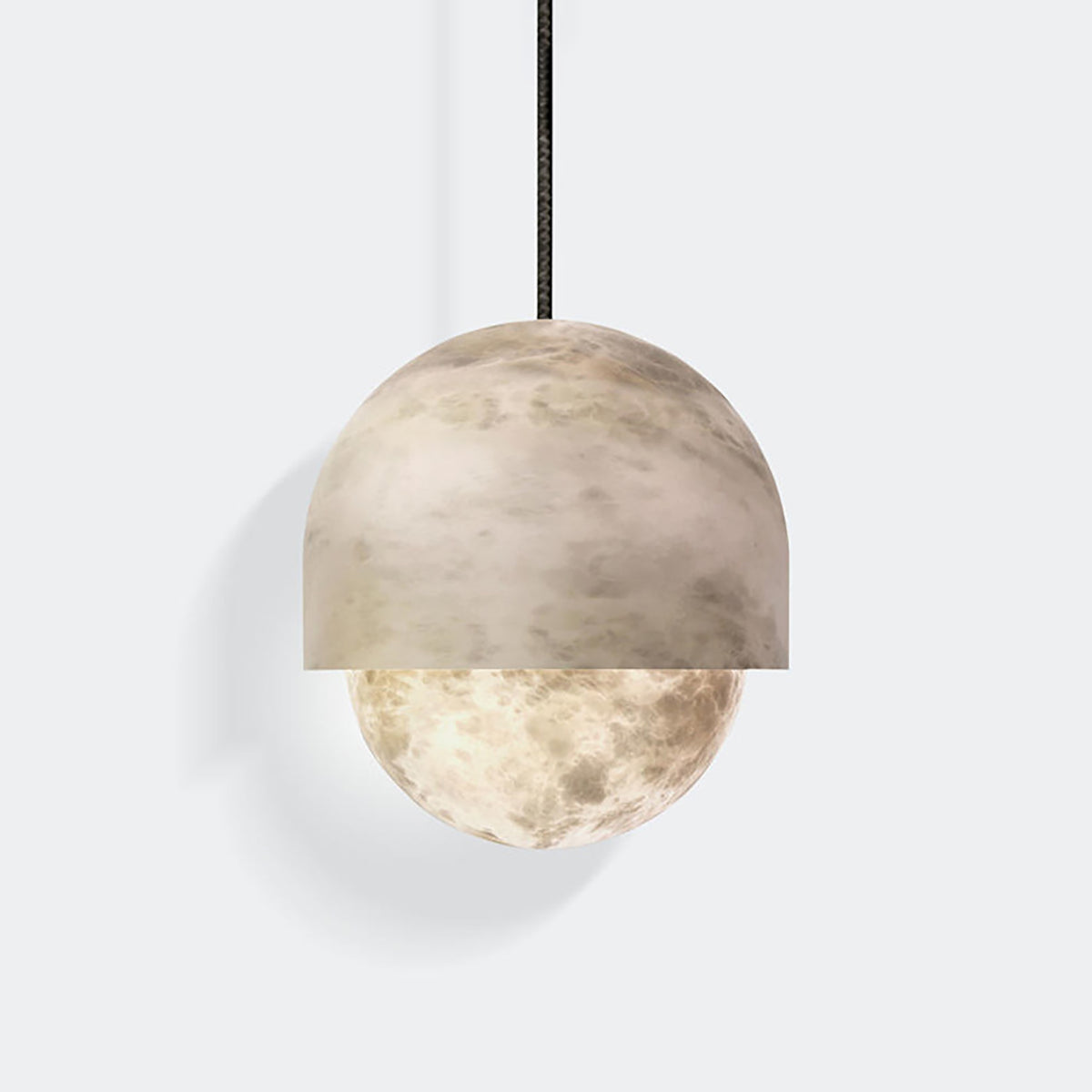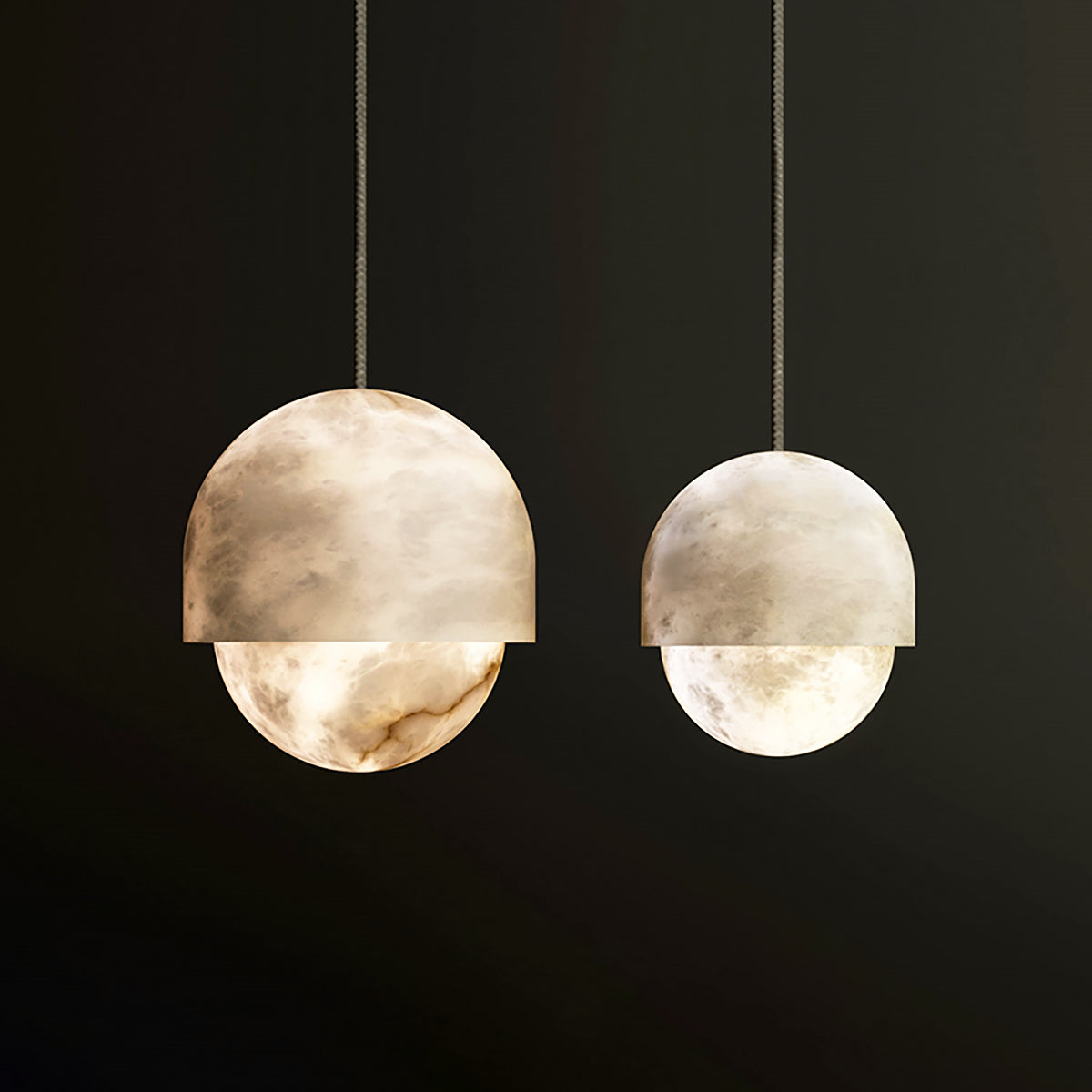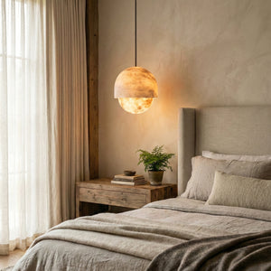 Each lamp is meticulously crafted from carefully selected natural alabaster. The unique texture inherent in the stone's surface subtly reveals itself when light shines through, as if suspending a miniature moonlit sky within the room. It not only provides a captivating visual centerpiece but its natural translucent properties also transform the light source into a soft, diffused warm glow.