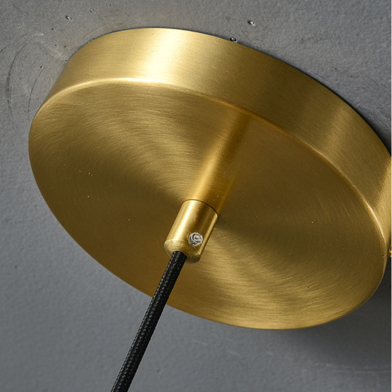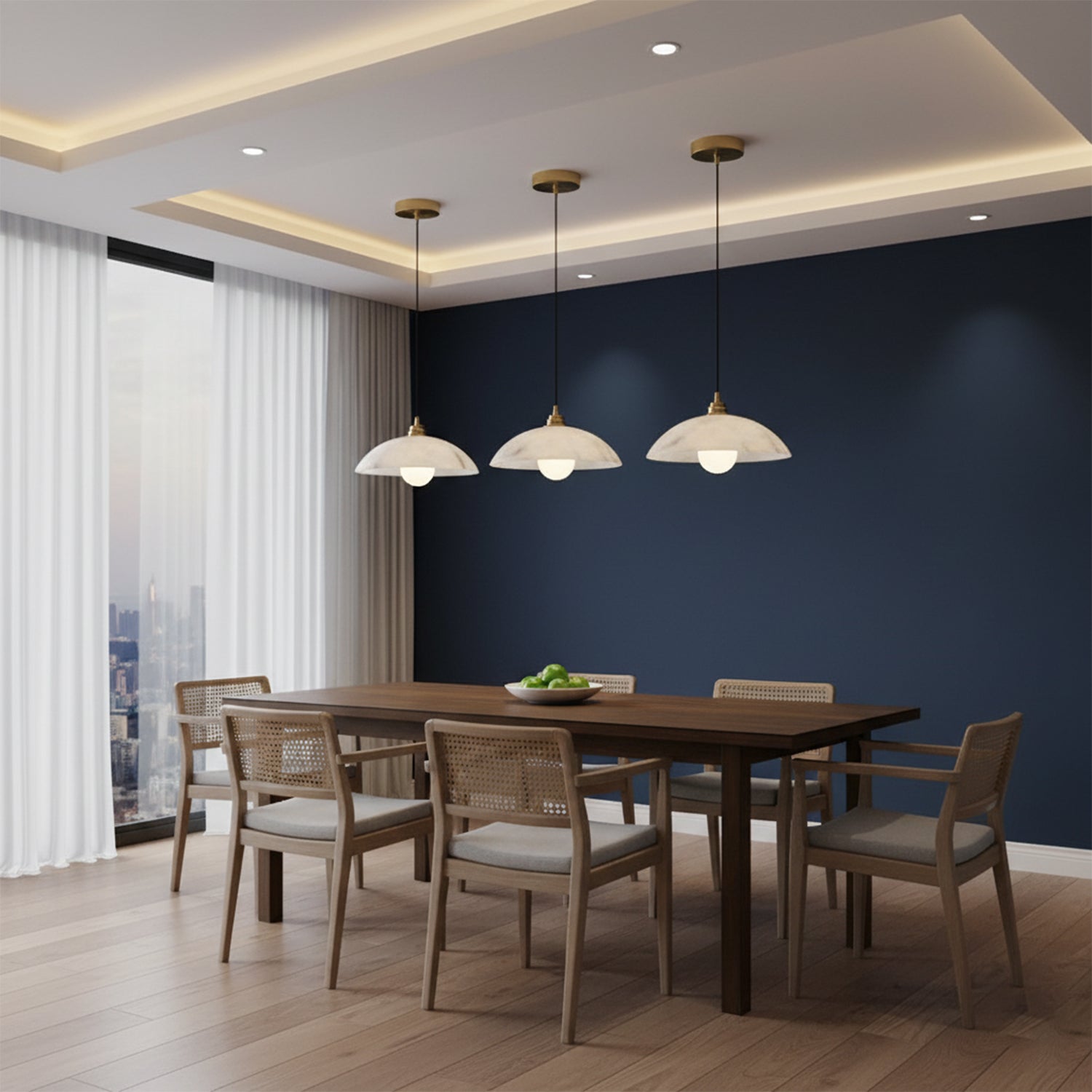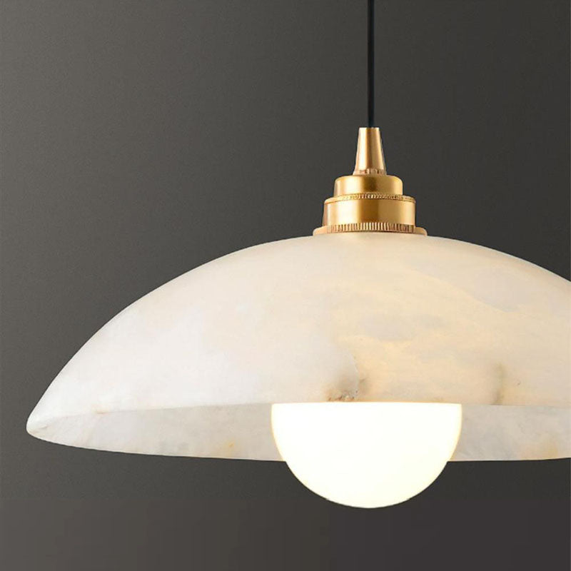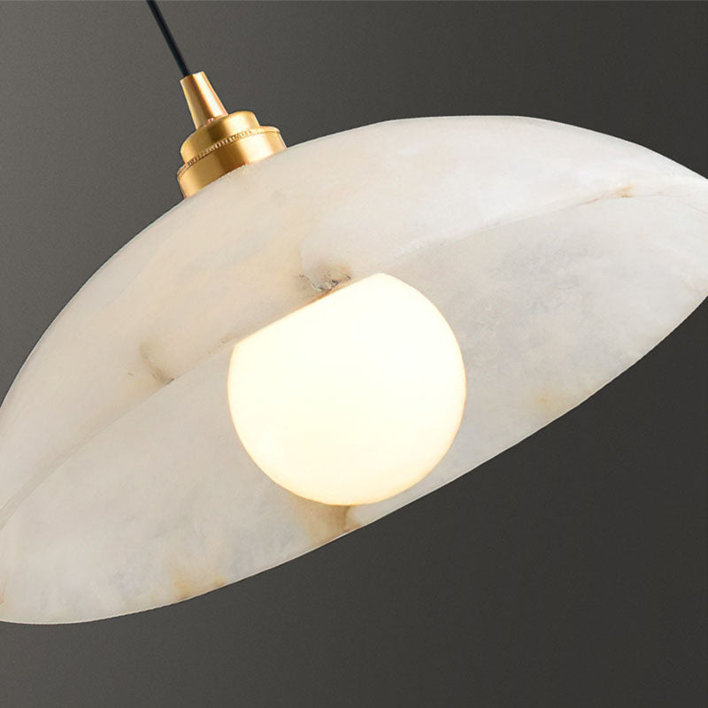 This exquisite pendant light offers an aura of understated luxury and tranquility, perfectly suited for modern, minimalist, or Nordic-inspired interiors. The design is elegantly simple: a shallow, dome-shaped shade suspended by a dark cord. The shade is crafted from natural alabaster, a translucent stone that beautifully diffuses the light, highlighting its subtle, unique veining. A small, refined brass accent connects the shade to the cord, providing a touch of warm metallic contrast. When illuminated, the light filters through the stone to cast a soft, ambient glow, making it ideal for defining a specific area such as a reading nook, a bedside table, or used in multiples over a kitchen counter.