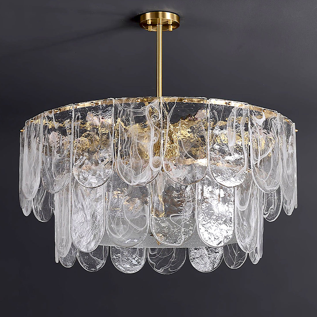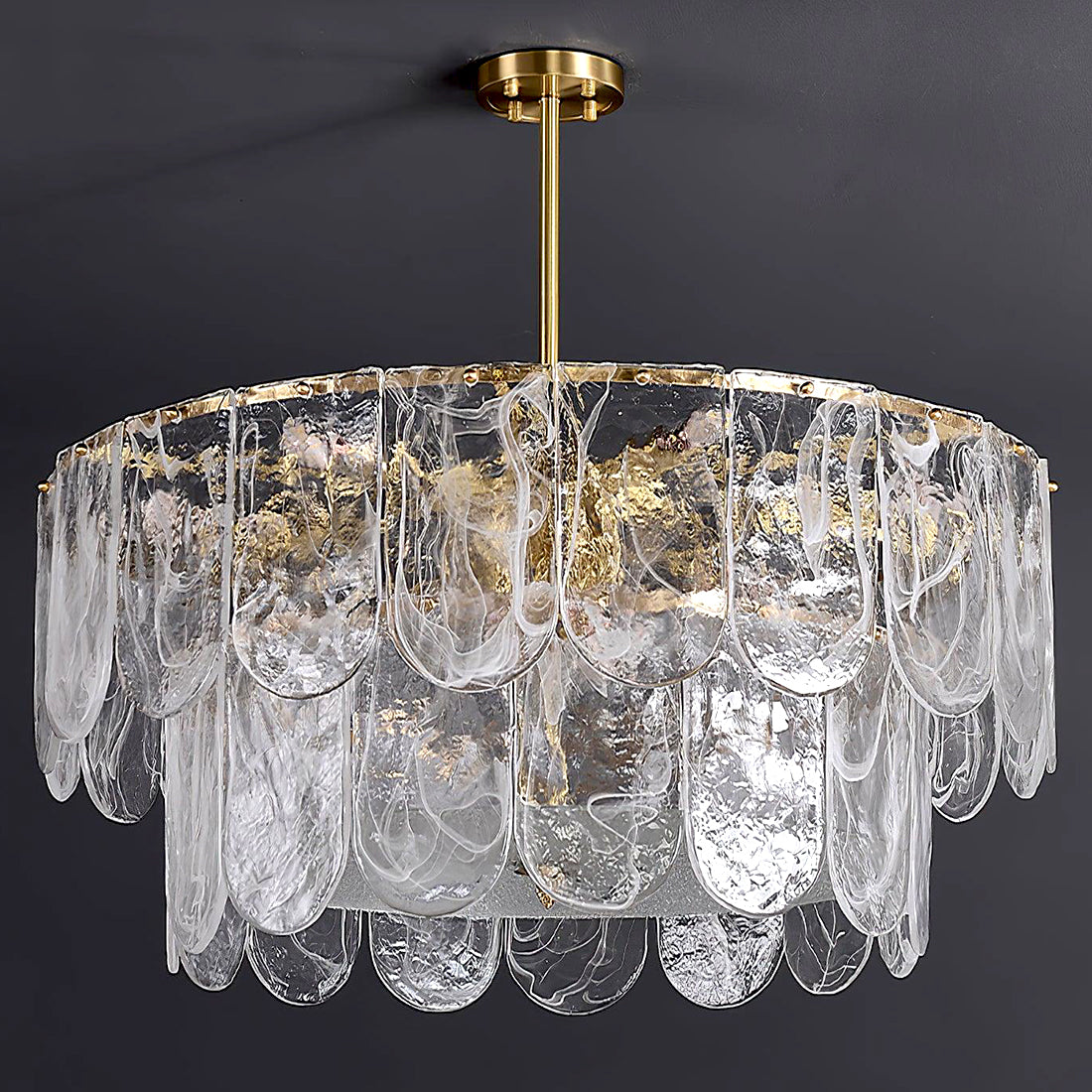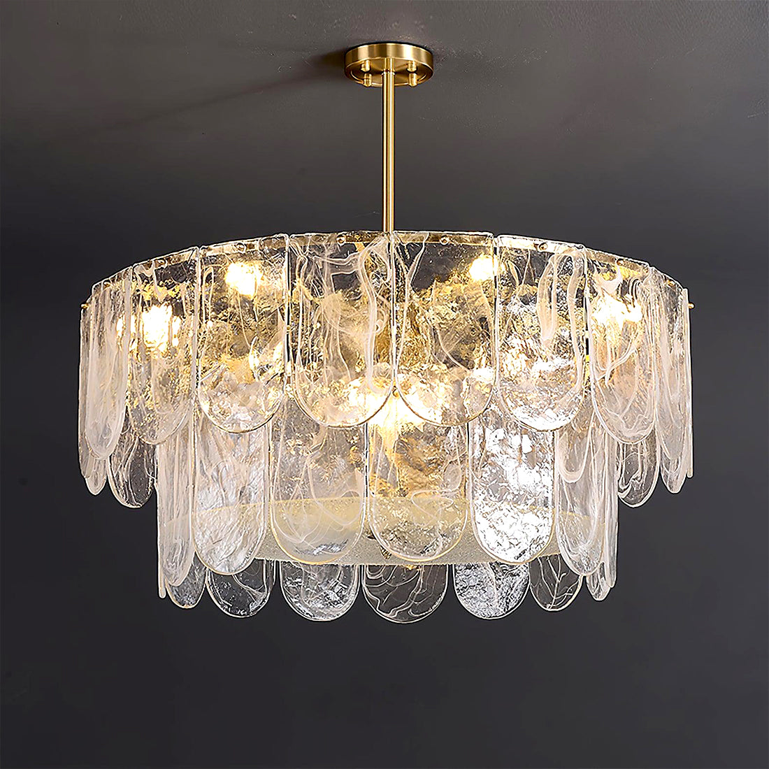 Features individual, hand-crafted glass panels with a unique flow-sand texture that creates a soft, mesmerizing light effect.