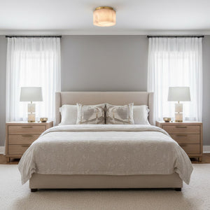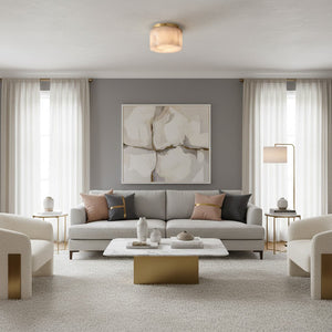Minimalist in form, dramatic in effect, our Rivage Round ceiling lampby Timothy Oulton celebrates the beauty of calcite, a translucent stone with a warm, natural glow. Polished sheets of stone are expertly pieced to create a smooth, continuous surface, while subtle illumination from within highlights the organic coloration and veining. Each fixture is a one-of-a-kind statement.