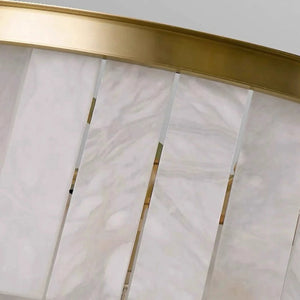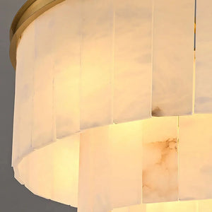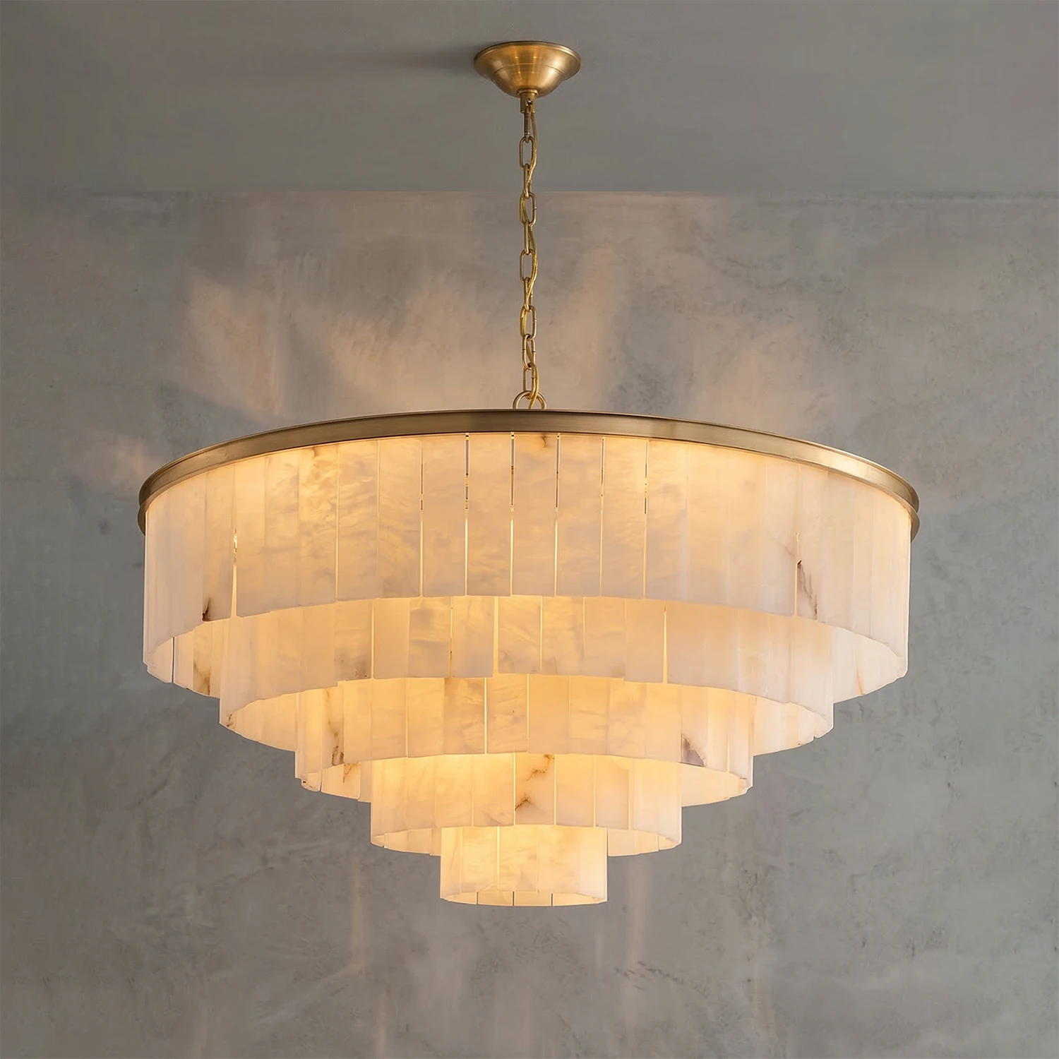 This Tiered Natural Alabaster Chandelier perfectly embodies Art Deco style with its flowing architectural lines and rich white marble texture. This exquisitely crafted pure copper chandelier features hand-selected natural alabaster lampshades suspended from a high-quality gold-plated/brass rust-resistant frame.