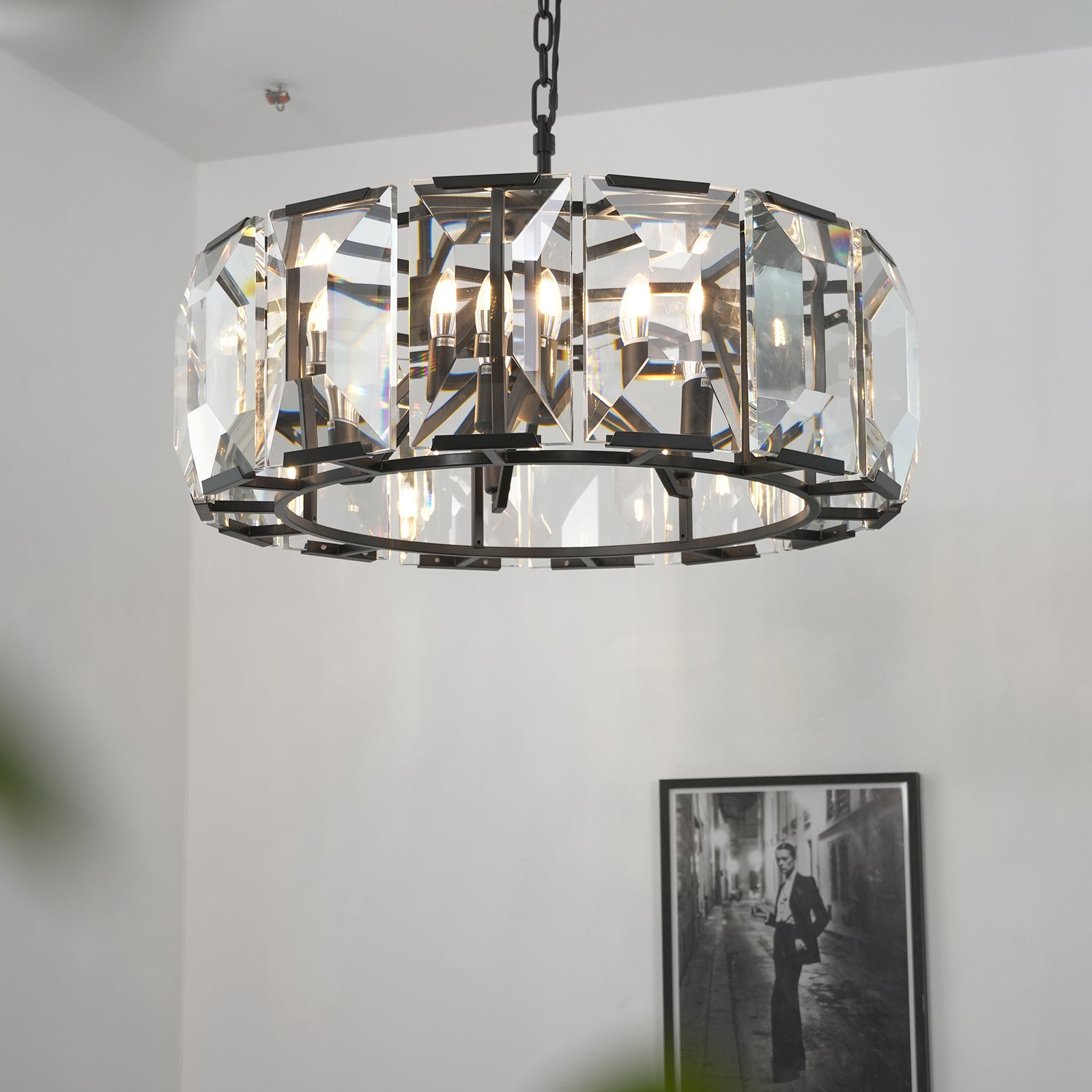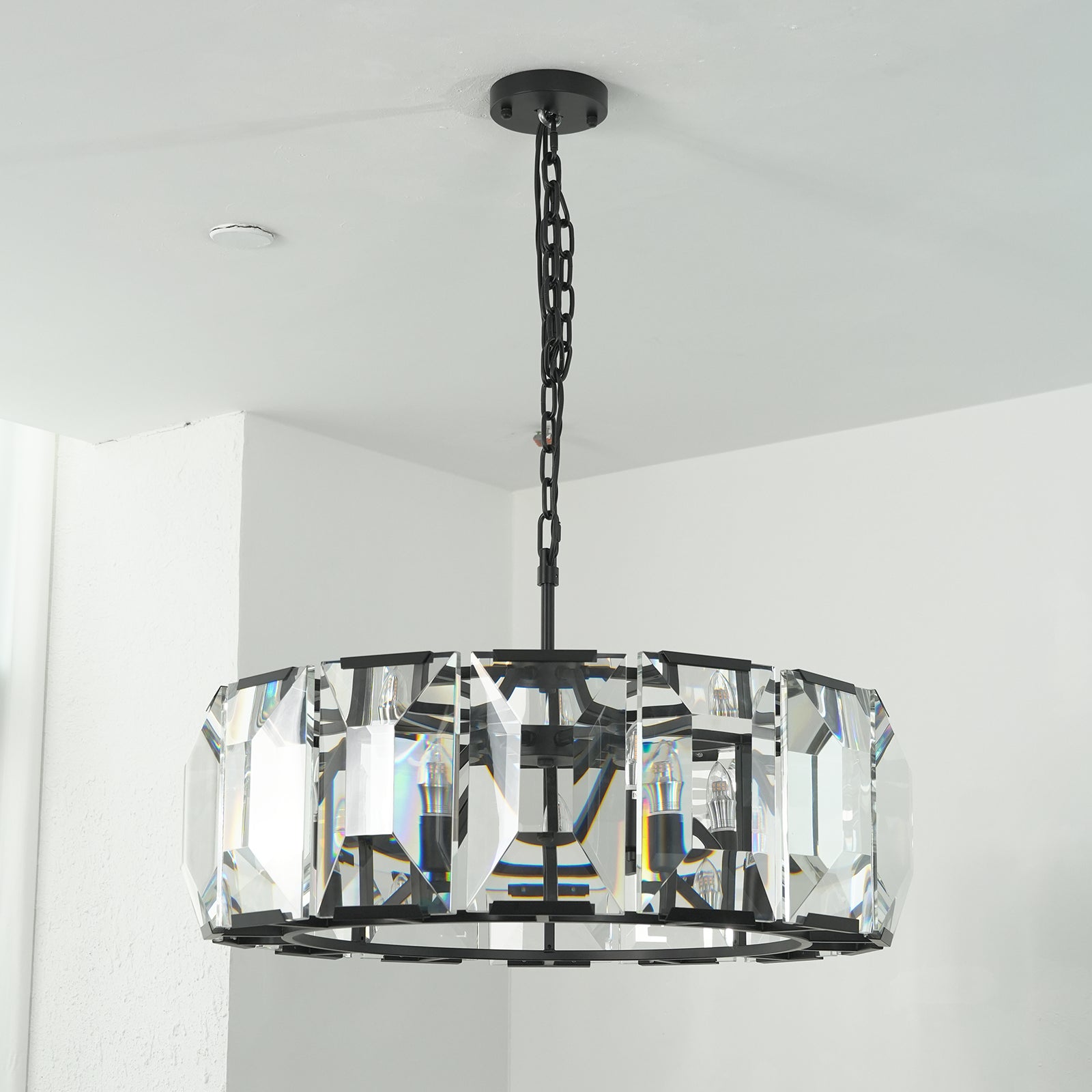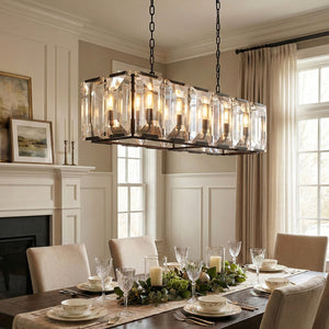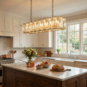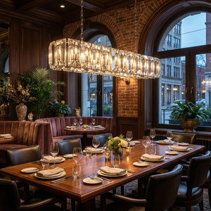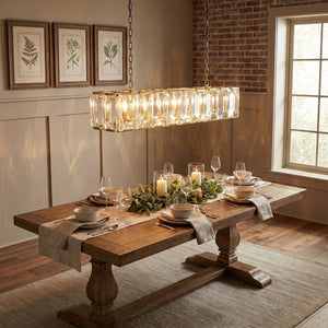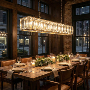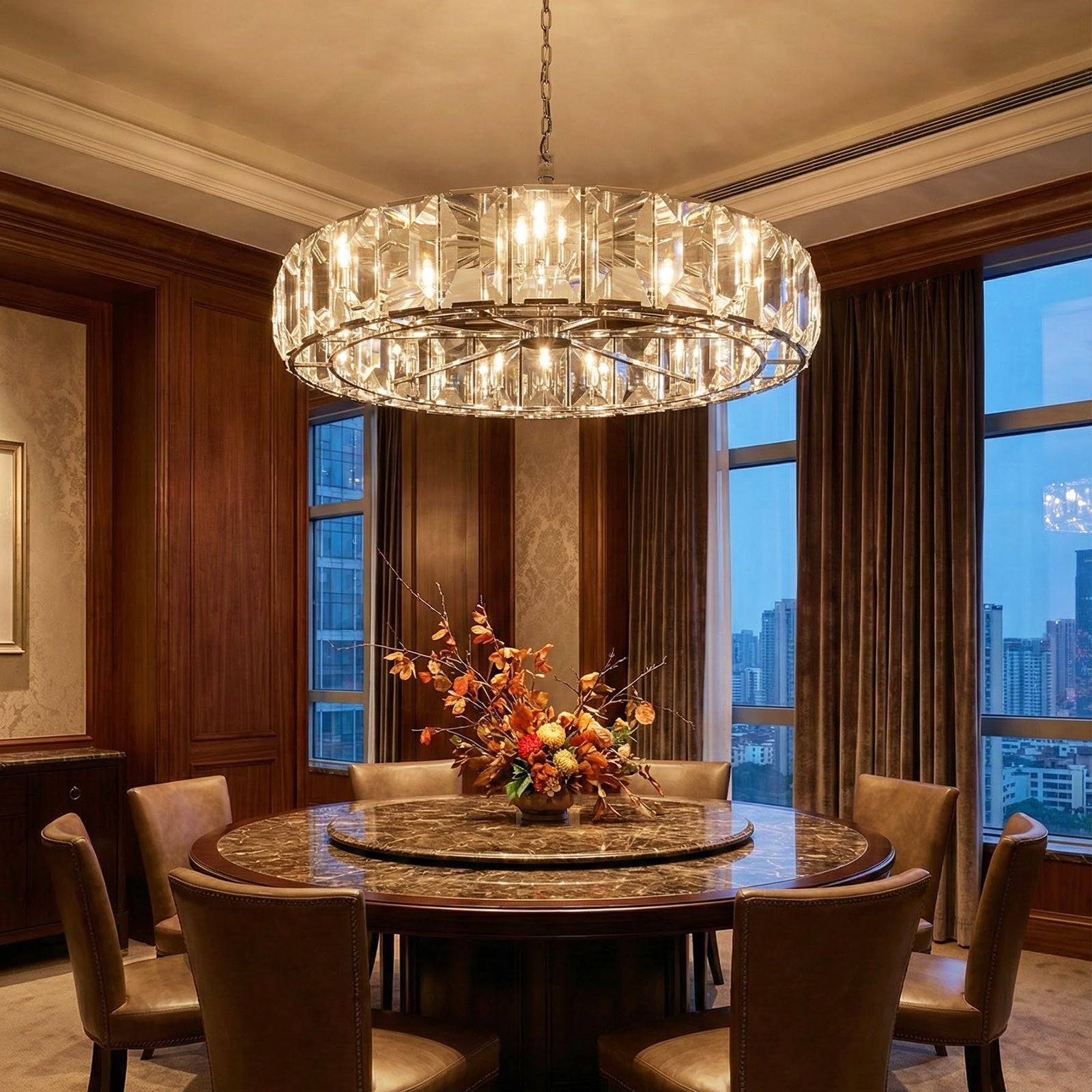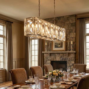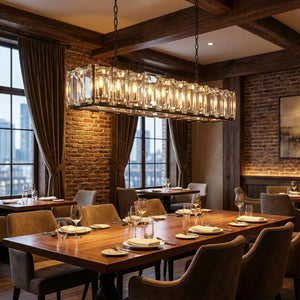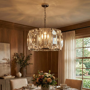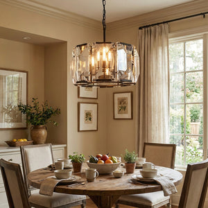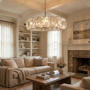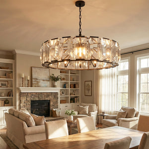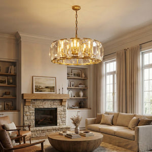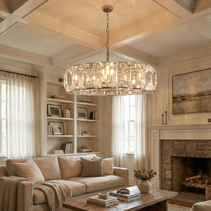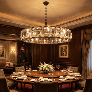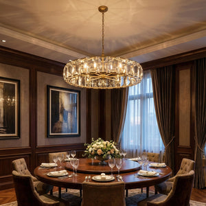 Crafted from high-quality K9 crystal and a brass frame, each crystal panel is precisely geometrically cut, showcasing its transparent refractive index, which complements the substantial brass base. The chandelier features neatly arranged crystal layers, creating a stable circular silhouette. Through minimalist lines, it displays a subtle yet luxurious modern aesthetic, adding timeless artistic charm to the space. Utilizing the superior light transmission and control properties of the crystal, light penetrates the multiple layers, creating captivating refraction and emitting an exceptionally brilliant and even warm light. This design effectively eliminates harsh shadows, creating a warm, inviting, and sophisticated home environment.