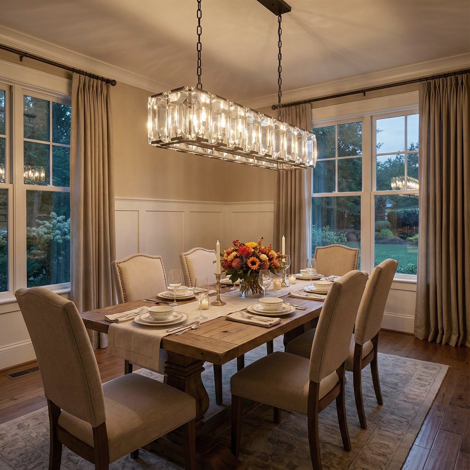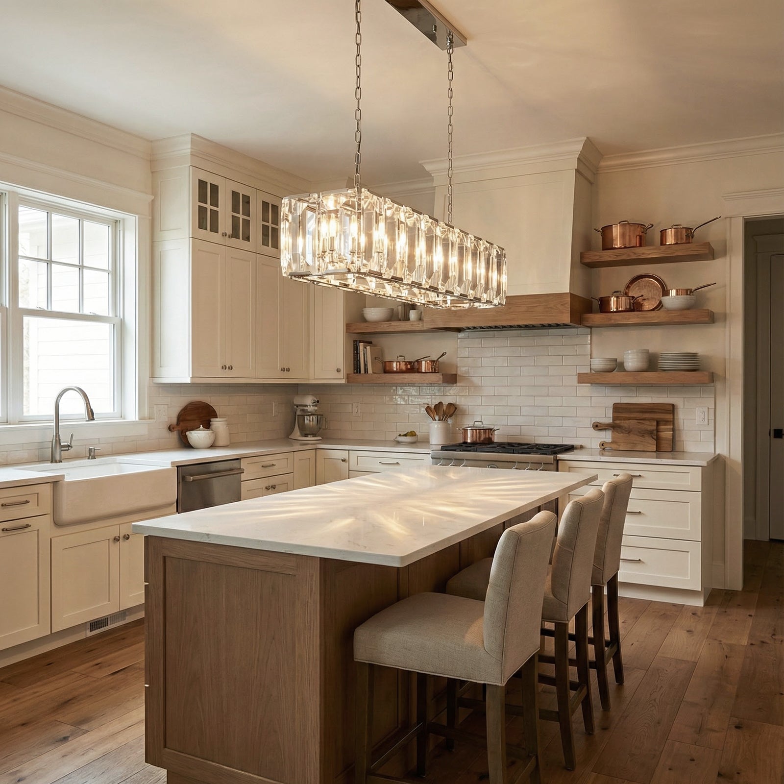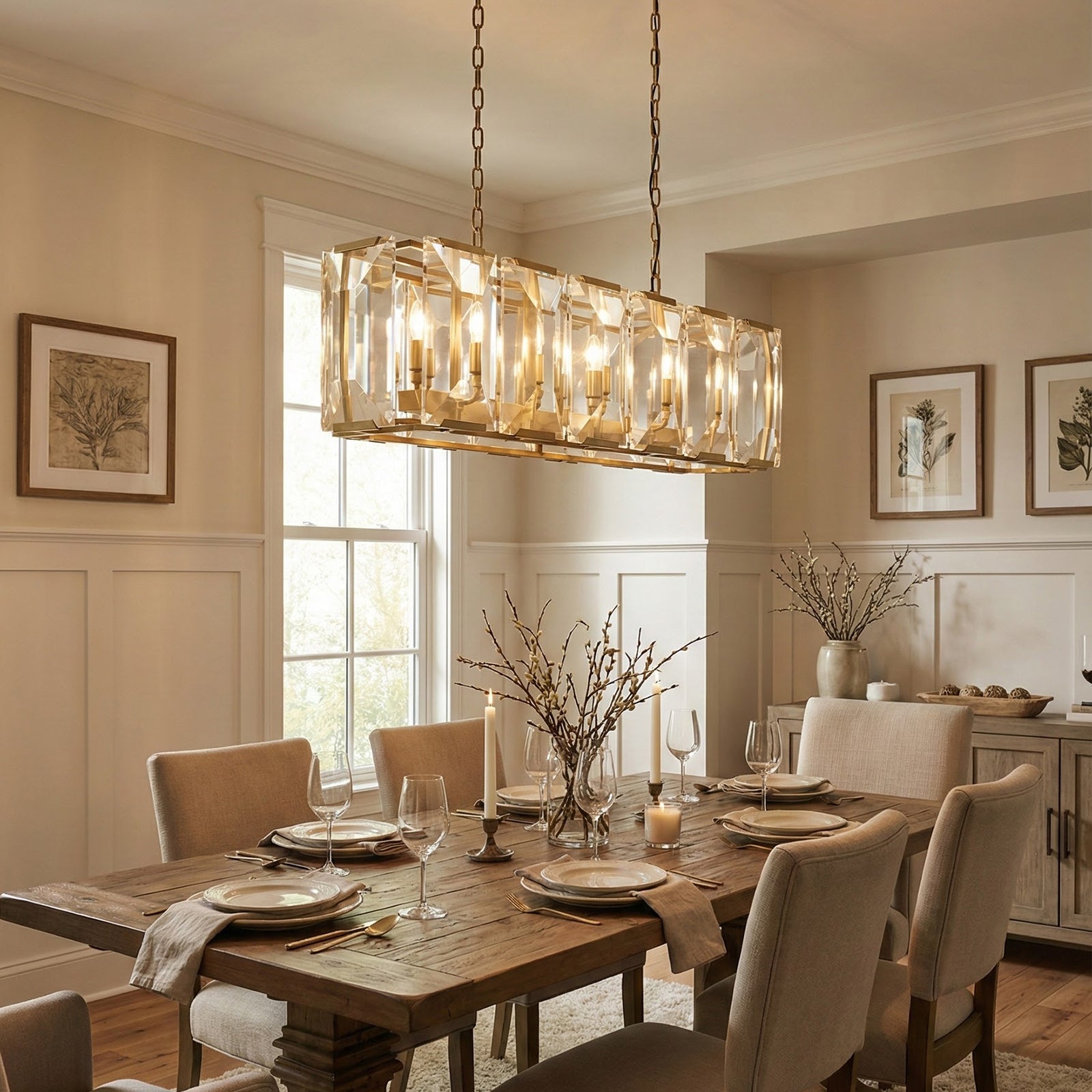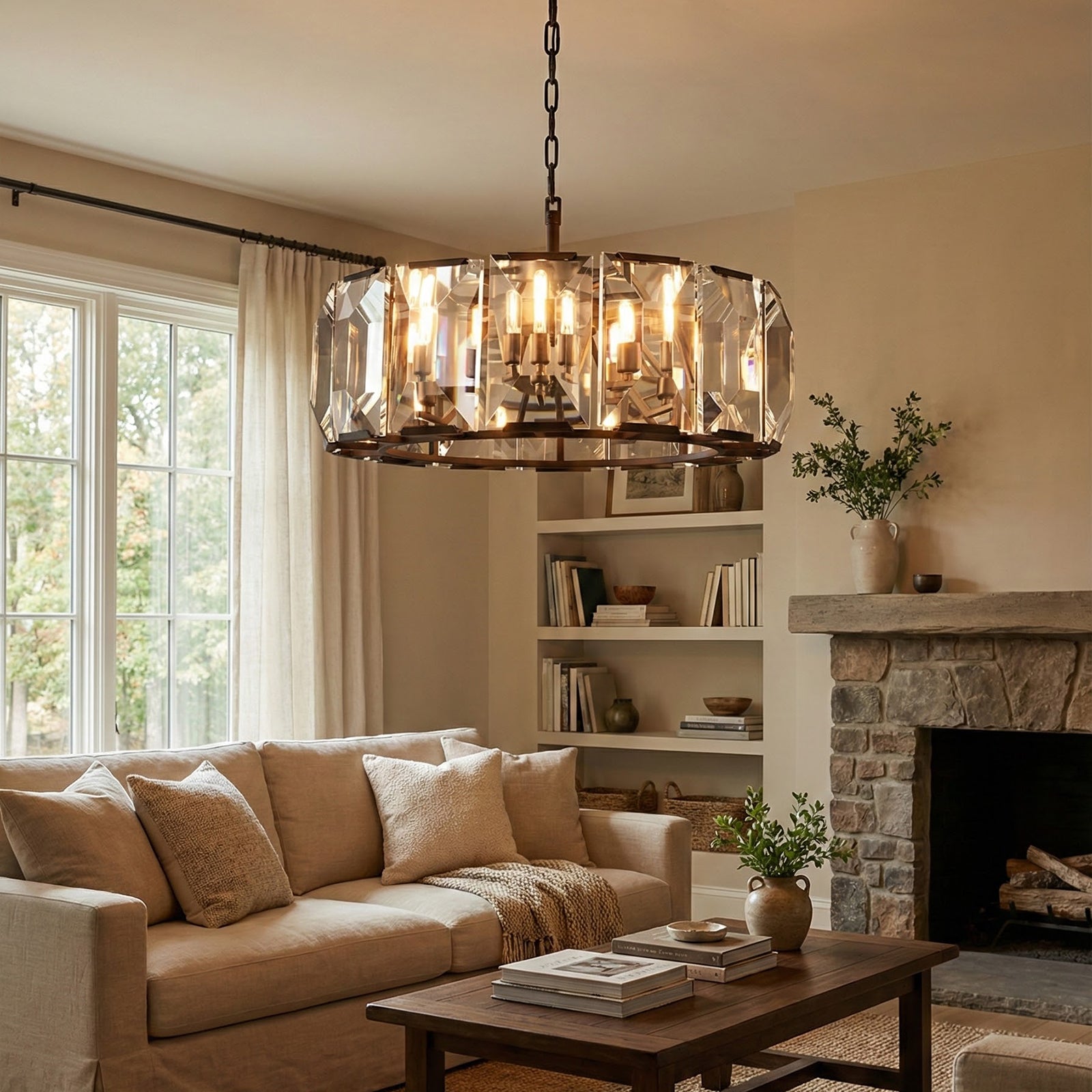 Crafted from high-quality K9 crystal and a brass frame, each crystal panel is precisely geometrically cut, showcasing its transparent refractive index, which complements the substantial brass base. The chandelier features neatly arranged crystal layers, creating a stable circular silhouette. Through minimalist lines, it displays a subtle yet luxurious modern aesthetic, adding timeless artistic charm to the space. Utilizing the superior light transmission and control properties of the crystal, light penetrates the multiple layers, creating captivating refraction and emitting an exceptionally brilliant and even warm light. This design effectively eliminates harsh shadows, creating a warm, inviting, and sophisticated home environment.