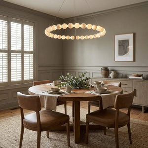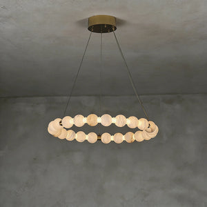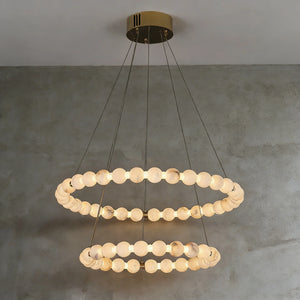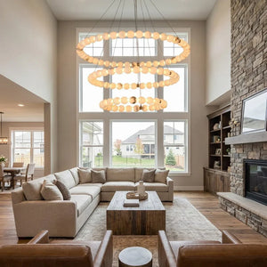 This Alabaster Beaded Ring Chandelier is a masterpiece of organic elegance, defined by its stunning sequence of hand-polished alabaster spheres that form luminous geometric rings. Each orb showcases the unique, ethereal veining inherent to natural stone, ensuring that no two fixtures are exactly alike. When illuminated, the alabaster diffuses a soft, warm glow that highlights its translucent beauty, creating an atmosphere of refined serenity.