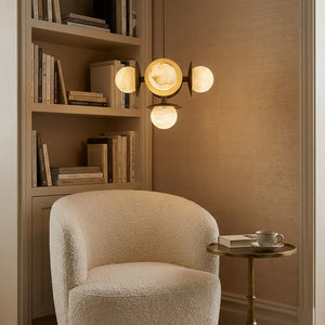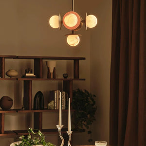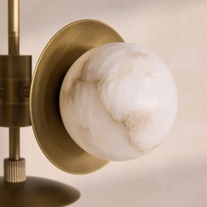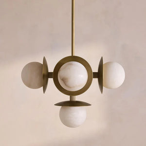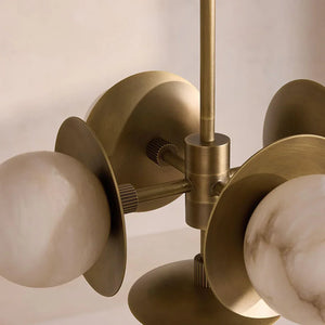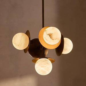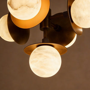 Circular metal plates positioned behind the alabaster orbs add visual layering and depth, framing each stone sphere while enhancing the overall geometry. The natural veining of the alabaster brings subtle variation to every piece, allowing the chandelier to express warmth and material richness through form and texture rather than repetition.