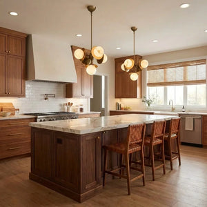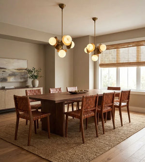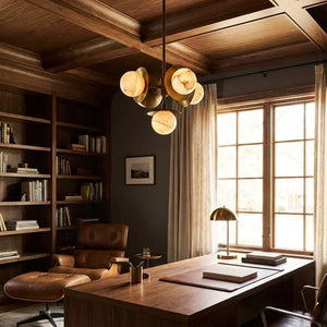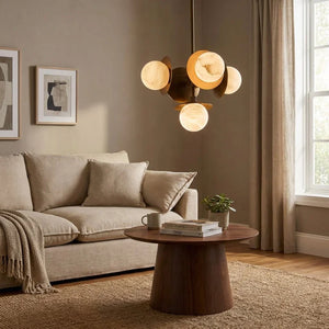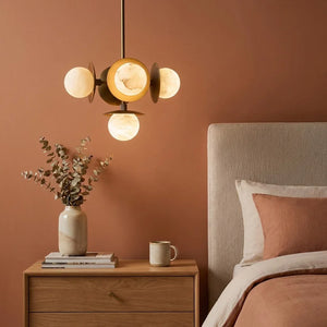 The Alabaster Orb Cluster Chandelier is composed of multiple glowing alabaster spheres arranged around a compact central structure, creating a balanced, three-dimensional composition. Each orb appears to float independently, giving the chandelier a dynamic yet controlled presence that works well in dining areas, bedrooms, or intimate living spaces.