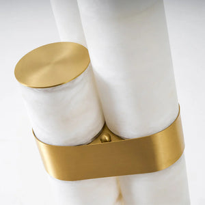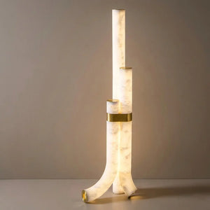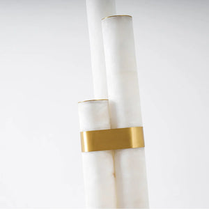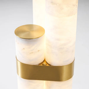 Formed from natural alabaster, the cylindrical body reveals subtle veining and translucency that soften the light as it passes through. The stone gently diffuses illumination to create a warm, ambient effect, enhancing the room through material richness and restrained elegance rather than decorative detail.