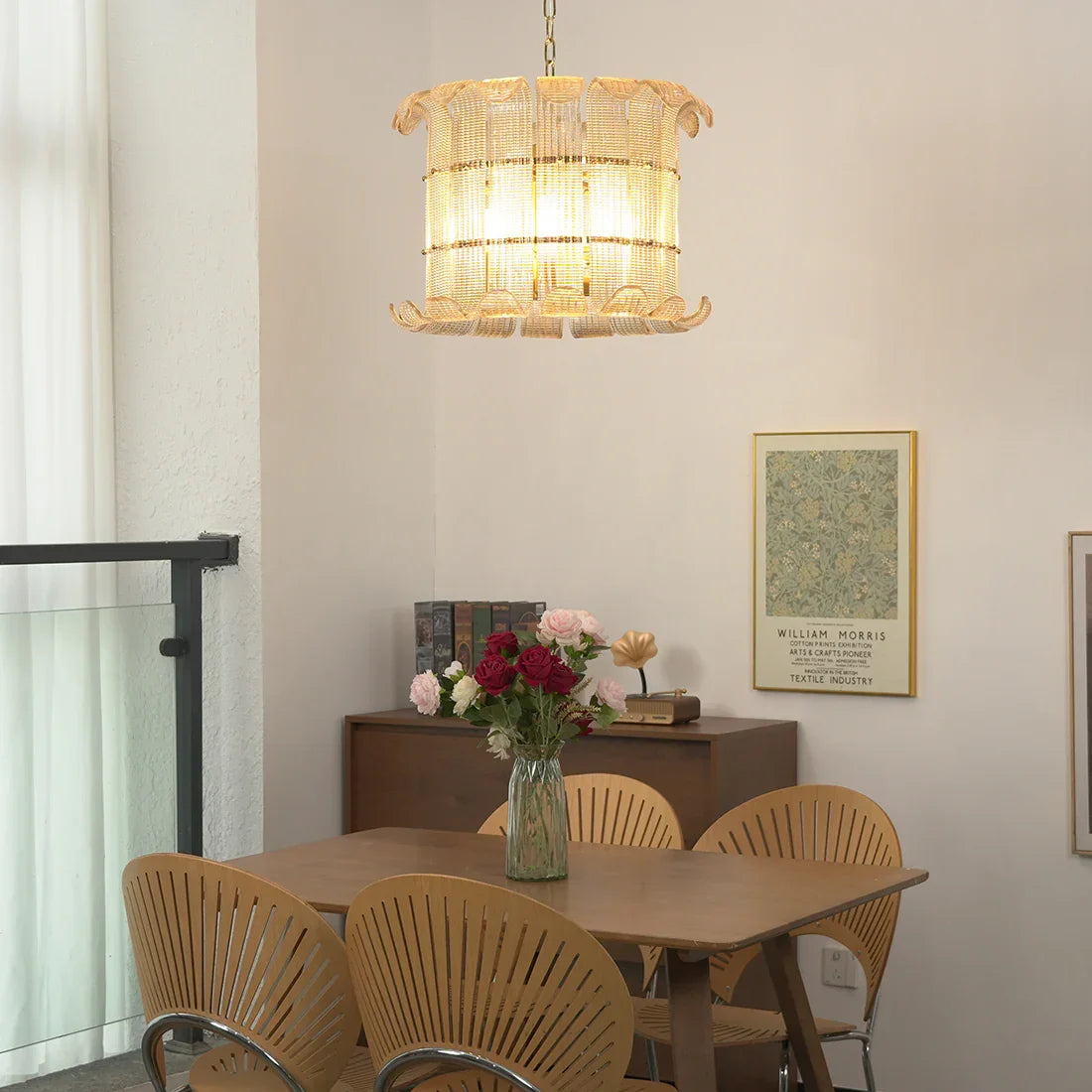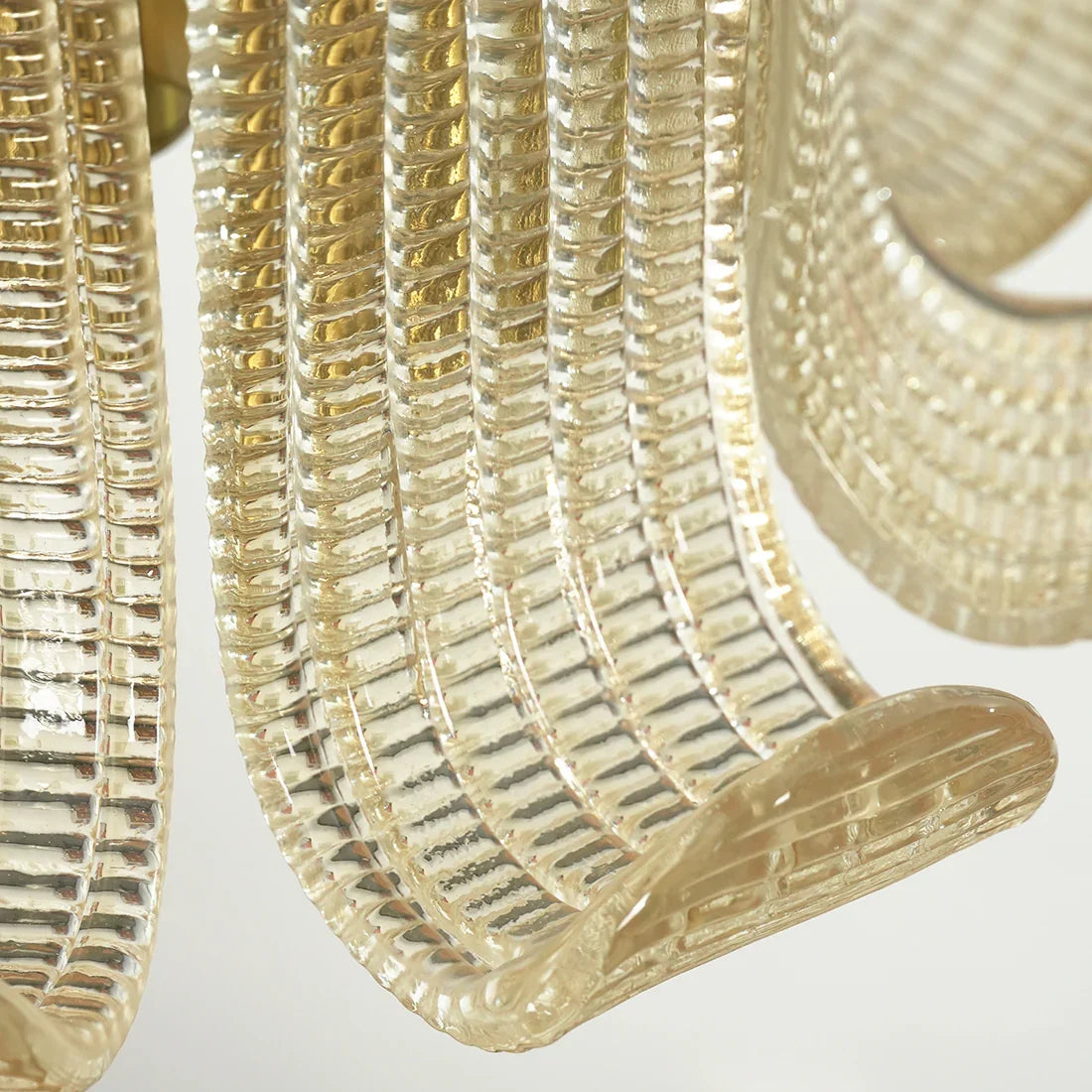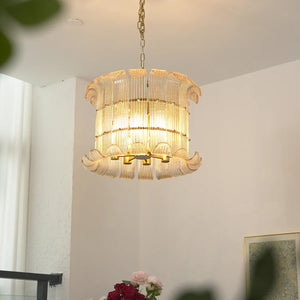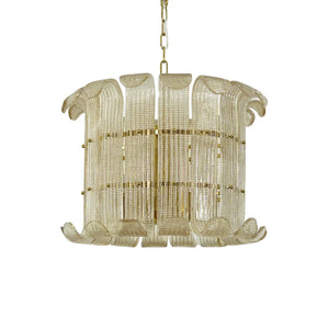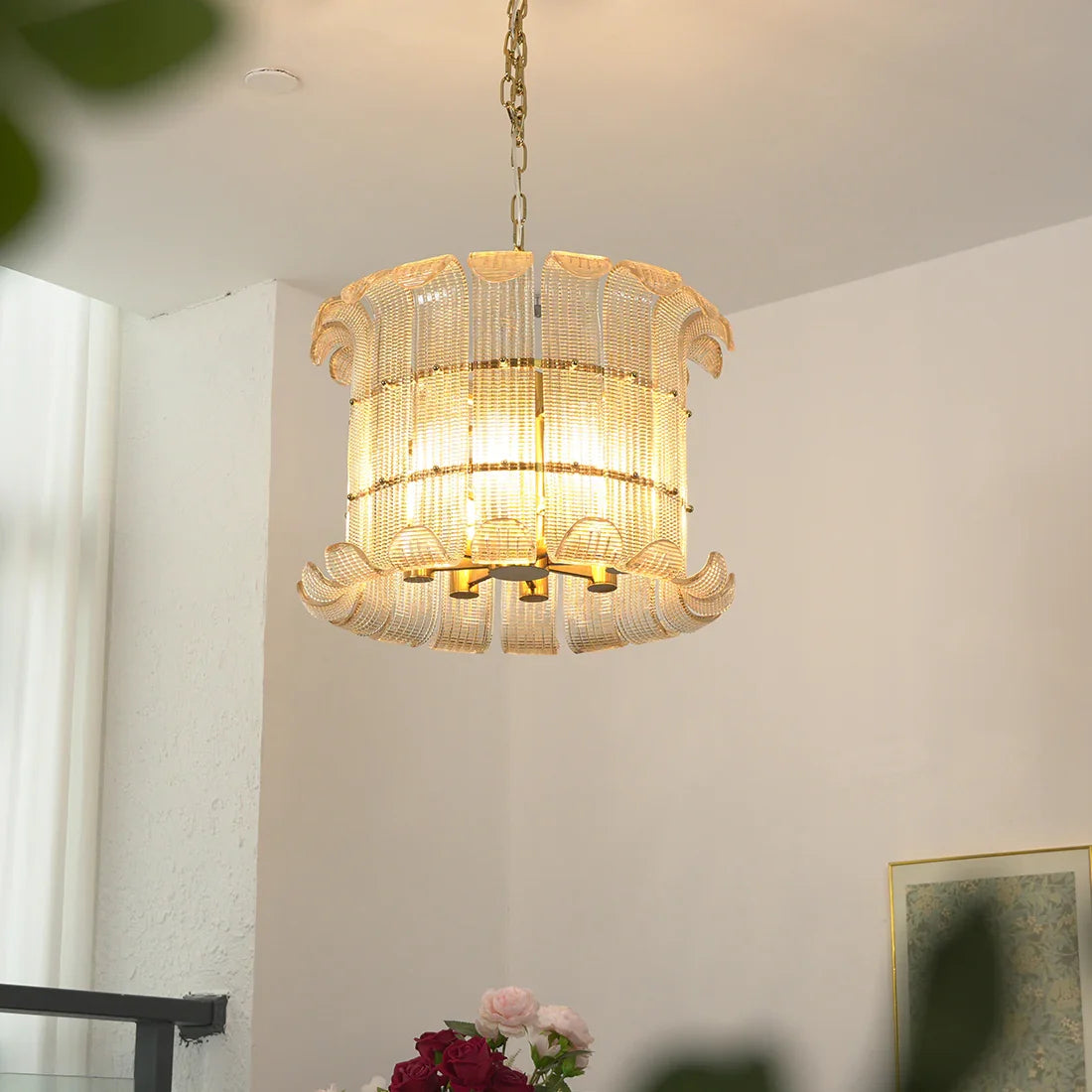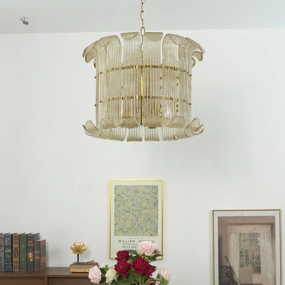 This Curved Glass Slat Drum Chandelier is a masterclass in artisanal lighting, featuring a series of meticulously arranged glass panels characterized by their delicate vertical ribbing. Each individual glass slat is defined by an elegant outward curl at both the top and bottom, mimicking the fluid motion of ribbons and transforming the classic cylindrical drum silhouette into a dynamic work of art. The high-quality glass material not only diffuses light to create a warm, inviting glow but also produces intricate refractive patterns that add a layer of sophisticated ambiance to any room.