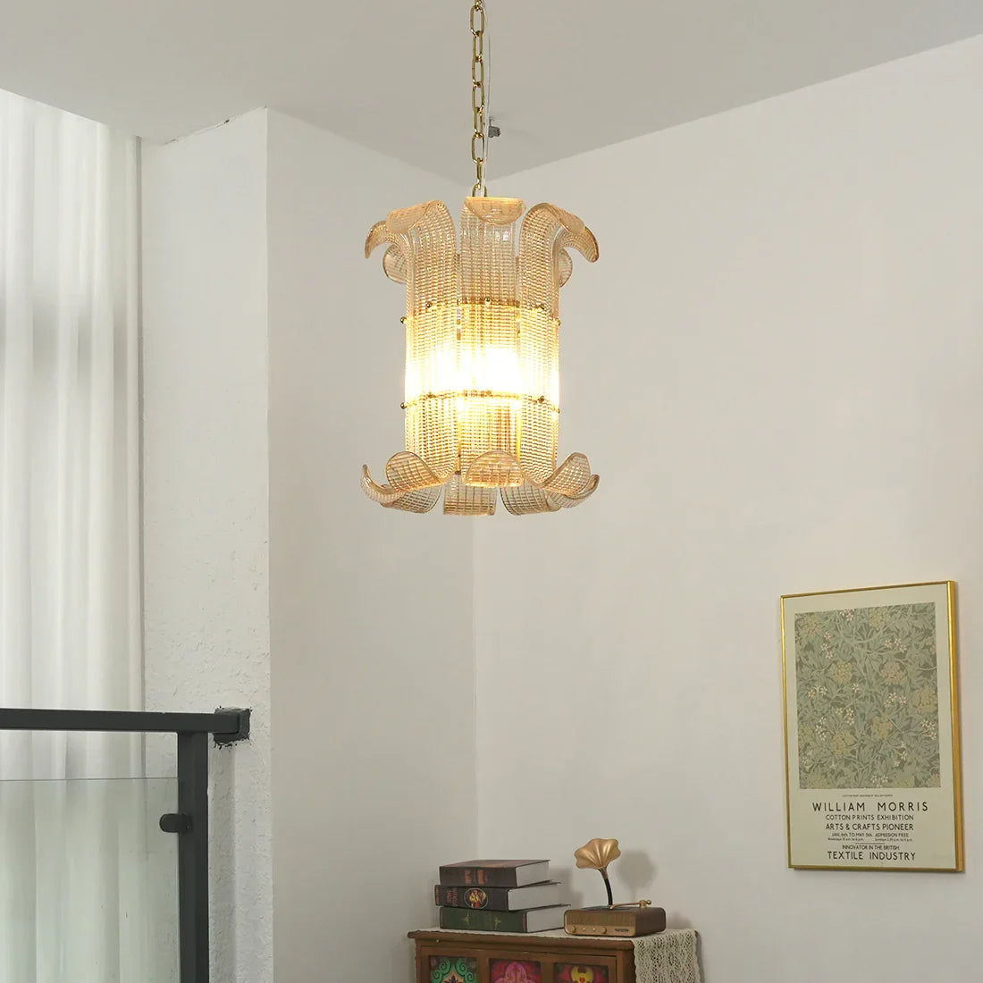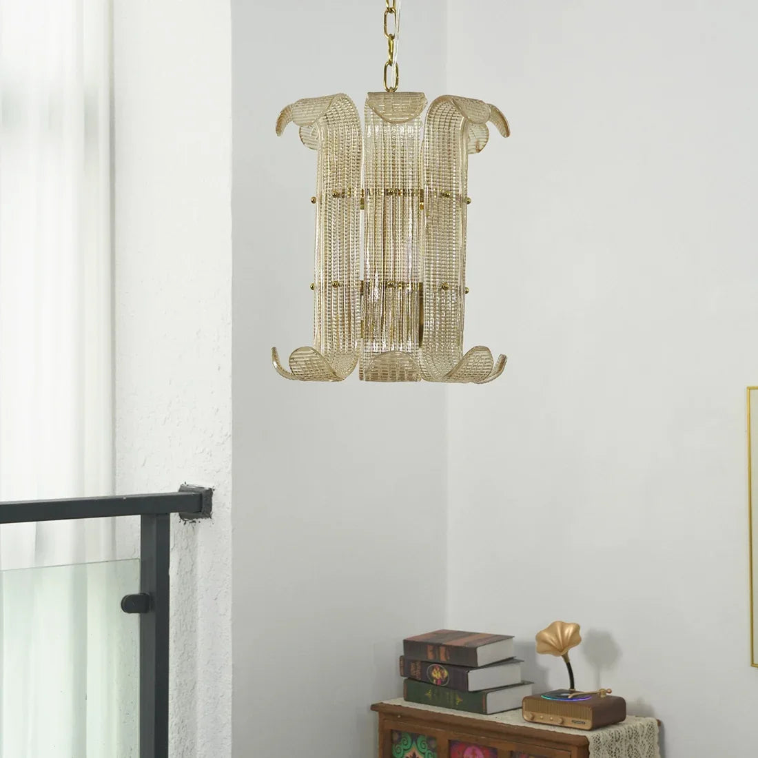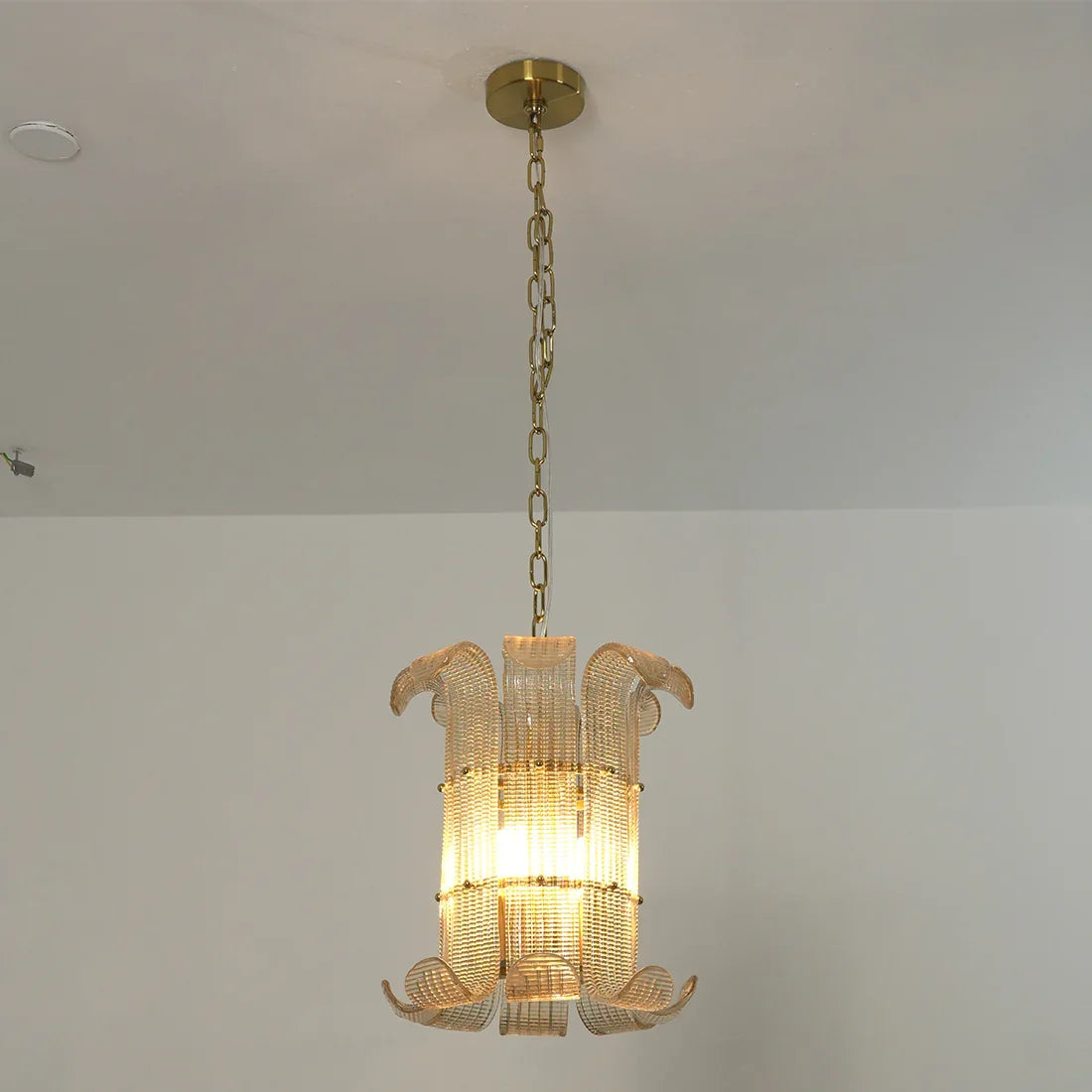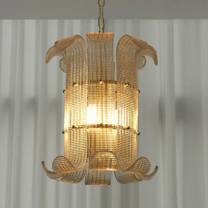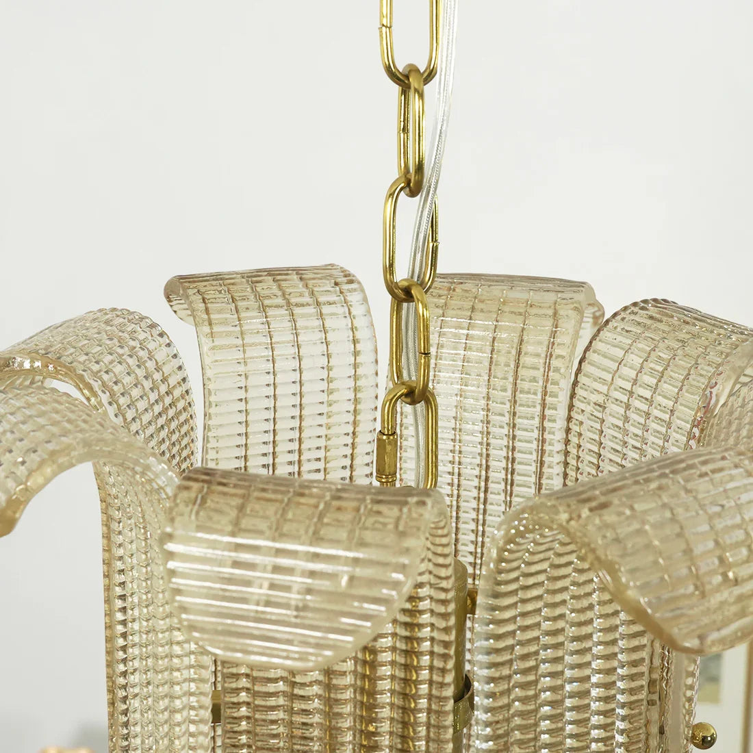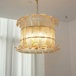 This Curved Glass Slat Drum Chandelier is a masterclass in artisanal lighting, featuring a series of meticulously arranged glass panels characterized by their delicate vertical ribbing. Each individual glass slat is defined by an elegant outward curl at both the top and bottom, mimicking the fluid motion of ribbons and transforming the classic cylindrical drum silhouette into a dynamic work of art. The high-quality glass material not only diffuses light to create a warm, inviting glow but also produces intricate refractive patterns that add a layer of sophisticated ambiance to any room.