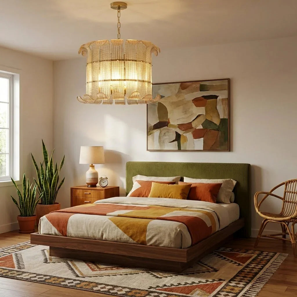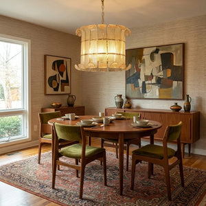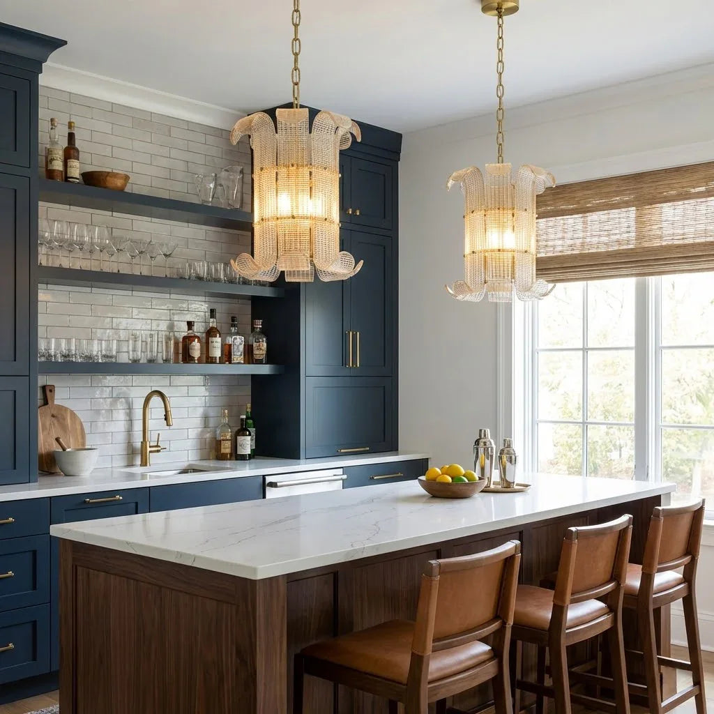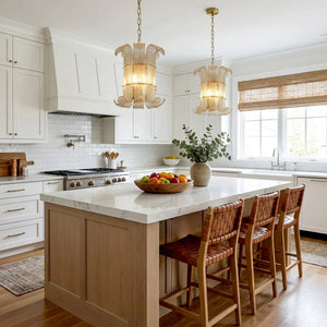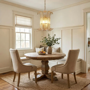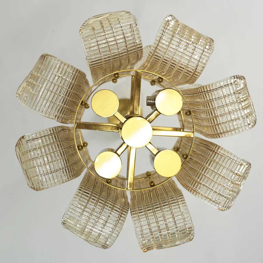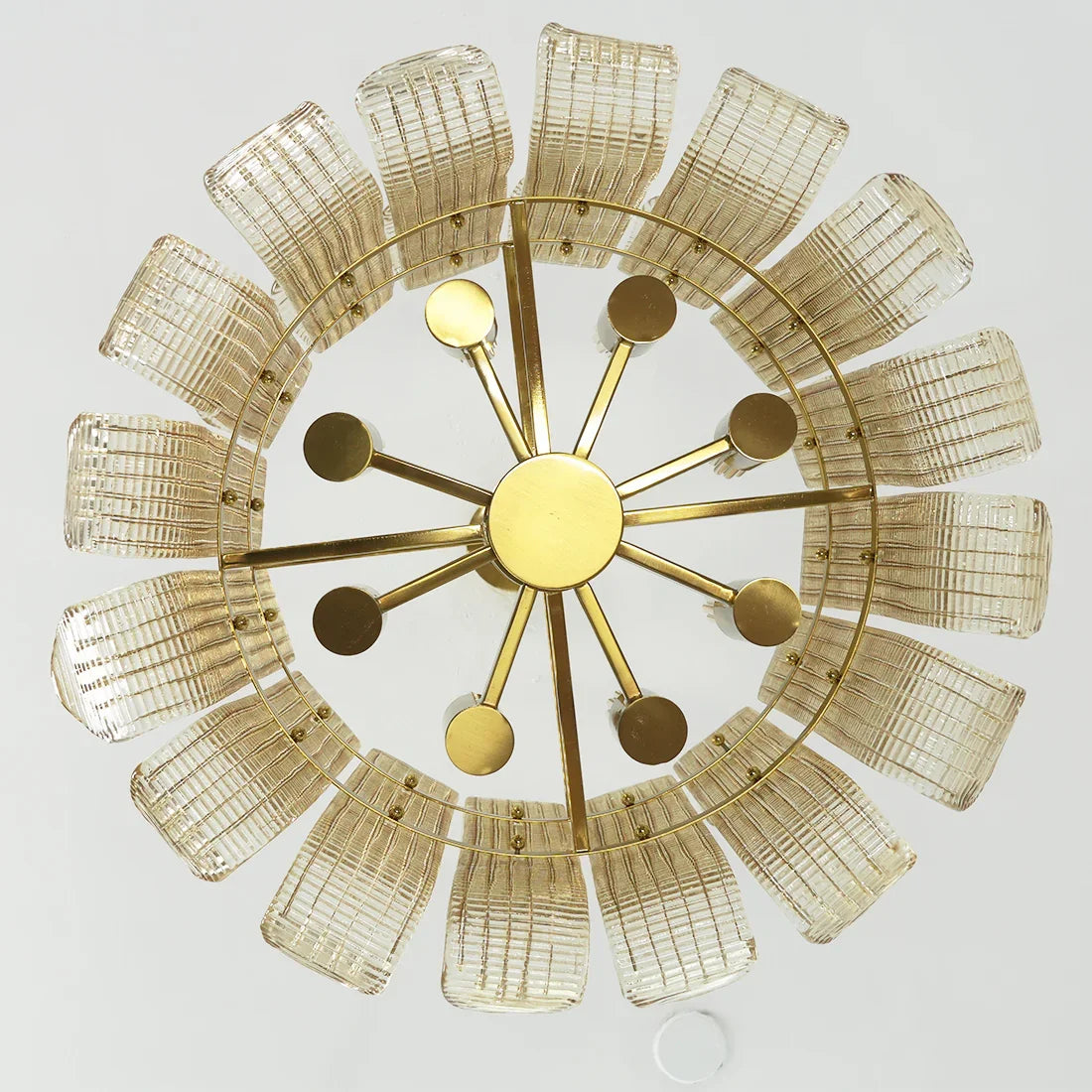This Curved Glass Slat Drum Chandelier is a masterclass in artisanal lighting, featuring a series of meticulously arranged glass panels characterized by their delicate vertical ribbing. Each individual glass slat is defined by an elegant outward curl at both the top and bottom, mimicking the fluid motion of ribbons and transforming the classic cylindrical drum silhouette into a dynamic work of art. The high-quality glass material not only diffuses light to create a warm, inviting glow but also produces intricate refractive patterns that add a layer of sophisticated ambiance to any room.