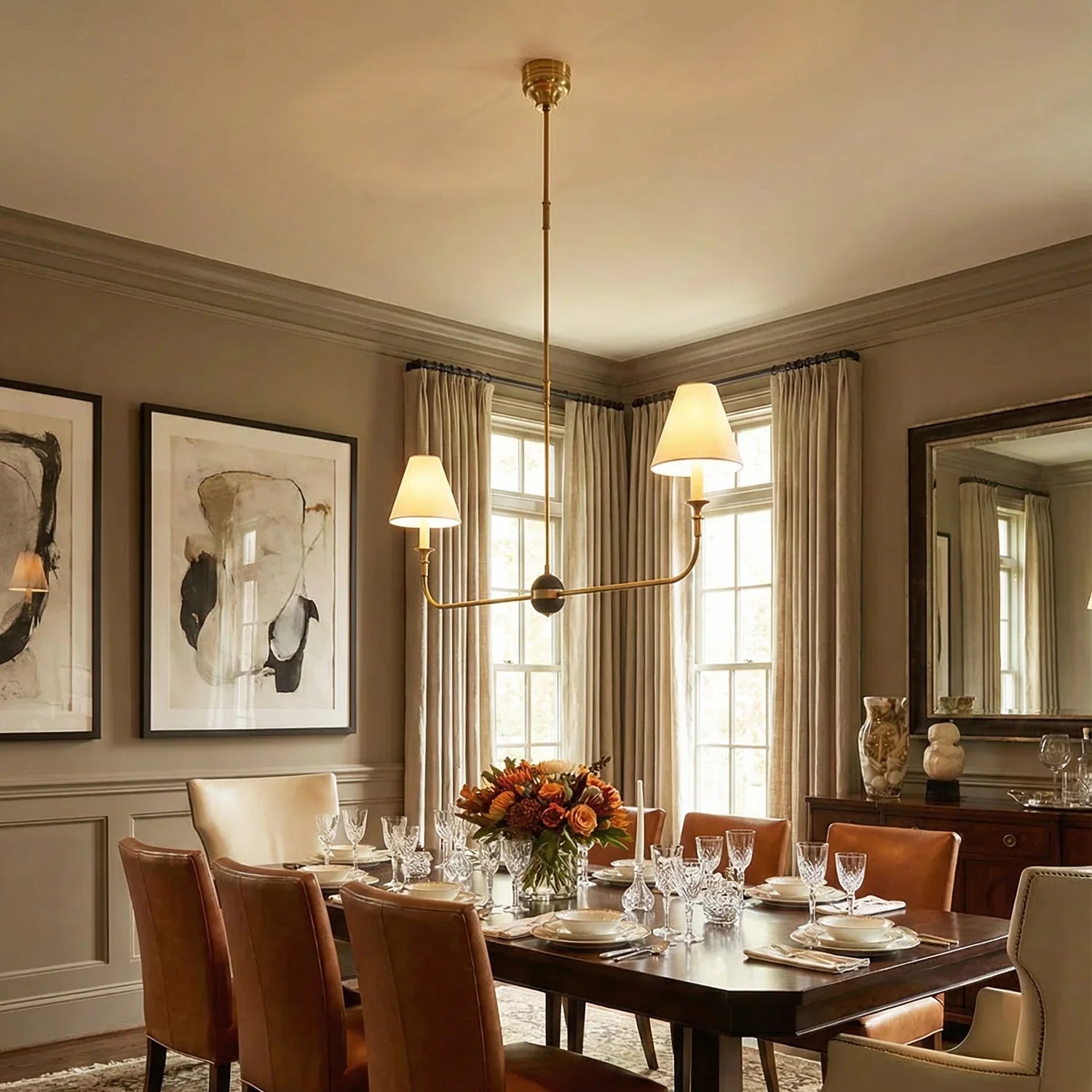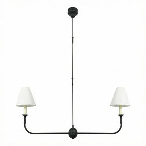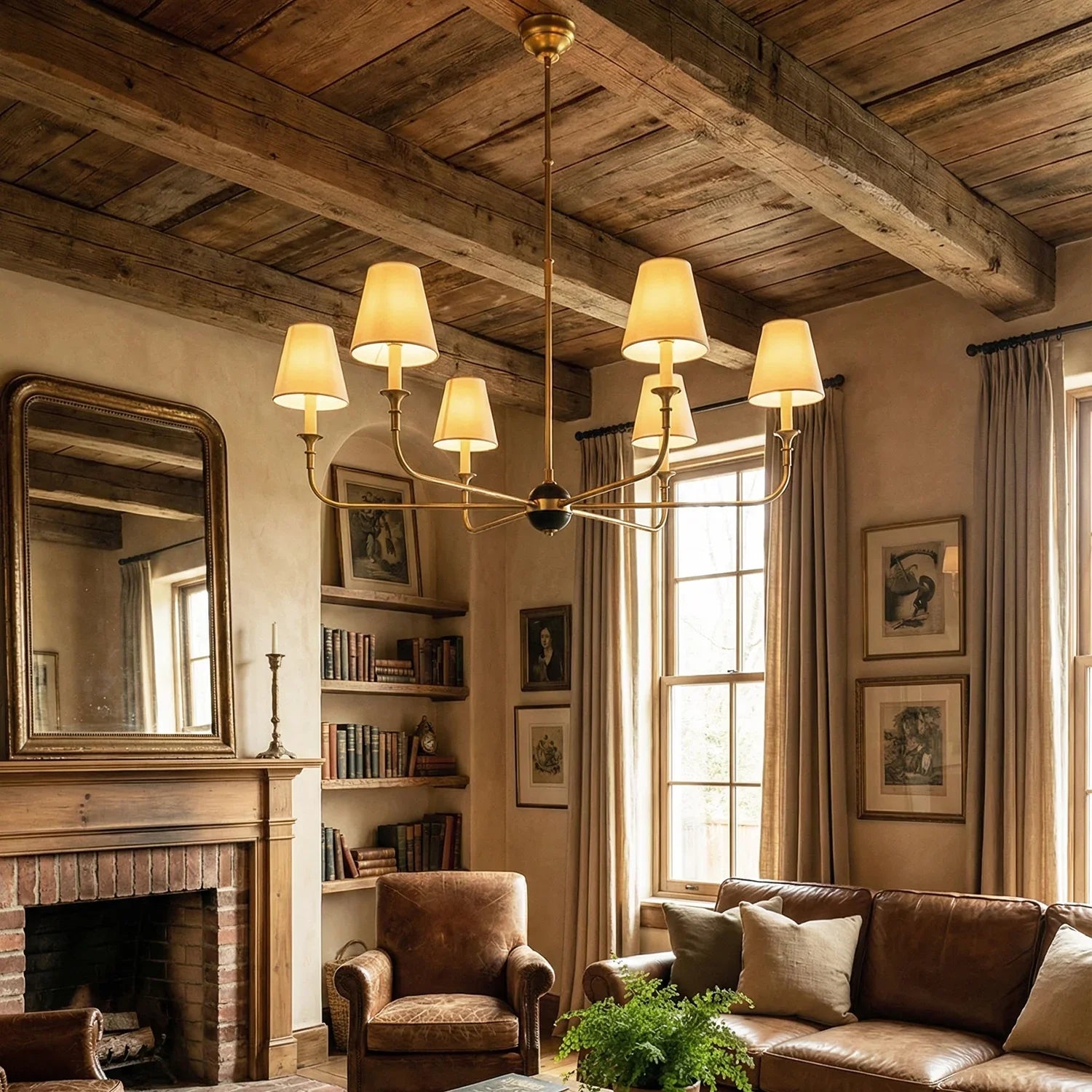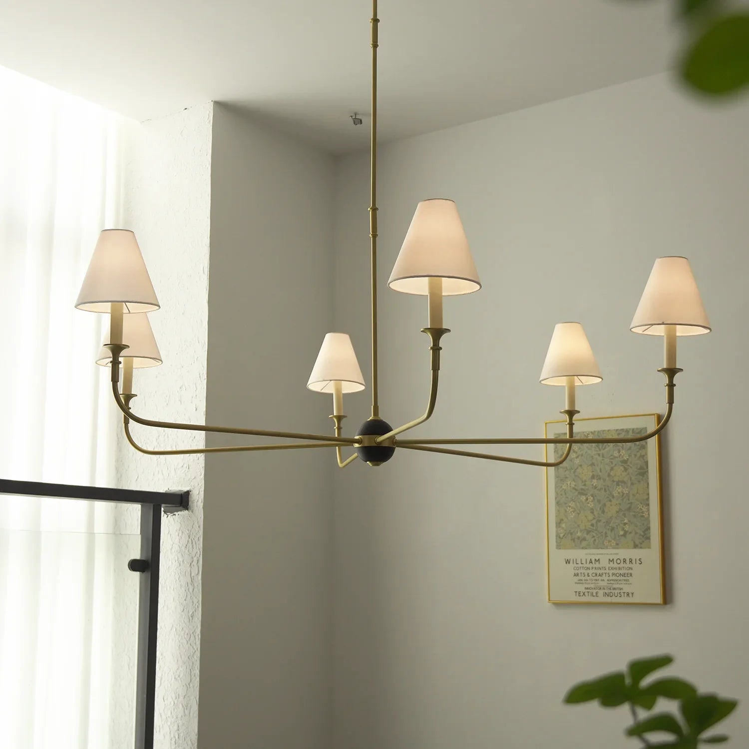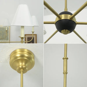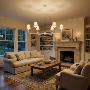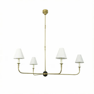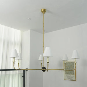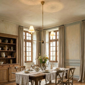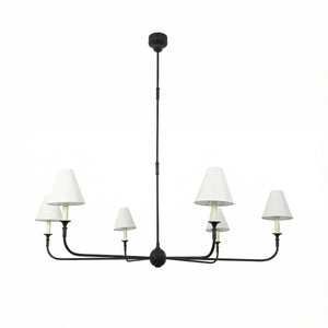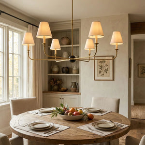 This vintage-inspired copper chandelier perfectly blends the dynamism of mid-century modern design. The slender, extending arms and elegant candlestick design complement each other, balancing classic charm with contemporary aesthetics. The chandelier features iconic conical fabric lampshades that effectively soften the light, creating a warm, delicate, and layered ambiance in your home.