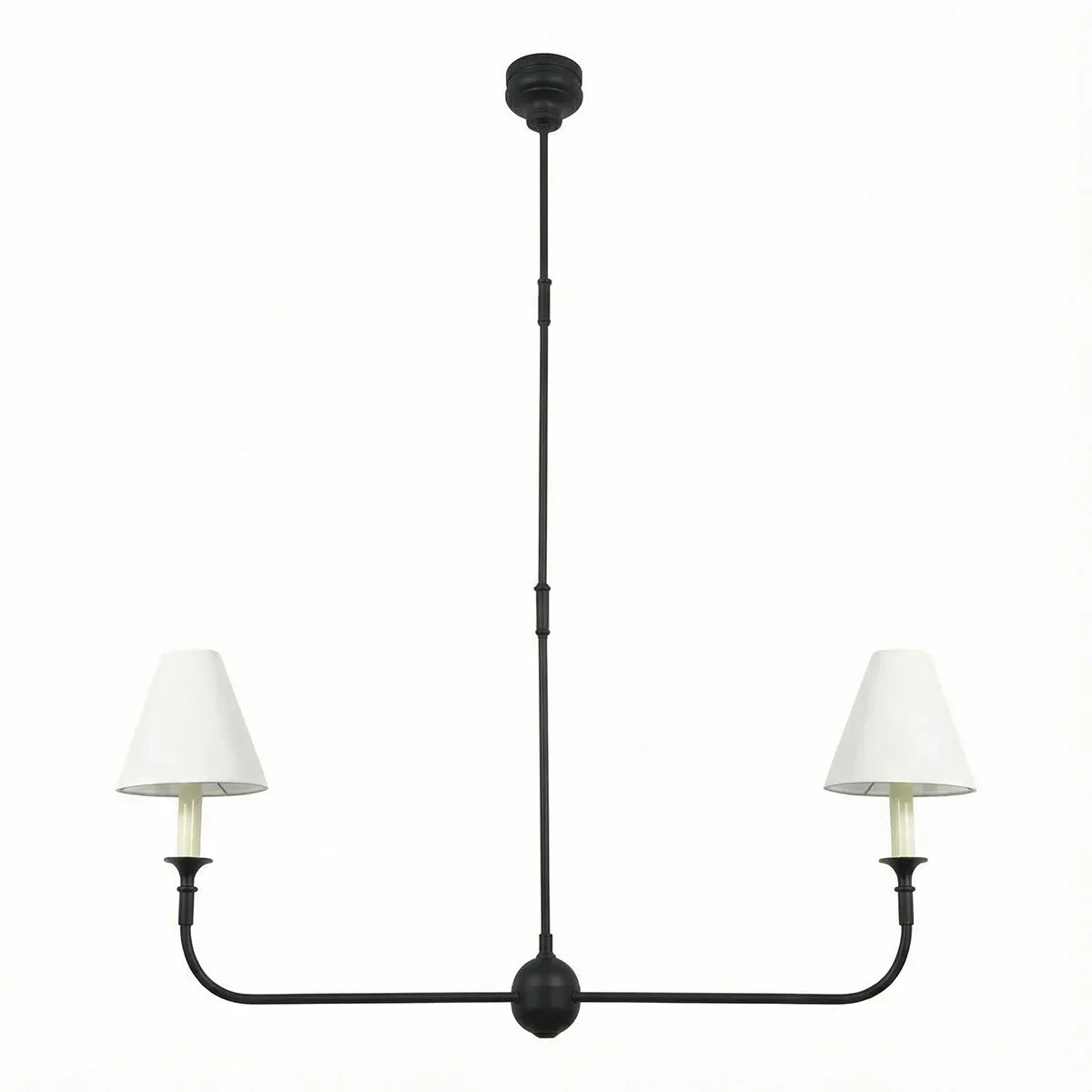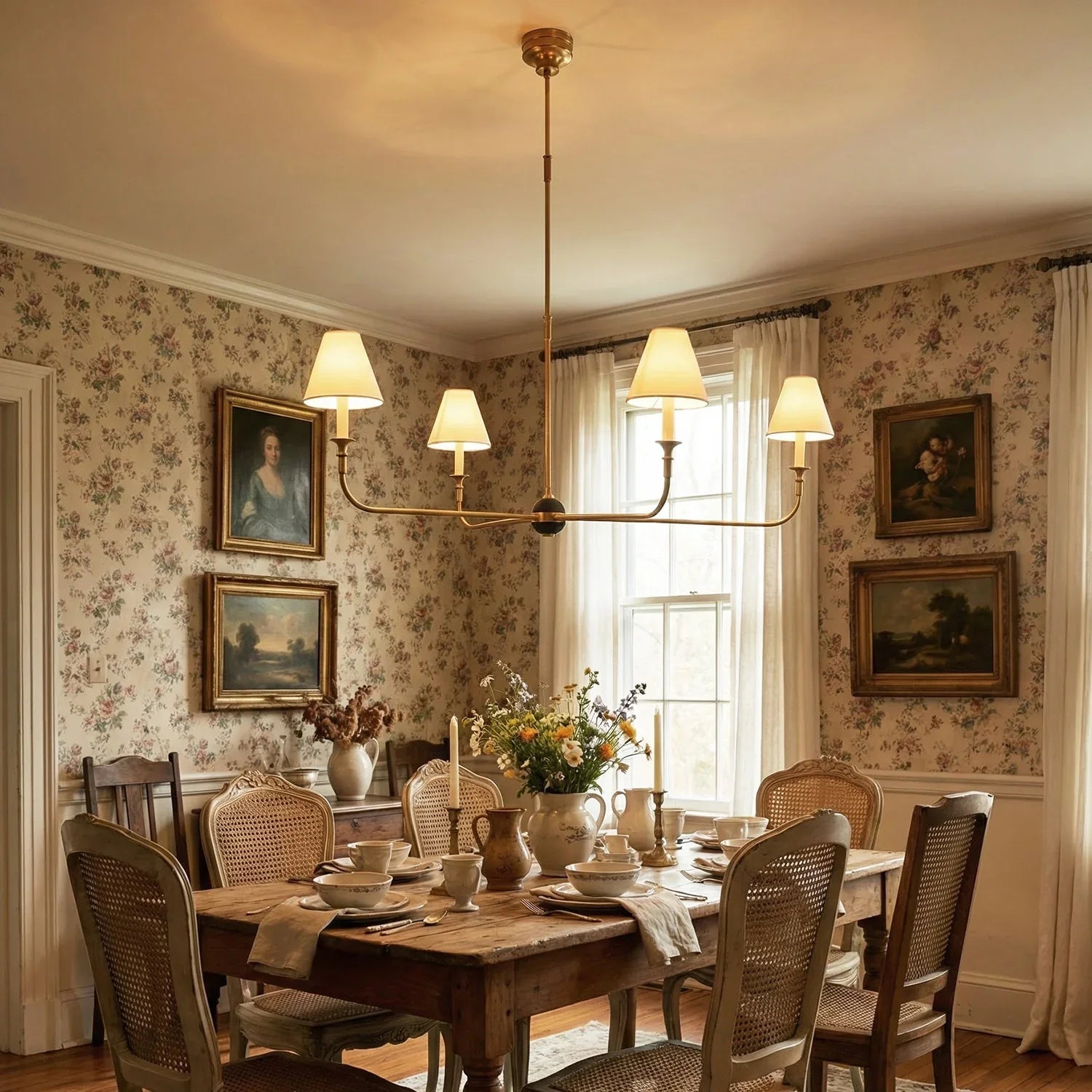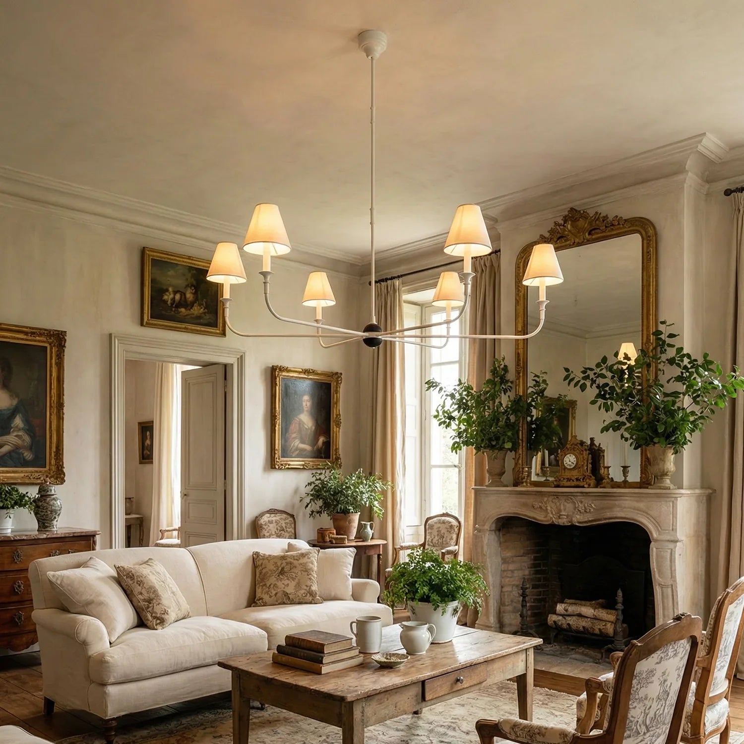 This vintage-inspired copper chandelier perfectly blends the dynamism of mid-century modern design. The slender, extending arms and elegant candlestick design complement each other, balancing classic charm with contemporary aesthetics. The chandelier features iconic conical fabric lampshades that effectively soften the light, creating a warm, delicate, and layered ambiance in your home.
