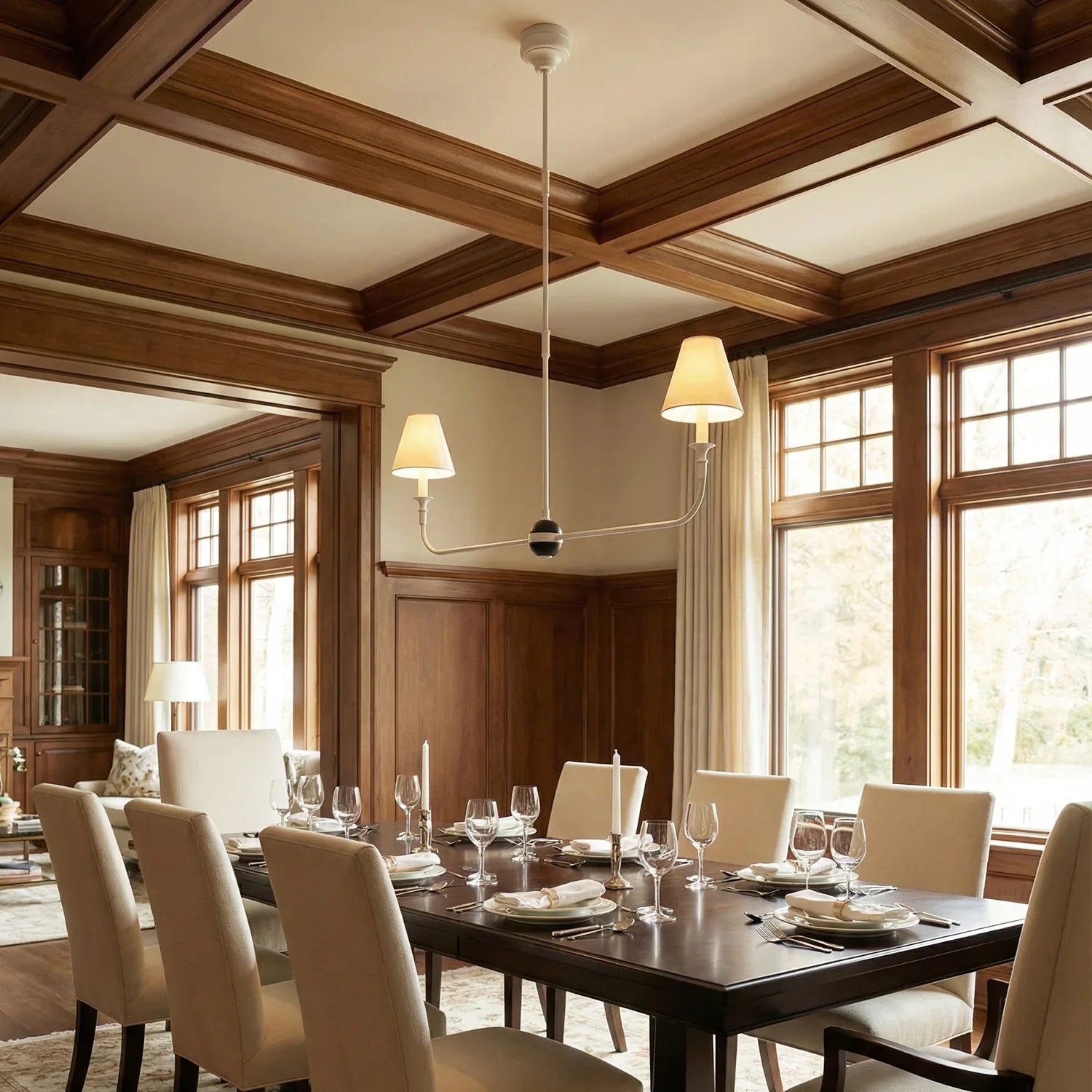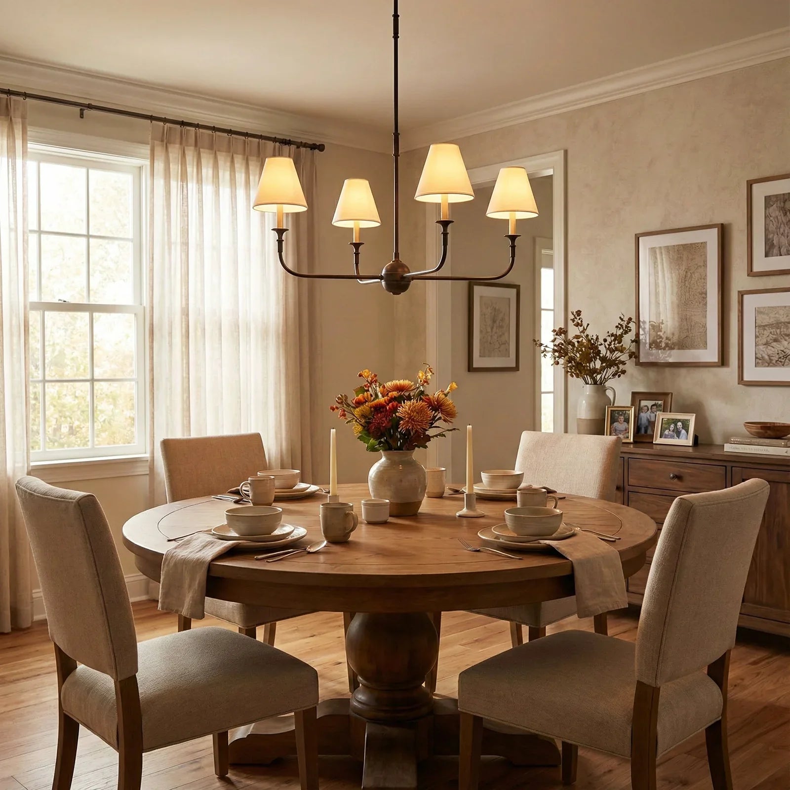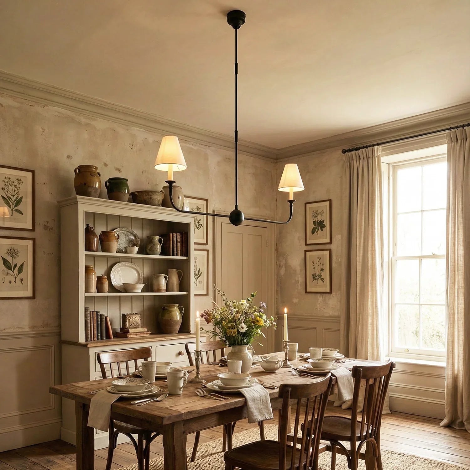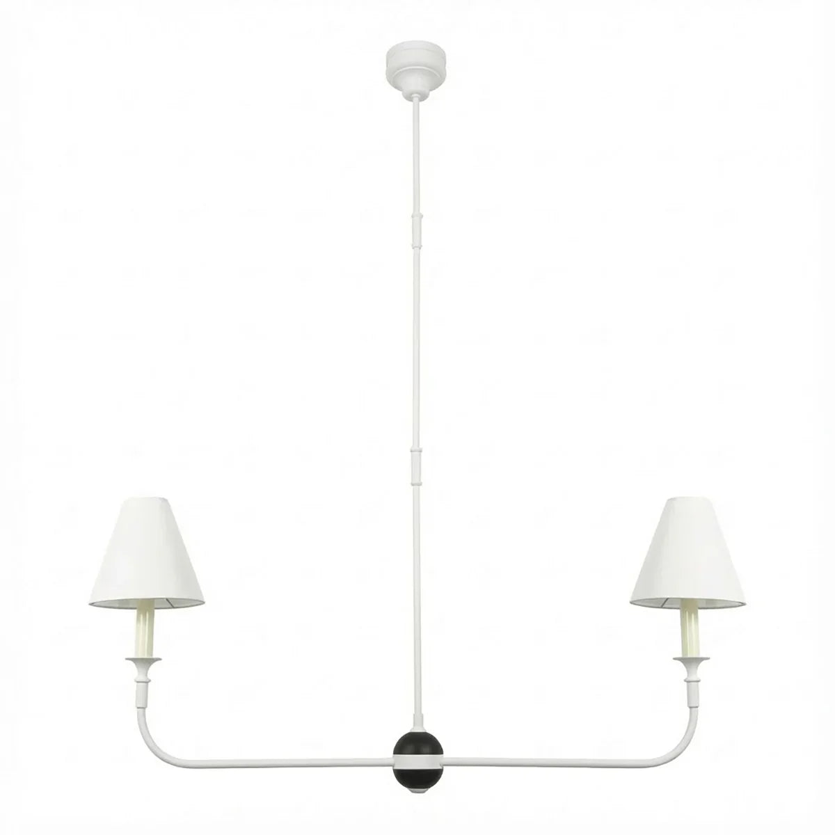 This vintage-inspired copper chandelier perfectly blends the dynamism of mid-century modern design. The slender, extending arms and elegant candlestick design complement each other, balancing classic charm with contemporary aesthetics. The chandelier features iconic conical fabric lampshades that effectively soften the light, creating a warm, delicate, and layered ambiance in your home.